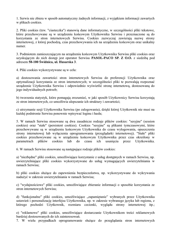 1. Serwis nie zbiera w sposób automatyczny żadnych informacji, z wyjątkiem informacji zawartych w plikach cookies. 2. Pliki cookies (tzw. "ciasteczka") stanowią dane informatyczne, w szczególności pliki tekstowe, które przechowywane są w urządzeniu końcowym Użytkownika Serwisu i przeznaczone są do korzystania ze stron internetowych Serwisu. Cookies zazwyczaj zawierają nazwę strony internetowej, z której pochodzą, czas przechowywania ich na urządzeniu końcowym oraz unikalny numer. 3. Podmiotem zamieszczającym na urządzeniu końcowym Użytkownika Serwisu pliki cookies oraz uzyskującym do nich dostęp jest operator Serwisu PASOL-PACO SP. Z O.O. z siedzibą pod adresem 58-100 Świdnica, ul. Husarska 3. 4. Pliki cookies wykorzystywane są w celu: a) dostosowania zawartości stron internetowych Serwisu do preferencji Użytkownika oraz optymalizacji korzystania ze stron internetowych; w szczególności pliki te pozwalają rozpoznać urządzenie Użytkownika Serwisu i odpowiednio wyświetlić stronę internetową, dostosowaną do jego indywidualnych potrzeb; b) tworzenia statystyk, które pomagają zrozumieć, w jaki sposób Użytkownicy Serwisu korzystają ze stron internetowych, co umożliwia ulepszanie ich struktury i zawartości; c) utrzymanie sesji Użytkownika Serwisu (po zalogowaniu), dzięki której Użytkownik nie musi na każdej podstronie Serwisu ponownie wpisywać loginu i hasła; 5. W ramach Serwisu stosowane są dwa zasadnicze rodzaje plików cookies: "sesyjne" (session cookies) oraz "stałe" (persistent cookies). Cookies "sesyjne" są plikami tymczasowymi, które przechowywane są w urządzeniu końcowym Użytkownika do czasu wylogowania, opuszczenia strony internetowej lub wyłączenia oprogramowania (przeglądarki internetowej). "Stałe" pliki cookies przechowywane są w urządzeniu końcowym Użytkownika przez czas określony w parametrach plików cookies lub do czasu ich usunięcia przez Użytkownika. 6. W ramach Serwisu stosowane są następujące rodzaje plików cookies: a) "niezbędne" pliki cookies, umożliwiające korzystanie z usług dostępnych w ramach Serwisu, np. uwierzytelniające pliki cookies wykorzystywane do usług wymagających uwierzytelniania w ramach Serwisu; b) pliki cookies służące do zapewnienia bezpieczeństwa, np. wykorzystywane do wykrywania nadużyć w zakresie uwierzytelniania w ramach Serwisu; c) "wydajnościowe" pliki cookies, umożliwiające zbieranie informacji o sposobie korzystania ze stron internetowych Serwisu; d) "funkcjonalne” pliki cookies, umożliwiające „zapamiętanie” wybranych przez Użytkownika ustawień i personalizację interfejsu Użytkownika, np. w zakresie wybranego języka lub regionu, z którego pochodzi Użytkownik, rozmiaru czcionki, wyglądu strony internetowej itp.; e) "reklamowe" pliki cookies, umożliwiające dostarczanie Użytkownikom treści reklamowych bardziej dostosowanych do ich zainteresowań. 7. W wielu przypadkach oprogramowanie służące do przeglądania stron internetowych (przeglądarka internetowa) domyślnie dopuszcza przechowywanie plików cookies w urządzeniu końcowym Użytkownika. Użytkownicy Serwisu mogą dokonać w każdym czasie zmiany ustawień dotyczących plików cookies. Ustawienia te mogą zostać zmienione w szczególności w taki sposób, aby blokować automatyczną obsługę plików cookies w ustawieniach przeglądarki internetowej bądź informować o ich każdorazowym zamieszczeniu w urządzeniu Użytkownika Serwisu. Szczegółowe informacje o możliwości i sposobach obsługi plików cookies dostępne są w ustawieniach oprogramowania (przeglądarki internetowej). 8. Operator Serwisu informuje, że ograniczenia stosowania plików cookies mogą wpłynąć na niektóre funkcjonalności dostępne na stronach internetowych Serwisu. 9. Pliki cookies zamieszczane w urządzeniu końcowym Użytkownika Serwisu i wykorzystywane mogą być również przez współpracujących z operatorem Serwisu reklamodawców oraz partnerów.