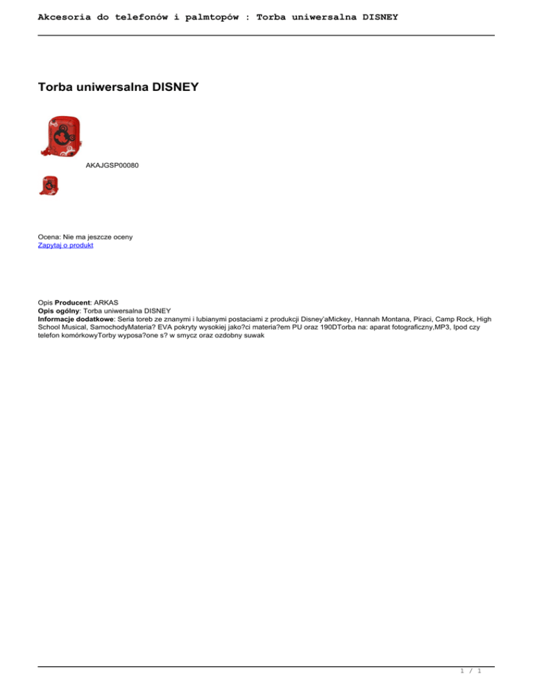 Akcesoria do telefonów i palmtopów : Torba uniwersalna DISNEY Torba uniwersalna DISNEY AKAJGSP00080 Ocena: Nie ma jeszcze oceny Zapytaj o produkt Opis Producent: ARKAS Opis ogólny: Torba uniwersalna DISNEY Informacje dodatkowe: Seria toreb ze znanymi i lubianymi postaciami z produkcji Disney’aMickey, Hannah Montana, Piraci, Camp Rock, High School Musical, SamochodyMateria? EVA pokryty wysokiej jako?ci materia?em PU oraz 190DTorba na: aparat fotograficzny,MP3, Ipod czy telefon komórkowyTorby wyposa?one s? w smycz oraz ozdobny suwak 1 / 1 Powered by TCPDF (www.tcpdf.org)