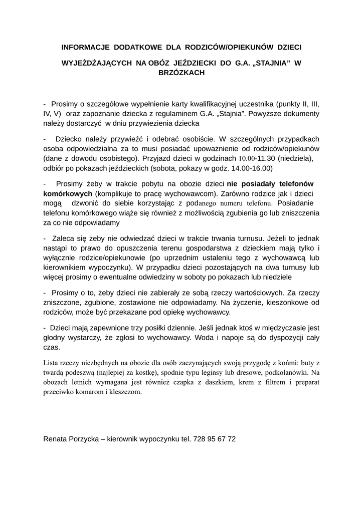 INFORMACJE DODATKOWE DLA RODZICÓW/OPIEKUNÓW DZIECI WYJEŻDŻAJĄCYCH NA OBÓZ JEŹDZIECKI DO G.A. „STAJNIA” W BRZÓZKACH - Prosimy o szczegółowe wypełnienie karty kwalifikacyjnej uczestnika (punkty II, III, IV, V) oraz zapoznanie dziecka z regulaminem G.A. „Stajnia”. Powyższe dokumenty należy dostarczyć w dniu przywiezienia dziecka - Dziecko należy przywieźć i odebrać osobiście. W szczególnych przypadkach osoba odpowiedzialna za to musi posiadać upoważnienie od rodziców/opiekunów (dane z dowodu osobistego). Przyjazd dzieci w godzinach 10.00-11.30 (niedziela), odbiór po pokazach jeździeckich (sobota, pokazy w godz. 14.00-16.00) - Prosimy żeby w trakcie pobytu na obozie dzieci nie posiadały telefonów komórkowych (komplikuje to pracę wychowawcom). Zarówno rodzice jak i dzieci mogą dzwonić do siebie korzystając z podanego numeru telefonu. Posiadanie telefonu komórkowego wiąże się również z możliwością zgubienia go lub zniszczenia za co nie odpowiadamy - Zaleca się żeby nie odwiedzać dzieci w trakcie trwania turnusu. Jeżeli to jednak nastąpi to prawo do opuszczenia terenu gospodarstwa z dzieckiem mają tylko i wyłącznie rodzice/opiekunowie (po uprzednim ustaleniu tego z wychowawcą lub kierownikiem wypoczynku). W przypadku dzieci pozostających na dwa turnusy lub więcej prosimy o ewentualne odwiedziny w soboty po pokazach lub niedziele - Prosimy o to, żeby dzieci nie zabierały ze sobą rzeczy wartościowych. Za rzeczy zniszczone, zgubione, zostawione nie odpowiadamy. Na życzenie, kieszonkowe od rodziców, może być przekazane pod opiekę wychowawcy. - Dzieci mają zapewnione trzy posiłki dziennie. Jeśli jednak ktoś w międzyczasie jest głodny wystarczy, że zgłosi to wychowawcy. Woda i napoje są do dyspozycji cały czas. Lista rzeczy niezbędnych na obozie dla osób zaczynających swoją przygodę z końmi: buty z twardą podeszwą (najlepiej za kostkę), spodnie typu leginsy lub dresowe, podkolanówki. Na obozach letnich wymagana jest również czapka z daszkiem, krem z filtrem i preparat przeciwko komarom i kleszczom. Renata Porzycka – kierownik wypoczynku tel. 728 95 67 72