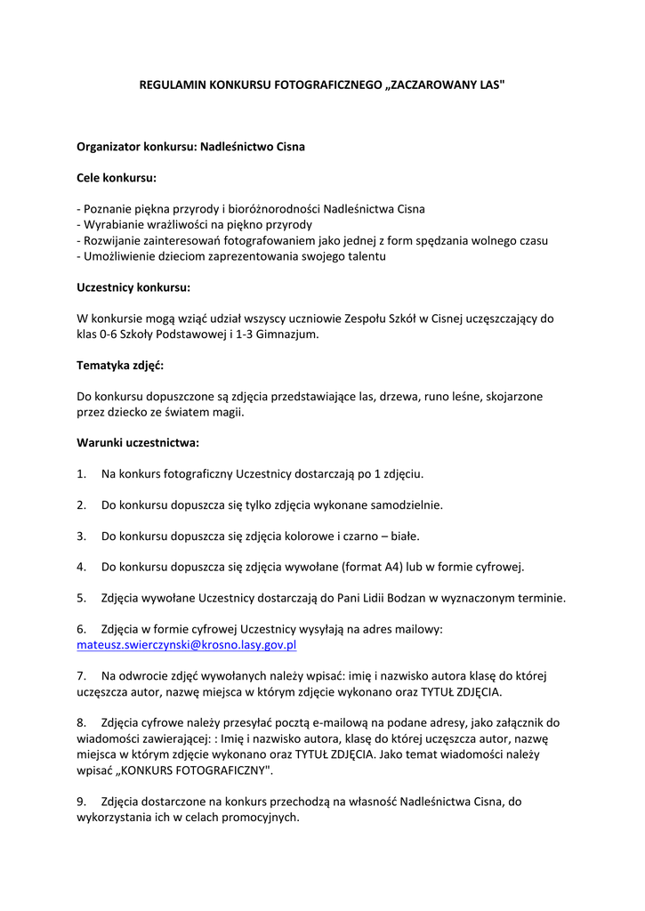 REGULAMIN KONKURSU FOTOGRAFICZNEGO „ZACZAROWANY LAS" Organizator konkursu: Nadleśnictwo Cisna Cele konkursu: - Poznanie piękna przyrody i bioróżnorodności Nadleśnictwa Cisna - Wyrabianie wrażliwości na piękno przyrody - Rozwijanie zainteresowań fotografowaniem jako jednej z form spędzania wolnego czasu - Umożliwienie dzieciom zaprezentowania swojego talentu Uczestnicy konkursu: W konkursie mogą wziąć udział wszyscy uczniowie Zespołu Szkół w Cisnej uczęszczający do klas 0-6 Szkoły Podstawowej i 1-3 Gimnazjum. Tematyka zdjęć: Do konkursu dopuszczone są zdjęcia przedstawiające las, drzewa, runo leśne, skojarzone przez dziecko ze światem magii. Warunki uczestnictwa: 1. Na konkurs fotograficzny Uczestnicy dostarczają po 1 zdjęciu. 2. Do konkursu dopuszcza się tylko zdjęcia wykonane samodzielnie. 3. Do konkursu dopuszcza się zdjęcia kolorowe i czarno – białe. 4. Do konkursu dopuszcza się zdjęcia wywołane (format A4) lub w formie cyfrowej. 5. Zdjęcia wywołane Uczestnicy dostarczają do Pani Lidii Bodzan w wyznaczonym terminie. 6. Zdjęcia w formie cyfrowej Uczestnicy wysyłają na adres mailowy: [email protected] 7. Na odwrocie zdjęć wywołanych należy wpisać: imię i nazwisko autora klasę do której uczęszcza autor, nazwę miejsca w którym zdjęcie wykonano oraz TYTUŁ ZDJĘCIA. 8. Zdjęcia cyfrowe należy przesyłać pocztą e-mailową na podane adresy, jako załącznik do wiadomości zawierającej: : Imię i nazwisko autora, klasę do której uczęszcza autor, nazwę miejsca w którym zdjęcie wykonano oraz TYTUŁ ZDJĘCIA. Jako temat wiadomości należy wpisać „KONKURS FOTOGRAFICZNY". 9. Zdjęcia dostarczone na konkurs przechodzą na własność Nadleśnictwa Cisna, do wykorzystania ich w celach promocyjnych. 10. W przypadku, gdy na zdjęciu znajduje się osoba, należy na odwrocie zdjęcia lub w wiadomości e-mail dopisać: Osoby widniejące na fotografii wyrażają zgodę na ich publikowanie oraz publiczną ekspozycję" 11. Organizator zastrzega sobie prawo odrzucenia zdjęć na podstawie niezgodności z warunkami konkursu. Nagrody: W Konkursie przewidziano atrakcyjne nagrody rzeczowe dla uczestników, którzy zajmą pierwsze trzy miejsca w kategoriach: 1. Klasy 0-3 Szkoły Podstawowej 2. Klasy 4 - 6 Szkoły Podstawowej 3. Klasy 1 – 3 Gimnazjum W przypadku wystąpienia konieczności nagrodzenia większej ilości Uczestników przewiduje się możliwość ustanowienia wyróżnień. Wszyscy Uczestnicy konkursu otrzymają drobne upominki. Termin składani prac: Zdjęcia należy dostarczyć do dnia 28.11.2014 r. do godziny 1500 do Pani Lidii Bodzan lub wysłać na podany adres e-mail. Skład Komisji Oceniającej: W skład Komisji wchodzą: przedstawiciele Nadleśnictwa Cisna i Zespołu Szkół w Cisnej Rozstrzygnięcie konkursu: 1. Spotkanie Komisji Oceniającej odbędzie się w dniu 05.12.2014 r. 2. O uroczystym podsumowaniu konkursu i wręczeniu nagród Uczestnicy konkursu zostaną poinformowani niezwłocznie po wyłonieniu przez Komisję zwycięzców. 3. Wystawa prac konkursowych zostanie zorganizowana w Zespole Szkół w Cisnej, a następnie w budynku biurowym Nadleśnictwa Cisna. Regulamin konkursu dostępny jest: 1. Na stronie internetowej Nadleśnictwa Cisna: www.cisna.krosno.lasy.gov.pl 2. Na profilu facebook Nadleśnictwa Cisna: www.facebook.com/NadlesnictwoCisna 3. Wywieszony na tablicy ogłoszeń w Zespole Szkół w Cisnej. 4. U Dyrektora Zespołu Szkół w Cisnej oraz u Pani Lidii Bodzan.