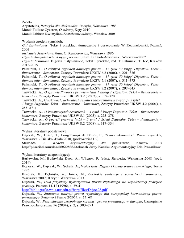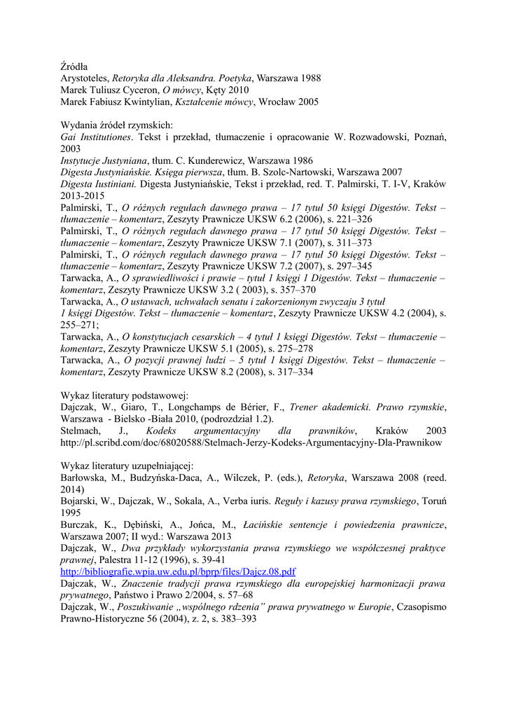 Źródła Arystoteles, Retoryka dla Aleksandra. Poetyka, Warszawa 1988 Marek Tuliusz Cyceron, O mówcy, Kęty 2010 Marek Fabiusz Kwintylian, Kształcenie mówcy, Wrocław 2005 Wydania źródeł rzymskich: Gai Institutiones. Tekst i przekład, tłumaczenie i opracowanie W. Rozwadowski, Poznań, 2003 Instytucje Justyniana, tłum. C. Kunderewicz, Warszawa 1986 Digesta Justyniańskie. Księga pierwsza, tłum. B. Szolc-Nartowski, Warszawa 2007 Digesta Iustiniani. Digesta Justyniańskie, Tekst i przekład, red. T. Palmirski, T. I-V, Kraków 2013-2015 Palmirski, T., O różnych regułach dawnego prawa – 17 tytuł 50 księgi Digestów. Tekst – tłumaczenie – komentarz, Zeszyty Prawnicze UKSW 6.2 (2006), s. 221–326 Palmirski, T., O różnych regułach dawnego prawa – 17 tytuł 50 księgi Digestów. Tekst – tłumaczenie – komentarz, Zeszyty Prawnicze UKSW 7.1 (2007), s. 311–373 Palmirski, T., O różnych regułach dawnego prawa – 17 tytuł 50 księgi Digestów. Tekst – tłumaczenie – komentarz, Zeszyty Prawnicze UKSW 7.2 (2007), s. 297–345 Tarwacka, A., O sprawiedliwości i prawie – tytuł 1 księgi 1 Digestów. Tekst – tłumaczenie – komentarz, Zeszyty Prawnicze UKSW 3.2 ( 2003), s. 357–370 Tarwacka, A., O ustawach, uchwałach senatu i zakorzenionym zwyczaju 3 tytuł 1 księgi Digestów. Tekst – tłumaczenie – komentarz, Zeszyty Prawnicze UKSW 4.2 (2004), s. 255–271; Tarwacka, A., O konstytucjach cesarskich – 4 tytuł 1 księgi Digestów. Tekst – tłumaczenie – komentarz, Zeszyty Prawnicze UKSW 5.1 (2005), s. 275–278 Tarwacka, A., O pozycji prawnej ludzi – 5 tytuł 1 księgi Digestów. Tekst – tłumaczenie – komentarz, Zeszyty Prawnicze UKSW 8.2 (2008), s. 317–334 Wykaz literatury podstawowej: Dajczak, W., Giaro, T., Longchamps de Bérier, F., Trener akademicki. Prawo rzymskie, Warszawa - Bielsko -Biała 2010, (podrozdział 1.2). Stelmach, J., Kodeks argumentacyjny dla prawników, Kraków 2003 http://pl.scribd.com/doc/68020588/Stelmach-Jerzy-Kodeks-Argumentacyjny-Dla-Prawnikow Wykaz literatury uzupełniającej: Barłowska, M., Budzyńska-Daca, A., Wilczek, P. (eds.), Retoryka, Warszawa 2008 (reed. 2014) Bojarski, W., Dajczak, W., Sokala, A., Verba iuris. Reguły i kazusy prawa rzymskiego, Toruń 1995 Burczak, K., Dębiński, A., Jońca, M., Łacińskie sentencje i powiedzenia prawnicze, Warszawa 2007; II wyd.: Warszawa 2013 Dajczak, W., Dwa przykłady wykorzystania prawa rzymskiego we współczesnej praktyce prawnej, Palestra 11-12 (1996), s. 39-41 http://bibliografie.wpia.uw.edu.pl/bprp/files/Dajcz.08.pdf Dajczak, W., Znaczenie tradycji prawa rzymskiego dla europejskiej harmonizacji prawa prywatnego, Państwo i Prawo 2/2004, s. 57–68 Dajczak, W., Poszukiwanie „wspólnego rdzenia” prawa prywatnego w Europie, Czasopismo Prawno-Historyczne 56 (2004), z. 2, s. 383–393 Dajczak, W., Problem „ponadczasowości“ zasad prawa rzymskiego. Uwagi w dyskusji o „nowej europejskiej kulturze prawnej”, Zeszyty Prawnicze UKSW 5.2 (2005), s. 7–22 http://bibliografie.wpia.uw.edu.pl/bprp/files/Dajcz.23.pdf Dyka, Z., Kompetencje retoryczne prawnika, Palestra 9-10/2008 http://www.palestra.pl Jońca M., Prawo rzymskie. Marginalia, Lublin 20152 Knuetel, R. , Ius commune und Roemisches Recht vor Gerichten der Europaeischen Union, Juristen Schulung, 36 (1996), s. 768-778 Kochan, M., Pojedynek na słowa. Techniki erystyczne w publicznych sporach, Kraków 2005 Kohout, J., Retoryka. Mowa zjednuje ludzi, wyd. IV, Gliwice 2006 (fragment: http://www.structum.pl/czytelnia/Retoryka-Mowa-zjednuje-ludzi-Wydanie-IV.pdf) Korolko, M., Sztuka retoryki. Przewodnik encyklopedyczny, Warszawa 1990 Korolko, M., Retoryka i Erystyka dla prawników, Warszawa 2001 Kuryłowicz, M., Słownik łacińskich terminów, zwrotów i sentencji prawniczych, Lublin 1993 Marzęda, W., Retoryka jako forma krytycyzmu, Czasopismo Filozoficzne nr 2 – lipiec 2007, http://www.czasopismofilozoficzne.us.edu.pl/pliki/nr_2/retoryka_jako_forma_krytycyzmu.pd f Palmirski, T., Paremie i maksymy rzymskiego prawa prywatnego, Kraków 1995 Pieńkos J., Praecepta iuris. Łacina dla prawników. Terminy, paremie, wyrażenia w porządku systematycznym, Warszawa 1999 Schopenhauer, A., Erystyka, czyli sztuka prowadzenia sporów (Die eristische Dialektyk), tłum. B.i Ł. Konorscy, Gliwice 2007 Wiewiorowski J., Zakaz retroakcji – historyczny klucz o intertemporalności, [w:] J. Mikołajewicz (red.), Problematyka intertemporalna w prawie. Zagadnienia podstawowe. Rozstrzygnięcia intertemporalne. Geneza i funkcje, Warszawa 2015, s. 19-41 Łacińskie paremie w europejskiej kulturze prawnej i orzecznictwie sądów polskich, red. W. Wołodkiewicz, J. Krzynówek, Warszawa 2001 Wołodkiewicz, W. (red.), Regulae Iuris. Łacińskie inskrypcje na kolumnach Sądu Najwyższego Rzeczypospolitej Polskiej, Warszawa 2006 Strony internetowe: http://www.monitorprawniczy.pl/index.php?mod=m_aktualnosci&cid=21&id=2095 http://www.prawnik.pl/paremie-lacinskie http://www.law.uj.edu.pl/users/kprz/index.php?option=com_content&task=view&id=8 http://www.zielona-gora.po.gov.pl/index.php?id=180 http://www.traktat.pl/pl_paremie-lacinskie-i-slownik,56.html http://www.elzab.com.pl/~michalp/aforyzmy/aforyzmy_lacinskie.html http://www.brocardi.it/ http://www.silviamota.com.br/direito/diversos/brocardos.htm http://www.studiomarino.com/studiomarino_terminilatinigiuridici.htm http://books.google.pl/books? id=YOxTT1WymMQC&printsec=frontcover&hl=pl#v=onepage&q&f=false http://rhetoric.eserver.org/aristotle/ http://classics.mit.edu/Aristotle/rhetoric.html http://ebooks.adelaide.edu.au/a/aristotle/a8rh/index.html http://archive.org/details/cicerodeoratore01ciceuoft http://www.utexas.edu/research/memoria/Cicero.html http://pages.pomona.edu/~cmc24747/sources/cic_web/de_or_1.htm http://pages.pomona.edu/~cmc24747/sources/cic_web/de_or_2.htm http://onlinebooks.library.upenn.edu/webbin/book/lookupname?key=Cicero%2C%20Marcus %20Tullius http://penelope.uchicag