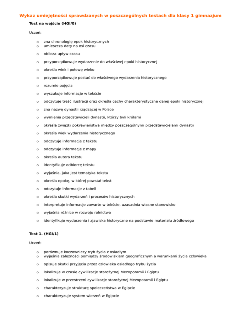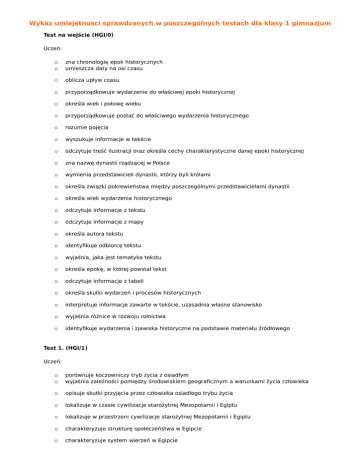 Wykaz umiejętności sprawdzanych w poszczególnych testach dla klasy 1 gimnazjum Test na wejście (HGI/0) Uczeń: o o zna chronologię epok historycznych umieszcza daty na osi czasu o oblicza upływ czasu o przyporządkowuje wydarzenie do właściwej epoki historycznej o określa wiek i połowę wieku o przyporządkowuje postać do właściwego wydarzenia historycznego o rozumie pojęcia o wyszukuje informacje w tekście o odczytuje treść ilustracji oraz określa cechy charakterystyczne danej epoki historycznej o zna nazwę dynastii rządzącej w Polsce o wymienia przedstawicieli dynastii, którzy byli królami o określa związki pokrewieństwa między poszczególnymi przedstawicielami dynastii o określa wiek wydarzenia historycznego o odczytuje informacje z tekstu o odczytuje informacje z mapy o określa autora tekstu o identyfikuje odbiorcę tekstu o wyjaśnia, jaka jest tematyka tekstu o określa epokę, w której powstał tekst o odczytuje informacje z tabeli o określa skutki wydarzeń i procesów historycznych o interpretuje informacje zawarte w tekście, uzasadnia własne stanowisko o wyjaśnia różnice w rozwoju rolnictwa o identyfikuje wydarzenia i zjawiska historyczne na podstawie materiału źródłowego Test 1. (HGI/1) Uczeń: o o porównuje koczowniczy tryb życia z osiadłym wyjaśnia zależności pomiędzy środowiskiem geograficznym a warunkami życia człowieka o opisuje skutki przyjęcia przez człowieka osiadłego trybu życia o lokalizuje w czasie cywilizacje starożytnej Mezopotamii i Egiptu o lokalizuje w przestrzeni cywilizacje starożytnej Mezopotamii i Egiptu o charakteryzuje strukturę społeczeństwa w Egipcie o charakteryzuje system wierzeń w Egipcie o rozpoznaje typ pisma wykształcony na terenie Mezopotamii o rozpoznaje typ pisma wykształcony na terenie Egiptu o wyjaśnia znaczenie pisma w procesie powstawania państw o wyjaśnia znaczenie prawa w procesie powstawania państw o charakteryzuje podstawowe symbole i główne zasady judaizmu o wyjaśnia różnicę pomiędzy politeizmem a monoteizmem Test 2. (HGI/2) Uczeń: o o wyjaśnia wpływ środowiska geograficznego na gospodarkę i rozwój polityczny Grecji umiejscawia w czasie system sprawowania władzy w Sparcie o umiejscawia w czasie system sprawowania władzy w Atenach peryklejskich o porównuje system sprawowania władzy w Sparcie i Atenach peryklejskich o umiejscawia w czasie i porównuje organizację społeczeństwa w Sparcie i Atenach peryklejskich o charakteryzuje czynniki integrujące starożytnych Greków: język, system wierzeń, teatr, igrzyska olimpijskie o charakteryzuje najważniejsze osiągnięcia kultury materialnej i duchowej antycznego świata w różnych dziedzinach: filozofii, nauce, architekturze, sztuce, literaturze o podaje przykłady osiągnięć antyku, które mają wpływ na cywilizację współczesną Test 3. (HGI/3) Uczeń: o o umiejscawia w czasie system sprawowania władzy w Rzymie republikańskim i cesarskim charakteryzuje system sprawowania władzy w Rzymie republikańskim o charakteryzuje system sprawowania władzy w Rzymie cesarskim o charakteryzuje organizację społeczeństwa w Rzymie republikańskim i cesarstwie o wskazuje skutki ekspansji Rzymu o opisuje postawy Rzymian wobec niewolników o podaje przykłady wpływu kultury greckiej na kulturę rzymską o charakteryzuje najważniejsze osiągnięcia kultury materialnej antycznego świata w dziedzinie architektury o rozróżnia wewnętrzne i zewnętrzne przyczyny upadku starożytnego państwa rzymskiego o podaje przykłady osiągnięć cywilizacyjnych antyku, które mają wpływ na cywilizację współczesną o umiejscawia w czasie narodziny chrześcijaństwa o umiejscawia w przestrzeni rozprzestrzenianie się chrześcijństwa o umiejscawia w czasie i przestrzeni rozprzestrzenianie się chrześcijństwa o wskazuje przyczyny prześladowania chrześcijan w państwie rzymskim Test 4. (HGI/4) Uczeń: o o umiejscawia w czasie i przestrzeni kierunki i zasięg podbojów arabskich opisuje podstawowe zasady i symbole islamu o wyjaśnia rolę Arabów w przekazywaniu dorobku kulturalnego pomiędzy Wschodem a Zachodem o umiejscawia w czasie i przestrzeni monarchię Karola Wielkiego, Państwo Kościelne oraz Cesarstwo w Europie Zachodniej o charakteryzuje działalność Karola Wielkiego o wyjaśnia, na czym polegał renesans karoliński o charakteryzuje główne idee uniwersalnego cesarstwa Ottona III o opisuje relacje pomiędzy władzą cesarską a papieską w X i XI wieku o lokalizuje w czasie i przestrzeni cesarstwo bizantyjskie o rozpoznaje osiągnięcia kultury bizantyjskiej (prawo, architektura, sztuka) o wyjaśnia przyczyny i skutki rozłamu w Kościele w XI wieku o rozpoznaje typowe instytucje systemu lennego o charakteryzuje podziały społeczne w średniowieczu o wyjaśnia pojęcie stanu o charakteryzuje funkcje gospodarcze, polityczne i kulturowe miast w średniowieczu o wyjaśnia kulturotwórczą rolę Kościoła w dziedzinie nauki, architektury, sztuki, i życia codziennego średniowiecznego społeczeństwa o porównuje główne elementy kultury rycerskiej i kultury miejskiej o rozpoznaje zabytki kultury średniowiecza, wskazując różnice pomiędzy stylem romańskim a stylem gotyckim