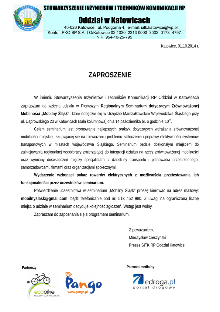 STOWARZYSZENIE INŻYNIERÓW I TECHNIKÓW KOMUNIKACJI RP Oddział w Katowicach 40-026 Katowice, ul. Podgórna 4, e-mail: [email protected] Konto : PKO BP S.A. I O/Katowice 02 1020 2313 0000 3002 0173 4797 NIP: 954-10-25-795 Katowice, 01.10.2014 r. ZAPROSZENIE W imieniu Stowarzyszenia Inżynierów i Techników Komunikacji RP Oddział w Katowicach zapraszam do wzięcia udziału w Pierwszym Regionalnym Seminarium dotyczącym Zrównoważonej Mobilności „Mobilny Śląsk”, które odbędzie się w Urzędzie Marszałkowskim Województwa Śląskiego przy ul. Dąbrowskiego 23 w Katowicach (sala kolumnowa) dnia 14 października br. o godzinie 1000. Celem seminarium jest promowanie najlepszych praktyk dotyczących wdrażania zrównoważonej mobilności miejskiej, skupiającej się na rozwiązaniu problemu zatłoczenia i poprawy efektywności systemów transportowych w miastach województwa Śląskiego. Seminarium będzie doskonałym miejscem do zainicjowania regionalnej współpracy zmierzającej do integracji działań na rzecz zrównoważonej mobilności oraz wymiany doświadczeń między specjalistami z dziedziny transportu i planowania przestrzennego, samorządowcami, firmami oraz organizacjami społecznymi. Wydarzenie wzbogaci pokaz rowerów elektrycznych z możliwością przetestowania ich funkcjonalności przez uczestników seminarium. Potwierdzenie uczestnictwa w seminarium „Mobilny Śląsk” proszę kierować na adres mailowy: [email protected], bądź telefonicznie pod nr: 513 452 980. Z uwagi na ograniczoną liczbę miejsc o udziale w seminarium decyduje kolejność zgłoszeń. Wstęp jest wolny. Zapraszam do zapoznania się z programem seminarium. Z poważaniem, Mieczysław Cieszyński Prezes SITK RP Oddział Katowice Partnerzy Patronat medialny Regionalne Seminarium dotyczące Zrównoważonej Mobilności „Mobilny Śląsk” 14 października 2014 r. Urząd Marszałkowski Województwa Śląskiego (sala kolumnowa), ul. Dąbrowskiego 23, Katowice PROGRAM SEMINARIUM 09:30 – 10:00 REJESTRACJA 10:00 – 10:05 Otwarcie seminarium – powitanie gości 10:05 – 10:20 Projekt „Mobilny Śląsk” Polityka rowerowa miasta Dąbrowa Górnicza 10:20 – 10:35 Zasady wsparcia inwestycji w zakresie zrównoważonej mobilności w ramach RPO WSL 2014-2020 10:35 – 10:55 Francuskie doświadczenia w rozwoju komunikacji rowerowej 10:55 – 11:15 Węzły intermodalne i ich znaczenie dla systemu transportu publicznego 11:10 – 11:25 Projekty transportowe w ramach Zintegrowanych Inwestycji Terytorialnych Subregionu Centralnego Województwa Śląskiego 11:25 – 11:40 Inwestycje w transport publiczny w Tychach Mieczysław Cieszyński Prezes Stowarzyszenia Inżynierów i Techników Komunikacji RP Oddział Katowice Marcin Bazylak Pełnomocnik Prezydenta Miasta Dąbrowa Górnicza Tobiasz Nykamowicz Stefania Koczar-Sikora Zastępca Dyrektora Wydziału Rozwoju Regionalnego UMWSL Olivier Schneider Francuska Federacja Użytkowników Rowerów, Europejska Federacja Cyklistów dr Michał Beim Uniwersytet Przyrodniczy w Poznaniu Mariusz Śpiewok Dyrektor Biura Związku Subregionu Centralnego Mieczysława Podmokły Zastępca Prezydenta Miasta Tychy 11:40 – 11:55 Teraźniejszość i Przyszłość Komunikacji Tramwajowej w Aglomeracji Śląsko-Zagłębiowskiej 11:55 – 12:10 Doświadczenia miast polskich z rowerem miejskim 12:10 – 12:25 Zastosowanie rowerów elektrycznych w mobilności miejskiej 12:25 – 13:00 PRZERWA KAWOWA/POKAZ ROWERÓW ELEKTRYCZNYCH 13:00 – 13:15 Działania GZM w zakresie zrównoważonego transportu 13:15 – 13:30 Dynamiczny System Informacji Pasażerskiej na terenie KZK GOP Tadeusz Freisler Prezes Zarządu Tramwaje Śląskie S.A. Tomasz Wojtkiewicz Grzegorz Szczygieł Nextbike Ecobike dr Adam Baron Łukasz Słania 13:30 – 13:45 13:45 – 14:00 14:00 – 14:15 14:15 – 14:30 Tomasz Tosza Bartosz Zimny Ewa Mróz podinsp. Włodzimierz Mogiła Dawid Ochód, Ludomir Utratny Jakub Wiśniowski Paweł Wyszomirski Dyrektor Górnośląskiego Związku Metropolitarnego Naczelnik Wydziału Zarządzania Jakością Usług Przewozowych KZK GOP Urząd Miejski w Jaworznie Zarząd Dróg i Transportu w Łodzi Pango Polska sp. z o. o. Wydział Ruchu Drogowego Komendy Wojewódzkiej Policji w Katowicach Zarząd Dróg Miejskich w Gliwicach Plan mobilności miejskiej miasta Jaworzno Strefy woonerf na przykładzie miasta Łódź Pango - nowoczesne technologie na usługach miast. Niechroniony uczestnik ruchu drogowego w komunikacji drogowej województwa Śląskiego 14:30 – 14:45 ITS Gliwice - zarządzanie ruchem w skali miasta 14:45 – 14:55 Przykłady systemów parkingów rowerowych typu Bike and Ride 14:55 – 15:15 Komu przeszkadza rower w mieście? - rola NGO we wdrażaniu polityki rowerowej 15:15 ZAKOŃCZENIE Kontakt do organizatora: Stowarzyszenie Inżynierów i Techników Komunikacji RP Oddział Katowice Tobiasz Nykamowicz, tel. 513 452 980 [email protected] Projekt Bike and Ride Fundacja Napraw Sobie Miasto