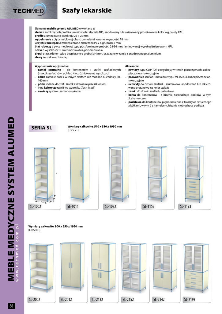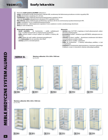 Szafy lekarskie Elementy mebli systemu ALUMED wykonano z: stelaż z zamkniętych profili aluminiowych i złączek ABS, anodowany lub lakierowany proszkowo na kolor wg palety RAL profile aluminiowe o przekroju 25 x 25 mm wypełnienie z płyty meblowej obustronnie laminowanej o grubości 18 mm wszystkie krawędzie zabezpieczone obrzeżami PCV o grubości 2 mm blat roboczy z płyty meblowej typu postforming o grubości 28-36 mm, laminowanej wysokociśnieniowym HPL nóżki o wysokości 10 cm z możliwością poziomowania drzwi przeszklone - szkło bezpieczne o grubości 4 mm, osadzone w ramie z anodowanego aluminium zlewy ze stali nierdzewnej w w w.techmed.com.pl MEBLE MEDYCZNE SYSTEM ALUMED Wyposażenie opcjonalne: • zamki centralne - do kontenerów i szafek szufladowych (max. 5 szuflad równych lub 4 o zróżnicowanej wysokości) • kółka zamiast nóżek w innych szafach niż mobilne o średnicy 80160 mm • półki szklane do szaf i szafek z drzwiami przeszklonymi • inna kolorystyka niż we wzorniku „Tech-Med” • zawiasy systemu samodomykania SERIA SL Wymiary całkowite: 510 x 550 x 1950 mm [L x S x H] H L SL-1002 S SL-1011 SL-1022 SL-1152 SL-1193 Wymiary całkowite: 900 x 550 x 1950 mm [L x S x H] SL-2002 86 Akcesoria: • zawiasy typu CLIP TOP z regulacją w trzech płaszczyznach, zabezpieczone antykorozyjnie • prowadnice szuflad - metalowe typu METABOX, zabezpieczone antykorozyjnie • uchwyty do drzwi i szuflad - aluminiowe anodowane lub lakierowane proszkowo na kolor stelaża • zamki do drzwi i szuflad - patentowe • kółka do kontenerów - z bieżnią niebrudzącą podłoża, w tym 2 z hamulcem • podstawa do kontenerów pięcioramienna z tworzywa sztucznego z kółkami, w tym 2 z hamulcem, bieżnia niebrudząca podłoża SL-2012 SL-2132 SL-2152 SL-2142 SL-2193