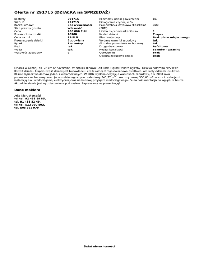 Oferta nr 291715 (DZIAŁKA na SPRZEDAŻ) Id oferty SWO ID Rodzaj umowy Stan prawny gruntu Cena Powierzchnia działki Cena za m2 Przeznaczenie działki Rynek Prąd Woda Wysokość zabudowy 291715 291715 Bez wyłączności Własność 200 000 PLN 10700 19 PLN Budowlana Pierwotny tak tak 9 Minimalny udział powierzchni biologicznie czynnej w % Powierzchnia Użytkowo Mieszkalna (PUM) Liczba pięter mieszkaniówka Kształt działki Plan miejscowy Wydane warunki zabudowy Aktualne pozwolenie na budowę Droga dojazdowa Rodzaj kanalizacji Ogrodzenie Obecna zabudowa działki 85 300 1 Trapez Brak planu miejscowego tak tak Asfaltowa Szambo - szczelne Brak Brak Działka w Glinnej, ok. 28 km od Szczecina. W pobliżu Binowo Golf Park, Ogród Dendrologiczny. Działka położona przy lesie. Kształt działki - trapez. Część działki jest budowlanej i część rolnej. Droga dojazdowa asfaltowa, ale mały odcinek -brukowa. Bliskie sąsiedztwo domów jedno- i wielorodzinnych. W 2007 wydano decyzję o warunkach zabudowy, a w 2008 roku pozwolenie na budowę domu jednorodzinnego o pow. zabudowy 240,77 m2, pow. użytkowej 300,63 m2 wraz z instalacjami: instalacją c.o., wodociągową, elektryczną oraz na budowę przyłącza wodociągowego. Pełna dokumentacja do wglądu w biurze. Aktualnie ziemia jest wydzierżawiona pod zasiew. Zapraszamy na prezentację! Dane maklera Arka Nieruchomości tel. tel. 91 433 59 85, tel. 91 433 52 49, tel. tel. 512 080 803, tel. 508 382 979 Świat nieruchomości Powered by TCPDF (www.tcpdf.org)