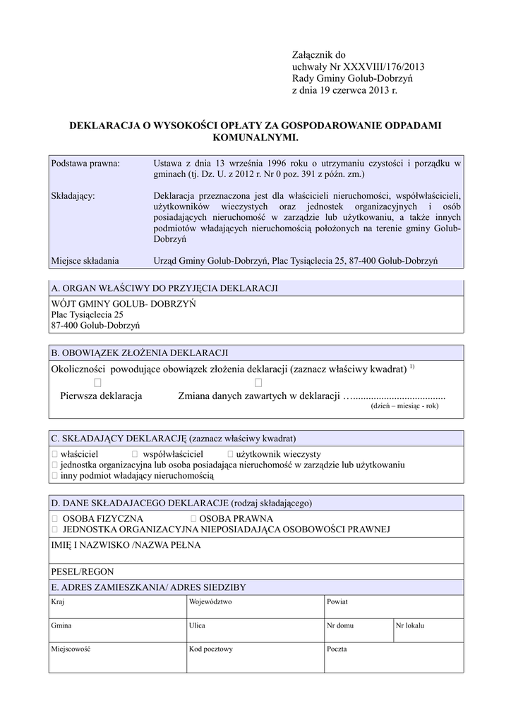 Załącznik do uchwały Nr XXXVIII/176/2013 Rady Gminy Golub-Dobrzyń z dnia 19 czerwca 2013 r. DEKLARACJA O WYSOKOŚCI OPŁATY ZA GOSPODAROWANIE ODPADAMI KOMUNALNYMI. Podstawa prawna: Ustawa z dnia 13 września 1996 roku o utrzymaniu czystości i porządku w gminach (tj. Dz. U. z 2012 r. Nr 0 poz. 391 z późn. zm.) Składający: Deklaracja przeznaczona jest dla właścicieli nieruchomości, współwłaścicieli, użytkowników wieczystych oraz jednostek organizacyjnych i osób posiadających nieruchomość w zarządzie lub użytkowaniu, a także innych podmiotów władających nieruchomością położonych na terenie gminy GolubDobrzyń Miejsce składania Urząd Gminy Golub-Dobrzyń, Plac Tysiąclecia 25, 87-400 Golub-Dobrzyń A. ORGAN WŁAŚCIWY DO PRZYJĘCIA DEKLARACJI WÓJT GMINY GOLUB- DOBRZYŃ Plac Tysiąclecia 25 87-400 Golub-Dobrzyń B. OBOWIĄZEK ZŁOŻENIA DEKLARACJI Okoliczności powodujące obowiązek złożenia deklaracji (zaznacz właściwy kwadrat) 1) Pierwsza deklaracja Zmiana danych zawartych w deklaracji ….................................... (dzień – miesiąc - rok) C. SKŁADAJĄCY DEKLARACJĘ (zaznacz właściwy kwadrat) właściciel współwłaściciel użytkownik wieczysty jednostka organizacyjna lub osoba posiadająca nieruchomość w zarządzie lub użytkowaniu inny podmiot władający nieruchomością D. DANE SKŁADAJACEGO DEKLARACJE (rodzaj składającego) OSOBA FIZYCZNA OSOBA PRAWNA JEDNOSTKA ORGANIZACYJNA NIEPOSIADAJĄCA OSOBOWOŚCI PRAWNEJ IMIĘ I NAZWISKO /NAZWA PEŁNA PESEL/REGON E. ADRES ZAMIESZKANIA/ ADRES SIEDZIBY Kraj Województwo Powiat Gmina Ulica Nr domu Miejscowość Kod pocztowy Poczta Nr lokalu F. ADRES NIERUCHOMOŚCI NA KTÓREJ POWSTAJĄ ODPADY KOMUNALNE Kraj Województwo Powiat Gmina Ulica Nr domu Miejscowość Kod pocztowy Poczta Nr lokalu Nr ewidencyjny działki G. WYSOKOŚĆ OPŁATY ZA GOSPODAROWANIE ODPADAMI KOMUNALNYMI 1. Dotyczy właścicieli nieruchomości zamieszkałych Oświadczam, że na terenie nieruchomości wskazanej w części F niniejszej deklaracji : 1. Jest zameldowanych ________ osób. 2. Zamieszkuje ______ osób. Wyliczenie miesięcznej opłaty: …................................. (liczba mieszkańców) X ….................................... = ….......................................... zł (stawka opłaty) (iloczyn liczby mieszkańców i stawki opłaty ) Wysokość opłaty miesięcznej za gospodarowanie odpadami komunalnymi wynosi słownie: ….......................................................................................................................................................... 2. Dotyczy właścicieli nieruchomości niezamieszkałych, na których powstają odpady Oświadczam, że na terenie nieruchomości wskazanej w części F niniejszej deklaracji odpady komunalne niesegregowane (zmieszane) gromadzone są w następujących pojemnikach: Wyliczenie miesięcznej opłaty: 1. …............................................... X (miesięczna liczba pojemników 60 l) 2. …............................................... …....................................... = …................................................ zł (stawka opłaty) X (miesięczna liczba pojemników 110 l) (iloczyn liczby pojemników i stawki opłaty) …....................................... = …................................................ zł (stawka opłaty) (iloczyn liczby pojemników i stawki opłaty) 3. …................................................ X …........................................ = …............................................ ... zł (miesięczna liczba pojemników 120 l) (stawka opłaty) (iloczyn liczby pojemników i stawki opłaty) 4. …................................................ X ….........................................= .................................................... zł (miesięczna liczba pojemników 240 l) 5. (stawka opłaty) (iloczyn liczby pojemników i stawki opłaty) ….................................................................................... X …........................................................................... = …..................................................................................... (miesięczna liczba pojemników 1100 l) (stawka opłaty) zł (iloczyn liczby pojemników i stawki opłaty) Wysokość opłaty miesięcznej za gospodarowanie odpadami komunalnymi wynosi łącznie ….................... zł (należy wpisać sumę z poz.1-6) (słownie: …........................................................................................................................................................................................) 3. Oświadczam, że na terenie nieruchomości: nie ma kompostownika i odpady ulegające biodegradacji przekazywane będą przedsiębiorcy odbierającemu odpady komunalne znajduje się kompostownik lub odpady ulegające biodegradacji (kuchenne i ogrodowe) wykorzystywane są w inny sposób na własne potrzeby. 4. Dotyczy właścicieli nieruchomości, których część nieruchomości, stanowi nieruchomość, o której mowa w pkt 1, a w części nieruchomości, o której mowa w pkt 2. Oświadczam, że wysokość opłaty miesięcznej za gospodarowanie odpadami komunalnymi, zgodnie z lit. G pkt 1 i 2 wynosi: …................................................. zł (należy wpisać sumę opłat z punktu 1 i 2) (słownie…...........................................................................................................................................) H. ZAŁĄCZNIK 1. Kopia obowiązującej umowy zawartej z przedsiębiorcą na odbieranie odpadów komunalnych – obowiązkowo do pierwszej deklaracji.²) I.OŚWIADACZENIE I PODPIS SKŁADAJĄCEGO DEKLARACJĘ ….................................................................. ( miejscowość i data) …......................................................... (czytelny podpis) J. ADNOTACJE ORGANU Pouczenie: 1. Deklaracja stanowi podstawę do wystawienia ty