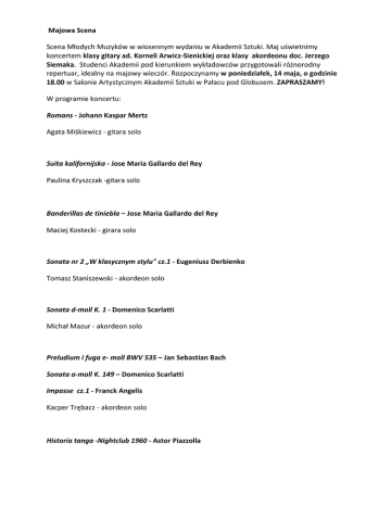 Majowa Scena Scena Młodych Muzyków w wiosennym wydaniu w Akademii Sztuki. Maj uświetnimy koncertem klasy gitary ad. Korneli Arwicz-‐Sienickiej oraz klasy akordeonu doc. Jerzego Siemaka. Studenci Akademii pod kierunkiem wykładowców przygotowali różnorodny repertuar, idealny na majowy wieczór. Rozpoczynamy w poniedziałek, 14 maja, o godzinie 18.00 w Salonie Artystycznym Akademii Sztuki w Pałacu pod Globusem. ZAPRASZAMY! W programie koncertu: Romans -‐ Johann Kaspar Mertz Agata Miśkiewicz -‐ gitara solo Suita kalifornijska -‐ Jose Maria Gallardo del Rey Paulina Kryszczak -‐gitara solo Banderillas de tiniebla – Jose Maria Gallardo del Rey Maciej Kostecki -‐ girara solo Sonata nr 2 „W klasycznym stylu" cz.1 -‐ Eugeniusz Derbienko Tomasz Staniszewski -‐ akordeon solo Sonata d-‐moll K. 1 -‐ Domenico Scarlatti Michał Mazur -‐ akordeon solo Preludium i fuga e-‐ moll BWV 535 – Jan Sebastian Bach Sonata a-‐moll K. 149 – Domenico Scarlatti Impasse cz.1 -‐ Franck Angelis Kacper Trębacz -‐ akordeon solo Historia tanga -‐Nightclub 1960 -‐ Astor Piazzolla