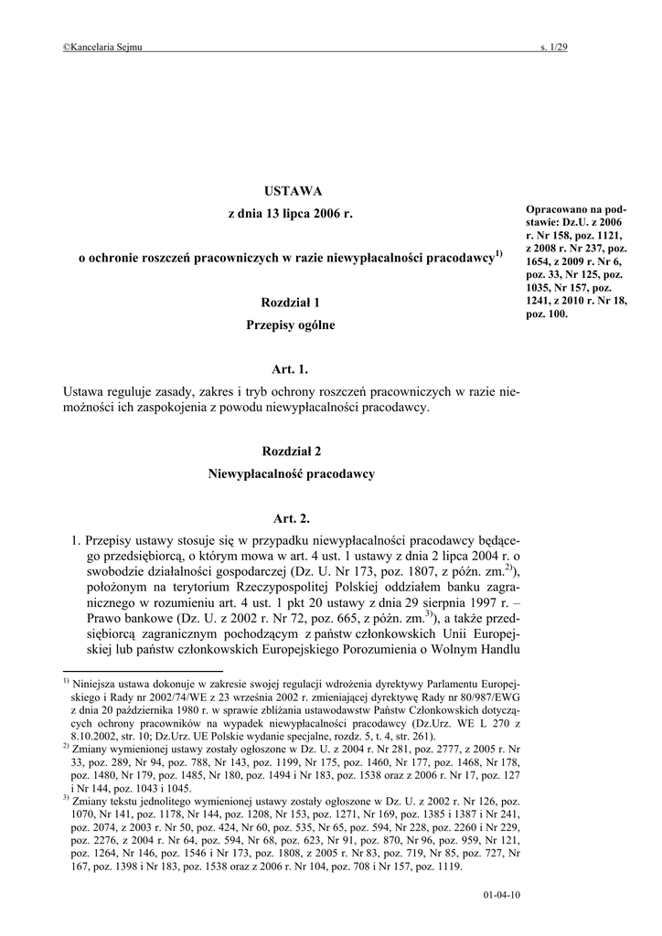 ©Kancelaria Sejmu s. 1/29 USTAWA z dnia 13 lipca 2006 r. o ochronie roszczeń pracowniczych w razie niewypłacalności pracodawcy1) Rozdział 1 Przepisy ogólne Art. 1. Ustawa reguluje zasady, zakres i tryb ochrony roszczeń pracowniczych w razie niemożności ich zaspokojenia z powodu niewypłacalności pracodawcy. Rozdział 2 Niewypłacalność pracodawcy Art. 2. 1. Przepisy ustawy stosuje się w przypadku niewypłacalności pracodawcy będącego przedsiębiorcą, o którym mowa w art. 4 ust. 1 ustawy z dnia 2 lipca 2004 r. o swobodzie działalności gospodarczej (Dz. U. Nr 173, poz. 1807, z późn. zm.2)), położonym na terytorium Rzeczypospolitej Polskiej oddziałem banku zagranicznego w rozumieniu art. 4 ust. 1 pkt 20 ustawy z dnia 29 sierpnia 1997 r. – Prawo bankowe (Dz. U. z 2002 r. Nr 72, poz. 665, z późn. zm.3)), a także przedsiębiorcą zagranicznym pochodzącym z państw członkowskich Unii Europejskiej lub państw członkowskich Europejskiego Porozumienia o Wolnym Handlu 1) Niniejsza ustawa dokonuje w zakresie swojej regulacji wdrożenia dyrektywy Parlamentu Europejskiego i Rady nr 2002/74/WE z 23 września 2002 r. zmieniającej dyrektywę Rady nr 80/987/EWG z dnia 20 października 1980 r. w sprawie zbliżania ustawodawstw Państw Członkowskich dotyczących ochrony pracowników na wypadek niewypłacalności pracodawcy (Dz.Urz. WE L 270 z 8.10.2002, str. 10; Dz.Urz. UE Polskie wydanie specjalne, rozdz. 5, t. 4, str. 261). 2) Zmiany wymienionej ustawy zostały ogłoszone w Dz. U. z 2004 r. Nr 281, poz. 2777, z 2005 r. Nr 33, poz. 289, Nr 94, poz. 788, Nr 143, poz. 1199, Nr 175, poz. 1460, Nr 177, poz. 1468, Nr 178, poz. 1480, Nr 179, poz. 1485, Nr 180, poz. 1494 i Nr 183, poz. 1538 oraz z 2006 r. Nr 17, poz. 127 i Nr 144, poz. 1043 i 1045. 3) Zmiany tekstu jednolitego wymienionej ustawy zostały ogłoszone w Dz. U. z 2002 r. Nr 126, poz. 1070, Nr 141, poz. 1178, Nr 144, poz. 1208, Nr 153, poz. 1271, Nr 169, poz. 1385 i 1387 i Nr 241, poz. 2074, z 2003 r. Nr 50, poz. 424, Nr 60, poz. 535, Nr 65, poz. 594, Nr 228, poz. 2260 i Nr 229, poz. 2276, z 2004 r. Nr 64, poz. 594, Nr 68, poz. 623, Nr 91, poz. 870, Nr 96, poz. 959, Nr 121, poz. 1264, Nr 146, poz. 1546 i Nr 173, poz. 1808, z 2005 r. Nr 83, poz. 719, Nr 85, poz. 727, Nr 167, poz. 1398 i Nr 183, poz. 1538 oraz z 2006 r. Nr 104, poz. 708 i Nr 157, poz. 1119. 01-04-10 Opracowano na podstawie: Dz.U. z 2006 r. Nr 158, poz. 1121, z 2008 r. Nr 237, poz. 1654, z 2009 r. Nr 6, poz. 33, Nr 125, poz. 1035, Nr 157, poz. 1241, z 2010 r. Nr 18, poz. 100. ©Kancelaria Sejmu s. 2/29 (EFTA) – stron umowy o Europejskim Porozumieniu Gospodarczym, który utworzył na terytorium Rzeczypospolitej Polskiej oddział lub przedstawicielstwo, o którym mowa w przepisach o swobodzie działalności gospodarczej, o ile: – w przypadku przedsiębiorców zagranicznych z państw członkowskich Unii Europejskiej, z wyłączeniem Danii – może być wobec nich wszczęte postępowanie upadłościowe w rozumieniu art. 2 lit. a lub lit. c rozporządzenia Rady (WE) nr 1346/2000 z dnia 29 maja 2000 r. w sprawie postępowania upadłościowego4), – w przypadku przedsiębiorców zagranicznych z Danii i państw członkowskich Europejskiego Porozumienia o Wolnym Handlu (EFTA) – stron umowy o Europejskim Porozumieniu Gospodarczym – może być wobec nich uznane główne zagraniczne postępowanie upadłościowe, o którym mowa w przepisach ustawy z dnia 28 lutego 2003 r. - Prawo upadłościowe i naprawcze (Dz.U. Nr 60, poz. 535, z późn. zm.5)) dotyczących międzynarodowego postępowania upadłościowego, – w przypadku przedsiębiorców prowadzących działalność gospodarczą na terytorium Rzeczypospolitej Polskiej, a także oddziałów banków zagranicznych – odrębne przepisy nie wyłączają możliwości ogłoszenia na terytorium Rzeczypospolitej Polskiej upadłości takiego pracodawcy, – w przypadku przedsiębiorców zagranicznych z państw członkowskich Unii Europejskiej i państw członkowskich Europejskiego Porozumienia o Wolnym Handlu (EFTA) – stron umowy o Europejskim Porozumieniu Gospodarczym działających na terenie Rzeczypospolitej Polskiej jako oddział instytucji kredytowej lub zakładu ubezpieczeń – może zostać wszczęte wobec instytucji kredytowej lub zakładu ubezpieczeń postępowanie upadłościowe, postępowanie układowe lub inne podobne postępowanie, i jednocześnie zatrudnia, zgodnie z przepisami polskiego prawa, co najmniej jedną osobę fizyczną w związku z prowadzoną na terytorium Rzeczypospolitej Polskiej działalnością gospodarczą lub działalnością przedstawicielstwa. 2. Niewypłacalność pracodawcy, o której mowa w ust. 1, nie zachodzi w odniesieniu do osób prawnych podlegających obowiązkowi wpisu do rejestru stowarzyszeń, innych organizacji społecznych i zawodowych, fundacji oraz publicznych zakładów opieki zdrowotnej, o którym mowa w rozdziale 3 ustawy z dnia 20 sierpnia 1997 r. o Krajowym Rejestrze Sądowym (Dz. U. z 2001 r. Nr 17, poz. 209, z późn. zm.6)), wpisanych do rejestru przedsiębiorców z tytułu wykonywania działalności gospodarczej, jednostek zaliczanych, na podstawie odrębnych przepisów, do sektora finansów publicznych, a także osób fizycznych prowadzących gospodarstwo domowe zatrudniających osoby wykonujące pracę zarobkową w tym gospodarstwie. 4) Wymienione rozporządzenie zostało opublikowane w Dz.Urz WE L 160 z 30.06.2000, str. 1, z późn. zm.; Dz.Urz. UE Polskie wydanie specjalne, rozdz. 19, t. 1, str. 191. 5) Zmiany wymienionej ustawy zostały ogłoszone w Dz.U. z 2003 r. Nr 217, poz. 2125, z 2004 r. Nr 91, poz. 870 i 871, Nr 96, poz. 959, Nr 121, poz. 1264, Nr 146, poz. 1546, Nr 173, poz. 1808 i Nr 210, poz. 2135, z 2005 r. Nr 94, poz. 785, Nr 183, poz. 1538 i Nr 184, poz. 1539 oraz z 2006 r. Nr 47, poz. 347, Nr 133, poz. 935 i Nr 157, poz. 1119. 6) Zmiany tekstu jednolitego wymienionej ustawy zostały ogłoszone w Dz. U. z 2001 r. Nr 110, poz. 1189, 