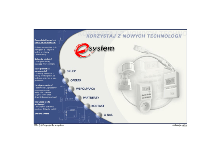 Zapamiętaj ten adres! Dodaj do ulubionych! Mo żesz zaoszczędzić dużo pieniędzy, a Tw ój dom będzie przyjazny i nowoczesny. Boisz się złodziei? - dostępne alarmy rozwiążą Tw ój problem! Du żo płacisz za ogrzewanie? - dowolny termostat z naszej oferty sprawi, że będziesz śmiać się z tego problemu! Inteligentny dom? - oczywiście! Zapraszamy po programatory, wy łączniki czasowe i czujniki ruchu oraz dzwonki bezprzewodowe! Nie wiesz jak to podłączyć? - my wiemy! I ch ętnie powiemy Ci jak to zrobić! ZAPRASZAMY! 2004 (c) Copyright by e-system realizacja: Arkis