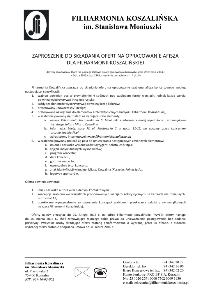 FILHARMONIA KOSZALIŃSKA im. Stanisława Moniuszki ZAPROSZENIE DO SKŁADANIA OFERT NA OPRACOWANIE AFISZA DLA FILHARMONII KOSZALIŃSKIEJ (dotyczy zamówienia, które nie podlega Ustawie Prawo zamówień publicznych z dnia 29 stycznia 2004 r. – Dz.U z 2015 r. poz.2161, stosownie do zapisów art. 4 pkt 8) Filharmonia Koszalińska zaprasza do składania ofert na opracowanie szablonu afisza koncertowego według następującej specyfikacji: 1. szablon powinien być w przynajmniej 4 spójnych pod względem formy wersjach, jednak każda wersja powinna wykorzystywać inną kolorystykę; 2. każdy szablon może wykorzystywać dowolną liczbę kolorów; 3. preferowany „nowoczesny” design; 4. preferowane nawiązanie do elementów architektonicznych budynku Filharmonii Koszalińskiej; 5. w szablonie powinny się znaleźć następujące stałe elementy: a. nazwa: Filharmonia Koszalińska im. S. Moniuszki + informacja mniej wyróżniona: samorządowa instytucja kultury Miasta Koszalina b. informacja: bilety: kasa FK ul. Piastowska 2 w godz. 11-15, na godzinę przed koncertem oraz na kupbilecik.pl; c. adres strony internetowej: www.filharmoniakoszalinska.pl; 6. w szablonie powinny znaleźć się pola do umieszczania następujących zmiennych elementów: a. imiona i nazwiska wykonawców (dyrygent, solista, chór itp.); b. zdjęcia indywidualnych wykonawców; c. program koncertu; d. data koncertu; e. godzina koncertu; f. ewentualnie tytuł koncertu; g. znak identyfikacji wizualnej Miasta Koszalina (Koszalin. Pełnia życia); h. logotypy sponsorów. Oferta powinna zawierać: 1. 2. 3. imię i nazwisko autora wraz z danymi kontaktowymi; koncepcję szablonu we wszystkich proponowanych wersjach kolorystycznych na kartkach nie mniejszych, niż format A3; oczekiwane wynagrodzenie za stworzenie koncepcji szablonu i przekazanie całości praw majątkowych na rzecz Filharmonii Koszalińskiej. Oferty należy przesyłać do 29. lutego 2016 r. na adres Filharmonii Koszalińskiej. Wybór oferty nastąpi do 15. marca 2016 r., choć zamawiający zastrzega sobie prawo do unieważnienia postępowania bez podania przyczyny. Wszystkie osoby składające oferty zostaną poinformowane o wybranej przez FK ofercie. Z autorem wybranej oferty zostanie podpisana umowa do 31. marca 2016 r. Filharmonia Koszalińska im. Stanisława Moniuszki ul. Piastowska 2 75-400 Koszalin NIP: 669-10-05-002 Centrala tel. (94) 342 20 22 Dyrektor tel. fax: (94) 342 36 96 Biuro Koncertowe tel.fax: (94) 342 62 20 Konto bankowe: PKO BP S.A. Koszalin Nr: 23 1020 2791 0000 7502 0009 3930 e-mail: [email protected]