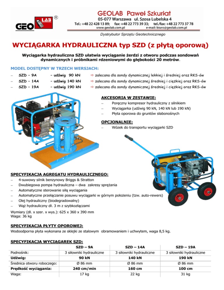 WYCIĄGARKA HYDRAULICZNA typ SZD (z płytą oporową) Wyciągarka hydrauliczna SZD ułatwia wyciąganie żerdzi z otworu podczas sondowań dynamicznych i próbnikami rdzeniowymi do głębokości 20 metrów. MODEL DOSTĘPNY W TRZECH WERSJACH: SZD – 9A – udźwig 90 kN zalecana dla sondy dynamicznej lekkiej i średniej oraz RKS-ów SZD – 14A – udźwig 140 kN zalecana dla sondy dynamicznej średniej i ciężkiej oraz RKS-ów SZD – 19A – udźwig 190 kN zalecana dla sondy dynamicznej średniej i ciężkiej oraz RKS-ów AKCESORIA W ZESTAWIE: Poręczny kompresor hydrauliczny z silnikiem Wyciągarka (udźwig 90 kN, 140 kN lub 190 kN) Płyta oporowa do gruntów słabonośnych OPCJONALNIE: Wózek do transportu wyciągarki SZD SPECYFIKACJA AGREGATU HYDRAULICZNEGO: 4-suwowy silnik benzynowy Briggs & Stratton Dwubiegowa pompa hydrauliczna – dwa zakresy sprężania Automatyczne sterowanie siłą wyciągania Automatyczne przełączanie posuwu wyciągarki w górnym położeniu (tzw. auto-rewers) Olej hydrauliczny (biodegradowalny) Wąż hydrauliczny dł. 3 m z szybkozłączami Wymiary (dł. x szer. x wys.): 625 x 360 x 390 mm Waga: 36 kg SPECYFIKACJA PŁYTY OPOROWEJ: Wodoodporna płyta wykonana ze sklejki ze stalowym obramowaniem i uchwytem, waga 8,5 kg. SPECYFIKACJA WYCIĄGAREK SZD: Podnośnik: Udźwig: Średnica otworu roboczego: Prędkość wyciągania: Waga: SZD – 9A SZD – 14A SZD – 19A 3 siłowniki hydrauliczne 3 siłowniki hydrauliczne 3 siłowniki hydrauliczne 90 kN 140 kN 190 kN Ø 86 mm Ø 86 mm Ø 86 mm 240 cm/min 160 cm 100 cm 17 kg 22 kg 31 kg