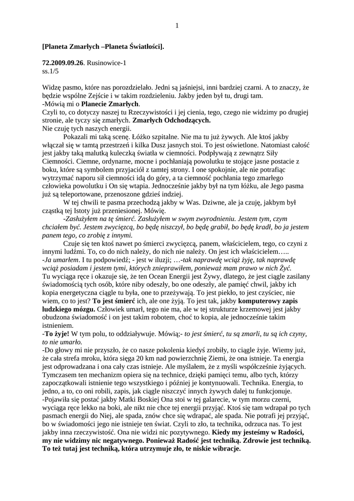 1 [Planeta Zmarłych –Planeta Światłości]. 72.2009.09.26. Rusinowice-1 ss.1/5 Widzę pasmo, które nas porozdzielało. Jedni są jaśniejsi, inni bardziej czarni. A to znaczy, że będzie wspólne Zejście i w takim rozdzieleniu. Jakby jeden był tu, drugi tam. -Mówią mi o Planecie Zmarłych. Czyli to, co dotyczy naszej tu Rzeczywistości i jej cienia, tego, czego nie widzimy po drugiej stronie, ale tyczy się zmarłych. Zmarłych Odchodzących. Nie czuję tych naszych energii. Pokazali mi taką scenę. Łóżko szpitalne. Nie ma tu już żywych. Ale ktoś jakby włączał się w tamtą przestrzeń i kilka Dusz jasnych stoi. To jest oświetlone. Natomiast całość jest jakby taką malutką kuleczką światła w ciemności. Podpływają z zewnątrz Siły Ciemności. Ciemne, ordynarne, mocne i pochłaniają powolutku te stojące jasne postacie z boku, które są symbolem przyjaciół z tamtej strony. I one spokojnie, ale nie potrafiąc wytrzymać naporu sił ciemności idą do góry, a ta ciemność pochłania tego zmarłego człowieka powolutku i On się wtapia. Jednocześnie jakby był na tym łóżku, ale Jego pasma już są teleportowane, przenoszone gdzieś indziej. W tej chwili te pasma przechodzą jakby w Was. Dziwne, ale ja czuję, jakbym był cząstką tej Istoty już przeniesionej. Mówię. -Zasłużyłem na tę śmierć. Zasłużyłem w swym zwyrodnieniu. Jestem tym, czym chciałem być. Jestem zwycięzcą, bo będę niszczył, bo będę grabił, bo będę kradł, bo ja jestem panem tego, co zrobię z innymi. Czuje się ten ktoś nawet po śmierci zwycięzcą, panem, właścicielem, tego, co czyni z innymi ludźmi. To, co do nich należy, do nich nie należy. On jest ich właścicielem….. -Ja umarłem. I tu podpowiedź; - jest w iluzji; …-tak naprawdę wciąż żyję, tak naprawdę wciąż posiadam i jestem tymi, których znieprawiłem, ponieważ mam prawo w nich Żyć. Tu wyciąga ręce i okazuje się, że ten Ocean Energii jest Żywy, dlatego, że jest ciągle zasilany świadomością tych osób, które niby odeszły, bo one odeszły, ale pamięć chwil, jakby ich kopia energetyczna ciągle tu była, one to przeżywają. To jest piekło, to jest czyściec, nie wiem, co to jest? To jest śmierć ich, ale one żyją. To jest tak, jakby komputerowy zapis ludzkiego mózgu. Człowiek umarł, tego nie ma, ale w tej strukturze krzemowej jest jakby obudzona świadomość i on jest takim robotem, choć to kopia, ale jednocześnie takim istnieniem. -To żyje! W tym polu, to oddziaływuje. Mówią;- to jest śmierć, tu są zmarli, tu są ich czyny, to nie umarło. -Do głowy mi nie przyszło, że co nasze pokolenia kiedyś zrobiły, to ciągle żyje. Wiemy już, że cała strefa mroku, która sięga 20 km nad powierzchnię Ziemi, że ona istnieje. Ta energia jest odprowadzana i ona cały czas istnieje. Ale myślałem, że z myśli współcześnie żyjących. Tymczasem ten mechanizm opiera się na technice, dzięki pamięci temu, albo tych, którzy zapoczątkowali istnienie tego wszystkiego i później je kontynuowali. Technika. Energia, to jedno, a to, co oni robili, zapis, jak ciągle niszczyć innych żywych dalej tu funkcjonuje. -Pojawiła się postać jakby Matki Boskiej Ona stoi w tej galarecie, w tym morzu czerni, wyciąga ręce lekko na boki, ale nikt nie chce tej energii przyjąć. Ktoś się tam wdrapał po tych pasmach energii do Niej, ale spada, znów chce się wdrapać, ale spada. Nie potrafi jej przyjąć, bo w świadomości jego nie istnieje ten świat. Czyli to zło, ta technika, odrzuca nas. To jest jakby inna rzeczywistość. Ona nie widzi nic pozytywnego. Kiedy my jesteśmy w Radości, my nie widzimy nic negatywnego. Ponieważ Radość jest techniką. Zdrowie jest techniką. To też tutaj jest techniką, która utrzymuje zło, te niskie wibracje. 2 Dlatego, to, co próbuje się na tego Ducha Świętego wdrapać, spada. Słyszę, że wtedy Oni odczuwają ból i cierpienie, jak poznają tę czystość, ocierają się o to, niewiedzą. Wtedy przez ból, przez cierpienie otwierają przerażone oczy. -I ta sama Istota mówi; -..będę bólem, cierpieniem. I patrzy na innych. Oni nie cierpią i Ona teraz nie wie, jak dokonać wyboru, bo wie, że teraz cierpiąc może zwrócić się ku nowemu, może w tym czymś odnaleźć coś, co istnieje u góry, o czym nie wiedziała, albo zwrócić się znów ku technice i zapomnieć o tym, że istnieje ból i cierpienie. Ale odczuwając ból i cierpienie jakby nie chciała, aby one w tej chwili powstawały w tych atakowanych przez nią Istotach. Jest ta głowa, jest to rozumienie, rzuca się na lewo, na prawo i nie wie, co z sobą zrobić. Nagle pokazują mi tutaj człowieka, który jest ciemny, ale jakby niezależny. Jakby to jezioro na niego nie działało. Podchodzi do tej istoty i mówi; -pójdź za mną. A Istota patrzy na siebie, na te swoje szpony, na tego człowieczka i wie, że może go klapnąć i zniszczyć, ale idzie za niezależnym. Idzie, człapie, jak taka wielka ropucha. On sadza tę Istotę przy prostej ławie, tam stoi micha i ta pierwszy raz widzi, że to coś w tej misce jest jasne. Widzi pierwszy raz światełko, -to jest strawa duchowa. Je i zaczyna jaśnieć, ale każda cząstka jej ciała jest jakby łamana. Wielki reumatyzm. –Co, to jest? A on się uśmiecha i mówi; -ty wiesz. Przemiana. -A, czym jest ta przemiana? -Powrotem. Do tego, kim byłaś. -Nie wiem, kim jestem? -Patrz w talerz. W tym talerzu powstaje jakby takie czarodziejskie oczko i widzi tam czarodziejską jasną krainę. Zamki, pałace, światło, ludzie, którzy są w radości. Zaczyna tę Istotę coś pochłaniać i czuje rozstrój nerwowy w żołądku w matrycy. Tam się zaczyna zmieniać. Ta Istota jaśnieje i mówi; -kim jestem? -Światłem. Zapomnij o technice, zapomnij o wszystkim wróć do siebie. Na tej Istocie jaśnieje coś na głowie, taki diament. -Ale, czy mogę? Słyszy już w dali, ponieważ się unosi do góry; -zawsz