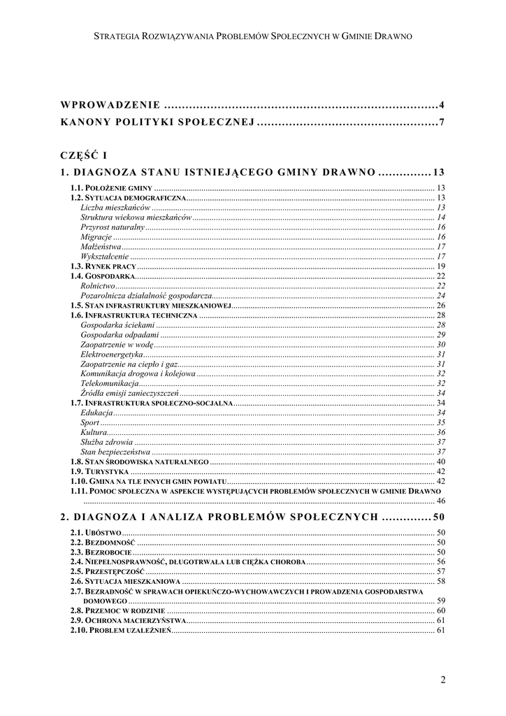 STRATEGIA ROZWIĄZYWANIA PROBLEMÓW SPOŁECZNYCH W GMINIE DRAWNO W PRO W A DZE NI E . . . . . . . . . . . . . . . . . . . . . . . . . . . . . . . . . . . . . . . . . . . . . . . . . . . . . . . . . . . . . . . . . . . . . . . . . . . . . 4 KANO NY PO L I T Y KI S PO Ł E C ZNE J . . . . . . . . . . . . . . . . . . . . . . . . . . . . . . . . . . . . . . . . . . . . . . . . . . . 7 CZĘ Ś Ć I 1 . DI AGNO ZA S T A NU I S T NI E J ĄCE GO GMI NY DRAW N O . . . . . . . . . . . . . . . 1 3 1.1. POŁOśENIE GMINY ................................................................................................................................... 13 1.2. SYTUACJA DEMOGRAFICZNA.................................................................................................................... 13 Liczba mieszkańców .................................................................................................................................... 13 Struktura wiekowa mieszkańców ................................................................................................................. 14 Przyrost naturalny ....................................................................................................................................... 16 Migracje ...................................................................................................................................................... 16 MałŜeństwa .................................................................................................................................................. 17 Wykształcenie .............................................................................................................................................. 17 1.3. RYNEK PRACY ........................................................................................................................................... 19 1.4. GOSPODARKA............................................................................................................................................ 22 Rolnictwo ..................................................................................................................................................... 22 Pozarolnicza działalność gospodarcza........................................................................................................ 24 1.5. STAN INFRASTRUKTURY MIESZKANIOWEJ............................................................................................... 26 1.6. INFRASTRUKTURA TECHNICZNA .............................................................................................................. 28 Gospodarka ściekami .................................................................................................................................. 28 Gospodarka odpadami ................................................................................................................................ 29 Zaopatrzenie w wodę ................................................................................................................................... 30 Elektroenergetyka ........................................................................................................................................ 31 Zaopatrzenie na ciepło i gaz........................................................................................................................ 31 Komunikacja drogowa i kolejowa ............................................................................................................... 32 Telekomunikacja .......................................................................................................................................... 32 Źródła emisji zanieczyszczeń ....................................................................................................................... 34 1.7. INFRASTRUKTURA SPOŁECZNO-SOCJALNA .............................................................................................. 34 Edukacja ...................................................................................................................................................... 34 Sport ............................................................................................................................................................ 35 Kultura......................................................................................................................................................... 36 SłuŜba zdrowia ............................................................................................................................................ 37 Stan bezpieczeństwa .................................................................................................................................... 37 1.8. STAN ŚRODOWISKA NATURALNEGO ......................................................................................................... 40 1.9. TURYSTYKA .............................................................................................................................................. 42 1.10. GMINA NA TLE INNYCH GMIN POWIATU ................................................................................................. 42 1.11. POMOC SPOŁECZNA W ASPEKCIE WYSTĘPUJĄCYCH PROBLEMÓW SPOŁECZNYCH W GMINIE DRAWNO .................................................................................................................................................................... 46 2 . DI AGNO ZA I A NAL I ZA PRO B L E MÓ W S PO Ł E CZN YCH . . . . . . . . . . . . . . 5 0 2.1. UBÓSTWO .................................................................................................................................................. 50 2.2. BEZDOMNOŚĆ ........................................................................................................................................... 50 2.3. BEZROBOCIE ....................
