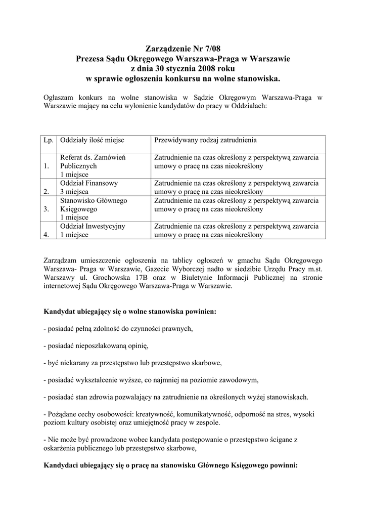Zarządzenie Nr 7/08 Prezesa Sądu Okręgowego Warszawa-Praga w Warszawie z dnia 30 stycznia 2008 roku w sprawie ogłoszenia konkursu na wolne stanowiska. Ogłaszam konkurs na wolne stanowiska w Sądzie Okręgowym Warszawa-Praga w Warszawie mający na celu wyłonienie kandydatów do pracy w Oddziałach: Lp. Oddziały ilość miejsc 1. 2. 3. 4. Referat ds. Zamówień Publicznych 1 miejsce Oddział Finansowy 3 miejsca Stanowisko Głównego Księgowego 1 miejsce Oddział Inwestycyjny 1 miejsce Przewidywany rodzaj zatrudnienia Zatrudnienie na czas określony z perspektywą zawarcia umowy o pracę na czas nieokreślony Zatrudnienie na czas określony z perspektywą zawarcia umowy o pracę na czas nieokreślony Zatrudnienie na czas określony z perspektywą zawarcia umowy o pracę na czas nieokreślony Zatrudnienie na czas określony z perspektywą zawarcia umowy o pracę na czas nieokreślony Zarządzam umieszczenie ogłoszenia na tablicy ogłoszeń w gmachu Sądu Okręgowego Warszawa- Praga w Warszawie, Gazecie Wyborczej nadto w siedzibie Urzędu Pracy m.st. Warszawy ul. Grochowska 17B oraz w Biuletynie Informacji Publicznej na stronie internetowej Sądu Okręgowego Warszawa-Praga w Warszawie. Kandydat ubiegający się o wolne stanowiska powinien: - posiadać pełną zdolność do czynności prawnych, - posiadać nieposzlakowaną opinię, - być niekarany za przestępstwo lub przestępstwo skarbowe, - posiadać wykształcenie wyższe, co najmniej na poziomie zawodowym, - posiadać stan zdrowia pozwalający na zatrudnienie na określonych wyżej stanowiskach. - Pożądane cechy osobowości: kreatywność, komunikatywność, odporność na stres, wysoki poziom kultury osobistej oraz umiejętność pracy w zespole. - Nie może być prowadzone wobec kandydata postępowanie o przestępstwo ścigane z oskarżenia publicznego lub przestępstwo skarbowe, Kandydaci ubiegający się o pracę na stanowisku Głównego Księgowego powinni: - spełniać warunki określone w art. 45 ust.2 ustawy z dnia 30 czerwca 2005 r. o finansach publicznych / Dz.U. Nr 249 poz. 2104 ze zm./ - posiadają umiejętność wypowiadania się na piśmie, znajomość techniki pracy biurowej, w tym umiejętność posługiwania się sprzętem komputerowym, - posiada zdolności analityczne, odporność na stres, prezentować wysoki poziom kultury osobistej, Zakres obowiązków: - prowadzenie rachunkowości sądu, - wykonywanie dyspozycji środkami pieniężnymi, - dokonywanie wstępnej kontroli zgodności operacji gospodarczych i finansowych z planem finansowym, - dokonywanie wstępnej kompletności i rzetelności dokumentów dotyczących operacji finansowych, - sprawowanie nadzoru nad podległymi jednostkami z zakresu sprawozdawczości i realizacji budżetu, - opracowywanie analiz ekonomicznych oraz innej korespondencji z zakresu powierzonych czynności. Kandydaci ubiegający się o pracę w Referacie ds. Zamówień Publicznych powinni spełniać wymagania: - wykształcenie wyższe - znajomość przepisów z zakresu zamówień publicznych, - co najmniej dwuletnie doświadczenie w zakresie stosowania procedur zamówień publicznych, - umiejętność pracy na komputerze ( obsługa programów Windows, Exel ), - umiejętność pracy w zespole, odporność na stres, zdolności analityczne, dokładność. Dodatkowe atuty: - staż pracy w sektorze publicznym, - ogólna wiedza z zakresu przepisów prawa cywilnego przydatna do wykonywania czynności z zakresu zamówień publicznych, - aktualne szkolenia z zamówień publicznych. Zakres obowiązków: - realizacja zamówień publicznych zgodnie z wymogami ustawy Prawo zamówień publicznych oraz przepisami wewnętrznymi sądu, - prowadzenie dokumentacji przetargowych, - udział w pracach komisji przetargowych, - przygotowywanie projektów umów, - przygotowywanie projektów korespondencji w powierzonych sprawach, - sporządzanie i przesyłanie ogłoszeń do Biuletynu UZP., - prowadzenie statystyk, rejestrów, sprawozdawczości. Kandydaci ubiegający się o pracę w Oddziale Finansowym (2 miejsca ) powinni spełniać wymagania: - wykształcenie wyższe, preferowane kierunki związane z finansami, - praktyczna znajomość rachunkowości budżetowej oraz procedur opracowania budżetu jednostki budżetowej, - znajomość przepisów ustawy o finansach publicznych, ustawy o rachunkowości oraz przepisów wykonawczych, - umiejętność pracy na komputerze ( obsługa podstawowych programów operacyjnych ), - umiejętność pracy w zespole. Dodatkowe atuty: - kilkuletni staż pracy w sektorze publicznym, - znajomość obsługi systemu operacyjnego TREZOR, - kreatywność, - komunikatywność w mowie i piśmie. Zakres obowiązków: - prowadzenie obsługi bankowej dysponenta II i III stopnia, - wykonywanie prac planistycznych, - monitorowanie i analizowanie gospodarki finansowej sądu okręgowego i podległych jednostek, - sporządzanie sprawozdawczości, - weryfikacja prawidłowości sprawozdawczości podległych jednostek, - monitorowanie przestrzegania dyscypliny finansów publicznych, - przygotowywanie materiałów do sporządzania projektów budżetu sądu okręgowego i podległych jednostek. Kandydaci ubiegający się o pracę w Oddziale Finansowym ( 1 miejsce ) powinni spełniać wymagania: - wykształcenie wyższe, preferowane kierunki związane z finansami, - posiadanie praktycznej wiedzy z zakresu obsługi kadrowo – płacowej, - znajomość przepisów z zakresu prawa pracy, przepisów podatkowych dotyczących osób fizycznych, przepisów z zakresu ubezpieczeń społecznych, ustawy o rachunkowości, - znajomość programu PŁATNIK, - umiejętność pracy na komputerze (obsługa podstawowych programów operacyjnych), - umiejętność pracy w zespole, kreatywność, zdolności analityczne. Dodatkowe atuty: - staż pracy w sektorze publicznym. Zakres obowiązków: - prowadzenie ewidencji i rozrachunków z tytułu wynagrodzeń oraz ZFŚS, - wykonywanie prac planistycznych oraz analizowanie gosp