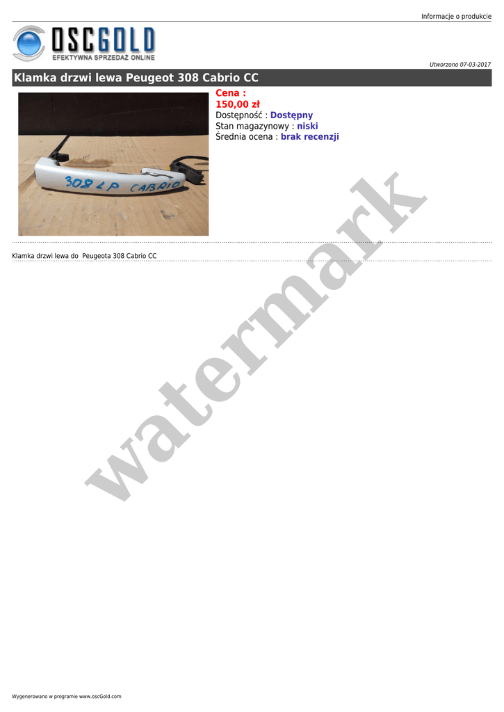 Informacje o produkcie Utworzono 07-03-2017 Klamka drzwi lewa Peugeot 308 Cabrio CC Cena : 150,00 zł er m ar k Dostępność : Dostępny Stan magazynowy : niski Średnia ocena : brak recenzji w at Klamka drzwi lewa do Peugeota 308 Cabrio CC Wygenerowano w programie www.oscGold.com