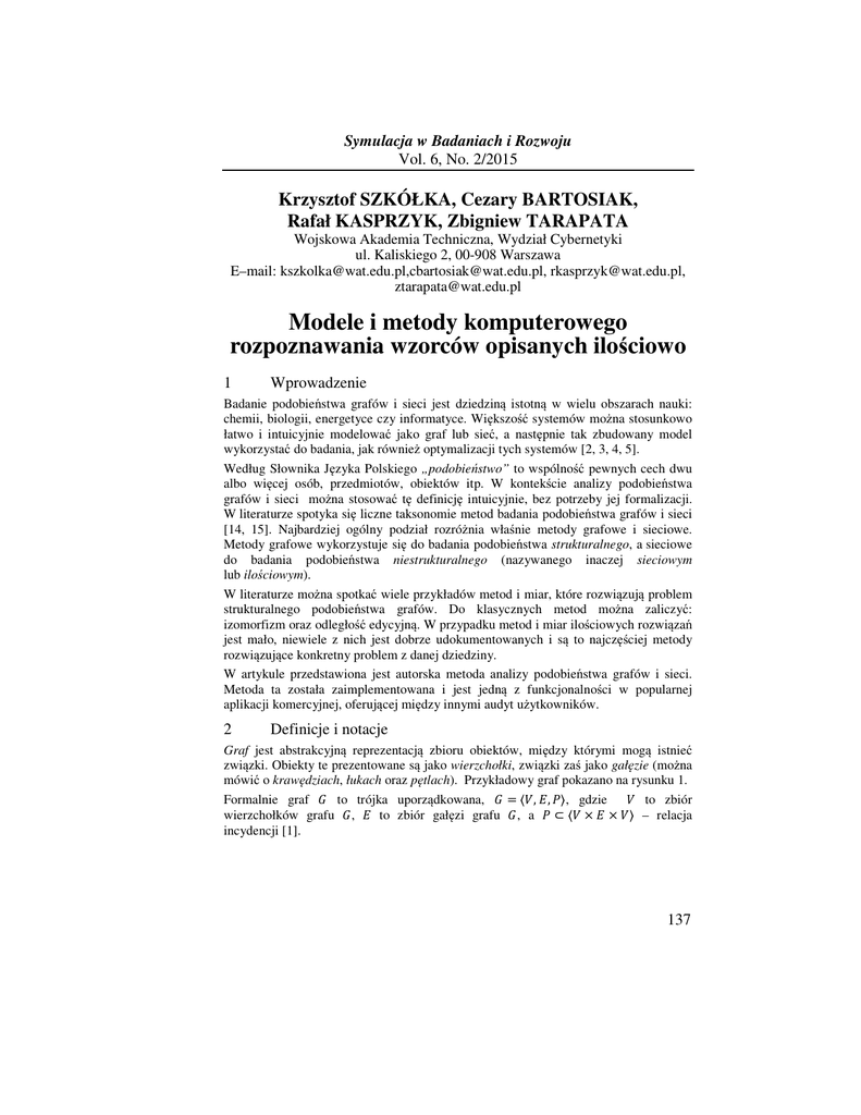 Symulacja w Badaniach i Rozwoju Vol. 6, No. 2/2015 Krzysztof SZKÓŁKA, Cezary BARTOSIAK, Rafał KASPRZYK, Zbigniew TARAPATA Wojskowa Akademia Techniczna, Wydział Cybernetyki ul. Kaliskiego 2, 00-908 Warszawa E–mail: [email protected],[email protected], [email protected], [email protected] Modele i metody komputerowego rozpoznawania wzorców opisanych ilościowo 1 Wprowadzenie Badanie podobieństwa grafów i sieci jest dziedziną istotną w wielu obszarach nauki: chemii, biologii, energetyce czy informatyce. Większość systemów można stosunkowo łatwo i intuicyjnie modelować jako graf lub sieć, a następnie tak zbudowany model wykorzystać do badania, jak również optymalizacji tych systemów [2, 3, 4, 5]. Według Słownika Języka Polskiego „podobieństwo” to wspólność pewnych cech dwu albo więcej osób, przedmiotów, obiektów itp. W kontekście analizy podobieństwa grafów i sieci można stosować tę definicję intuicyjnie, bez potrzeby jej formalizacji. W literaturze spotyka się liczne taksonomie metod badania podobieństwa grafów i sieci [14, 15]. Najbardziej ogólny podział rozróżnia właśnie metody grafowe i sieciowe. Metody grafowe wykorzystuje się do badania podobieństwa strukturalnego, a sieciowe do badania podobieństwa niestrukturalnego (nazywanego inaczej sieciowym lub ilościowym). W literaturze można spotkać wiele przykładów metod i miar, które rozwiązują problem strukturalnego podobieństwa grafów. Do klasycznych metod można zaliczyć: izomorfizm oraz odległość edycyjną. W przypadku metod i miar ilościowych rozwiązań jest mało, niewiele z nich jest dobrze udokumentowanych i są to najczęściej metody rozwiązujące konkretny problem z danej dziedziny. W artykule przedstawiona jest autorska metoda analizy podobieństwa grafów i sieci. Metoda ta została zaimplementowana i jest jedną z funkcjonalności w popularnej aplikacji komercyjnej, oferującej między innymi audyt użytkowników. 2 Definicje i notacje Graf jest abstrakcyjną reprezentacją zbioru obiektów, między którymi mogą istnieć związki. Obiekty te prezentowane są jako wierzchołki, związki zaś jako gałęzie (można mówić o krawędziach, łukach oraz pętlach). Przykładowy graf pokazano na rysunku 1. Formalnie graf to trójka uporządkowana, = ¤¥, , .¦, gdzie ¥ to zbiór wierzchołków grafu , to zbiór gałęzi grafu , a . ⊂ ¥ × × ¥ – relacja incydencji [1]. 137 Krzysztof SZKÓŁKA, Cezary BARTOSIAK, Rafał KASPRZYK, Zbigniew TARAPATA Rys. 1. Graf o 4 wierzchołkach i 4 kraw krawędziach [opracowanie własne] Fig. 1. Graph with 4 nodes and 4 edges [own preparation] Siecią nazywamy graf, który jest opisany ilościowo ilo (wierzchołki i gałęzie mogą mieć atrybuty, które je dodatkowo opisują). opisu Formalnie sieć § to trójka uporządkowana: §=¨ , ¯-∈ >,…,X³%µ, [ 9©;%[∈ >,…,X % , «¬- 9®;¯ Z∈ª ´∈- gdzie to graf, [ 9©;: ¥ → 5 , to i-ta funkcja opisana na wierzchołku grafu (a = 1, … , ±¶; ±¶ – liczba wszystkich funkcji opisanych na wierzchołkach grafu), ¬- 9®;: → 5 to j-ta funkcja opisana na gałęzi grafu ( ° = 1, … , ±²; ±² – liczba wszystkich funkcji opisanych na gałęziach gał grafu). Warto zauważyć, że każdy żdy graf jest siecią, sieci w której [ = ¬- = ·. Przykładem sieci może byćć więc wię graf z ponumerowanymi wierzchołkami i gałęziami (na zbiorze wierzchołków i gałęzi gałę są określone funkcje, których wartościami są numery). 3 Metody badania podobieństwa podobie grafów i sieci Metody badania podobieństwa ństwa moż można podzielić jak na rysunku 2. Rys. 2. Taksonomia miar podobieństwa podobień [opracowanie własne] Fig. 2. Taxonomy of similarity measures [own preparation] Miary strukturalne (ang. structural similarity measures) measures stosuje się zwykle do badania grafów, a ilościowe (ang. quantitative similarity measures) measures do badania sieci. W tych 138 Modele i metody komputerowego rozpoznawania wzorców opisanych ilościowo pierwszych porównywana jest jedynie topologia (struktura) systemu, natomiast miary ilościowe uwzględniają cechy opisane na wierzchołkach i gałęziach grafu. Do najważniejszych metod i miar badania podobieństwa strukturalnego można zaliczyć izomorfizm grafów, miary oparte na odległości edycyjnej, miary topologiczne i metody iteracyjne - strukturalne. Metody badania podobieństwa niestrukturalnego opierają się głównie na metodach iteracyjnych – ilościowych. Dalej przedstawione są wybrane metody i miary badania podobieństwa grafów i sieci. 3.1 Izomorfizm Jeśli pomiędzy dwoma grafami występuje izomorfizm, to są one strukturalnie nieodróżnialne. Formalnie grafy i ² nazywa się izomorficznymi, jeżeli istnieje bijekcja pomiędzy zbiorami ich wierzchołków: : ¥0 → ¥³ , gdzie: ¥0 – zbiór wierzchołków grafu , ¥³ – zbiór wierzchołków grafu ², taka że dwa dowolne wierzchołki ¸ i © w grafie są do siebie przyległe wtedy i tylko wtedy, gdy 9¸; i 9©; są przyległe w grafie ². Można również rozważać izomorfizm sieci, w takim przypadku muszą zostać zachowane atrybuty (wartości funkcji) wierzchołków i gałęzi. Przykładowe grafy izomorficzne przedstawione są na rysunku 3. Rys. 3. Grafy izomorficzne [opracowanie własne] Fig. 3. Isomorphic graphs [own preparation] Problem rozstrzygania izomorfizmu grafów [9] należy do klasy NP [6], dla których nie istnieje obecnie odpowiedź, czy należą one do podklasy problemów P czy NP– zupełnych. Miarami izomorficznymi nazywana jest grupa miar badania podobieństwa grafów, które korzystają z izomorfizmu do wyznaczenia wartości tych miar. Wśród metod badania izomorfizmu grafów za najlepsze uznawane są obecnie metoda E. M. Luksa [7] o złożoności czasowej ® ¹Uº9QlogQ;W oraz metoda B. D. McKaya [8] (złożoność czasową trudno jest oszacować, wiadomo, że jest ona wykładnicza). Warto zaznaczy