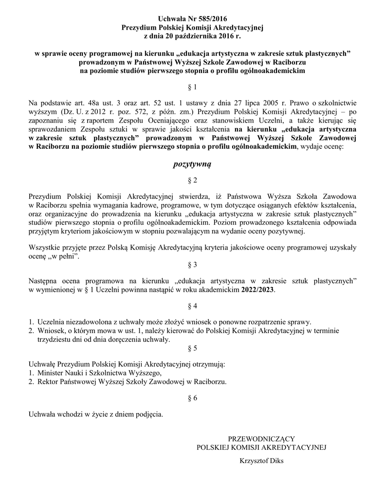 Uchwała Nr 585/2016 Prezydium Polskiej Komisji Akredytacyjnej z dnia 20 października 2016 r. w sprawie oceny programowej na kierunku „edukacja artystyczna w zakresie sztuk plastycznych” prowadzonym w Państwowej Wyższej Szkole Zawodowej w Raciborzu na poziomie studiów pierwszego stopnia o profilu ogólnoakademickim §1 Na podstawie art. 48a ust. 3 oraz art. 52 ust. 1 ustawy z dnia 27 lipca 2005 r. Prawo o szkolnictwie wyższym (Dz. U. z 2012 r. poz. 572, z późn. zm.) Prezydium Polskiej Komisji Akredytacyjnej – po zapoznaniu się z raportem Zespołu Oceniającego oraz stanowiskiem Uczelni, a także kierując się sprawozdaniem Zespołu sztuki w sprawie jakości kształcenia na kierunku „edukacja artystyczna w zakresie sztuk plastycznych” prowadzonym w Państwowej Wyższej Szkole Zawodowej w Raciborzu na poziomie studiów pierwszego stopnia o profilu ogólnoakademickim, wydaje ocenę: pozytywną §2 Prezydium Polskiej Komisji Akredytacyjnej stwierdza, iż Państwowa Wyższa Szkoła Zawodowa w Raciborzu spełnia wymagania kadrowe, programowe, w tym dotyczące osiąganych efektów kształcenia, oraz organizacyjne do prowadzenia na kierunku „edukacja artystyczna w zakresie sztuk plastycznych” studiów pierwszego stopnia o profilu ogólnoakademickim. Poziom prowadzonego kształcenia odpowiada przyjętym kryteriom jakościowym w stopniu pozwalającym na wydanie oceny pozytywnej. Wszystkie przyjęte przez Polską Komisję Akredytacyjną kryteria jakościowe oceny programowej uzyskały ocenę ,,w pełni”. §3 Następna ocena programowa na kierunku „edukacja artystyczna w zakresie sztuk plastycznych” w wymienionej w § 1 Uczelni powinna nastąpić w roku akademickim 2022/2023. §4 1. Uczelnia niezadowolona z uchwały może złożyć wniosek o ponowne rozpatrzenie sprawy. 2. Wniosek, o którym mowa w ust. 1, należy kierować do Polskiej Komisji Akredytacyjnej w terminie trzydziestu dni od dnia doręczenia uchwały. §5 Uchwałę Prezydium Polskiej Komisji Akredytacyjnej otrzymują: 1. Minister Nauki i Szkolnictwa Wyższego, 2. Rektor Państwowej Wyższej Szkoły Zawodowej w Raciborzu. §6 Uchwała wchodzi w życie z dniem podjęcia. PRZEWODNICZĄCY POLSKIEJ KOMISJI AKREDYTACYJNEJ Krzysztof Diks