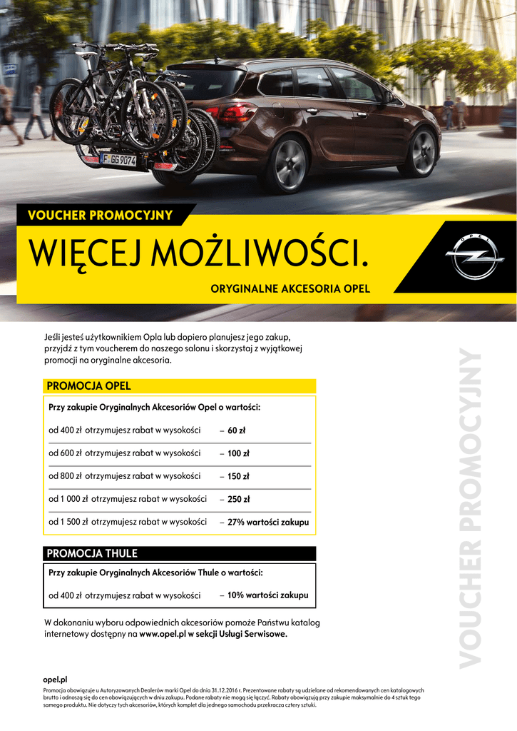 VOUCHER PROMOCYJNY WIĘCEJ MOŻLIWOŚCI. Jeśli jesteś użytkownikiem Opla lub dopiero planujesz jego zakup, przyjdź z tym voucherem do naszego salonu i skorzystaj z wyjątkowej promocji na oryginalne akcesoria. PROMOCJA OPEL Przy zakupie Oryginalnych Akcesoriów Opel o wartości: od 400 zł otrzymujesz rabat w wysokości – 60 zł od 600 zł otrzymujesz rabat w wysokości – 100 zł od 800 zł otrzymujesz rabat w wysokości – 150 zł od 1 000 zł otrzymujesz rabat w wysokości – 250 zł od 1 500 zł otrzymujesz rabat w wysokości – 27% wartości zakupu PROMOCJA THULE Przy zakupie Oryginalnych Akcesoriów Thule o wartości: od 400 zł otrzymujesz rabat w wysokości – 10% wartości zakupu W dokonaniu wyboru odpowiednich akcesoriów pomoże Państwu katalog internetowy dostępny na www.opel.pl w sekcji Usługi Serwisowe. opel.pl Promocja obowiązuje u Autoryzowanych Dealerów marki Opel do dnia 31.12.2016 r. Prezentowane rabaty są udzielane od rekomendowanych cen katalogowych brutto i odnoszą się do cen obowiązujących w dniu zakupu. Podane rabaty nie mogą się łączyć. Rabaty obowiązują przy zakupie maksymalnie do 4 sztuk tego samego produktu. Nie dotyczy tych akcesoriów, których komplet dla jednego samochodu przekracza cztery sztuki. VOUCHER PROMOCYJNY ORYGINALNE AKCESORIA OPEL