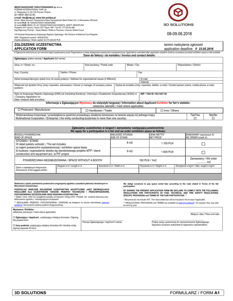 MIĘDZYNARODOWE TARGI POZNAŃSKIE sp. z o. o. POZNAŃ INTERNATIONAL FAIR Ltd. ul. Głogowska 14, 60-734 Poznań, Poland tel +48/61 869 22 85; e-mail: [email protected]; www.itm-polska.pl Konto / Bank account: Powszechna Kasa Oszczędności Bank Polski S.A. w Warszawie o/Poznań Nr konta PLN: 38 102040270000110204242962 Nr konta EUR (IBAN): PL 46 102040270000140210929075, SWIFT: BPKOPLPW Podatnik VAT czynny / Active VAT Payer, NIP / Tax ID: 777-00-00-488 Sąd Rejonowy Poznań – Nowe Miasto i Wilda w Poznaniu / Poznan District Court 08-09.06.2016 VIII Wydział Gospodarczy Krajowego Rejestru Sądowego / 8th Division of National Court Register KRS / Registered number: 0000202703 Kapitał zakładowy / Share capital: 42 310 200,00 PLN ZGŁOSZENIE UCZESTNICTWA APPLICATION FORM termin nadsyłania zgłoszeń application deadline # 23.05.2016 # Zgłoszenia dokonane po tym terminie będą rozpatrywane przez Organizatora w miarę dostępności powierzchni wystawienniczej. Applications submitted after application deadline shall be considered provided exhibition space is still available. Dane do faktury i do kontaktu / Invoice and contact details: Zgłaszający (pełna nazwa) / Applicant (full name): Ulica, nr / Street, no.: Kraj / Country: Kod pocztowy / Postal code: Miasto / City: Telefon / Phone: Województwo / District: Fax: Adres korespondencyjny (jeżeli inny niż wyżej podany) / Address for organizational issues (if different): Właściciel lub dyrektor firmy (imię i nazwisko, stanowisko) / Owner or manager of company (name, position): E-mail: Internet: Osoba do kontaktu (imię i nazwisko, telefon, e-mail) / Contact person (name, mobile phone, e-mail): Wpis do Krajowego Rejestru Sądowego (KRS) lub Centralnej Ewidencji i Informacji o Działalności Gospodarczej CEIDG) nr / Company registration no: Data i miejsce/ date and place: NIP / TAX ID / EU VAT ID: Informacje o Zgłaszającym-Wystawcy do statystyki targowej / Information about Applicant-Exhibitor for fair’s statistic: (właściwe zakreślić / mark where applicable) Producent / Manufacturer Handlowiec / Trader Inne / Others Wielonarodowa korporacja / przedsiębiorca (podmiot prowadzący działania biznesowe na terenie więcej niż jednego kraju) Multinational Corporation / Enterprise ( the entity conducting bussiness In more than one country) Tak/Yes Nie/No Zgłaszamy uczestnictwo w targach i zamawiamy następującą powierzchnię: We apply for a participation in a fair and we order exhibition space as follows: RODZAJ POWIERZCHNI KIND OF SPACE WIELKOŚĆ STOISKA SIZE OF STAND STOISKO / STAND W skład pakietu wchodzi: / The set includes: a) najem powierzchni wystawienniczej / exhibition space lease b) budowa i wyposażenie stoiska wg standardowego projektu MTP / stand construction and equipment acc. to PIF project POWIERZCHNIA NIEZABUDOWANA / SPACE WITHOUT A BOOTH Dane o największym eksponacie : Dimensions of the biggest exhibit : Długość w m / Length in m CENA NETTO* NET PRICE* 6 m2 1.100 PLN 9 m2 1.600 PLN 100 PLN / 1m2 Szerokość w m / Width in m ZAMAWIAMY (zaznaczyć X) WE ORDER (mark X) Wysokość w m / Height in m □ □ Zamawiamy / We order .............. m2 Obciążenie w kg/m2 / Max. weight in kg/m2 Należność z tytułu zamówienia powierzchni uregulujemy zgodnie z zasadami płatności określonymi w Warunkach Uczestnictwa. We oblige ourselves to pay space rental fees according to the rules stated in Terms of the fair participation. PODPISUJĄC NINIEJSZE ZGŁOSZENIE UCZESTNICTWA AKCEPTUJEMY JAKO OBOWIĄZUJACE: REGULAMIN DLA UCZESTNIKÓW TARGÓW, PRZEPISY TECHNICZNE I PRZECIWPOŻAROWE, POSTANOWIENIA SZCZEGÓŁOWE ORAZ WARUNKI UCZESTNICTWA. ** * Opłata / cena netto nie uwzględnia podatku od towarów i usług (VAT). Podatek ten zostanie doliczony przy fakturowaniu zgodnie z obowiązującymi przepisami. ** REGULAMIN, PRZEPISY, POSTANOWIENIA i WARUNKI są dostępne na stronie internetowej www.itmpolslka.pl Na życzenie zostaną wysłane drogą pocztową. BY SIGNING THE PRESENT APPLICATION FORM WE DECLARE TO COMPLY WITH THE FOLLOWING: REGULATIONS FOR PARTICIPANTS OF FAIR, TECHNICAL AND FIRE SAFETY REGULATIONS, SPECIFIC PROVISIONS and TERMS OF THE FAIR PARTICIPATION. ** Wystawca / Exhibitor (właściwe zaznaczyć / mark where applicable) Zgłaszający / Applicant , podpisujący niniejszy formularz / Signing the present form Inny podmiot, podpisujący odrębny formularz A0 / Another entity signing separate A0 form 3D SOLUTIONS * Net prices do not include VAT. The value added tax will be included in the invoice if applicable. ** REGULATIONS, PROVISIONS and TERMS are available at www.itm-polska.pl/. On request, they may also be sent by post. _________________________ Miejsce i data / Place and date ___________________________________ Pieczęć Zgłaszającego / Applicant’s stamp _____________________________________________ Podpis osoby uprawnionej do reprezentowania Zgłaszającego Signature of person authorised to Applicant’s representation FORMULARZ / FORM A1