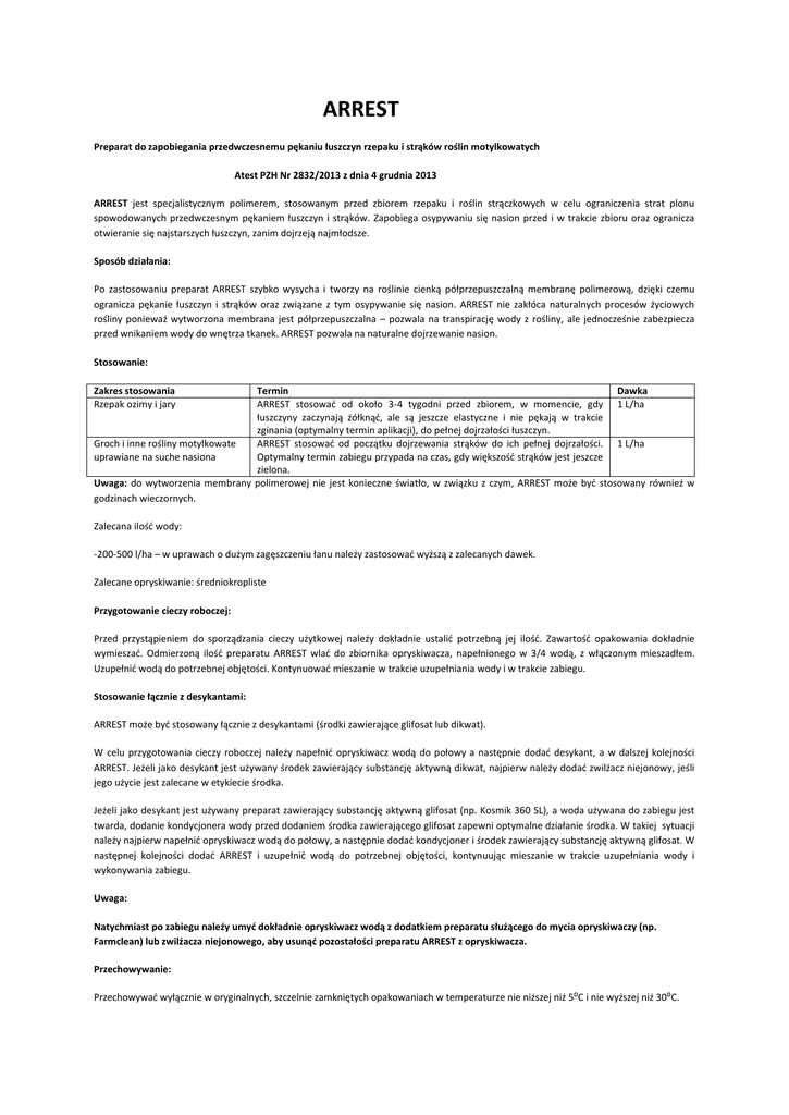 ARREST Preparat do zapobiegania przedwczesnemu pękaniu łuszczyn rzepaku i strąków roślin motylkowatych Atest PZH Nr 2832/2013 z dnia 4 grudnia 2013 ARREST jest specjalistycznym polimerem, stosowanym przed zbiorem rzepaku i roślin strączkowych w celu ograniczenia strat plonu spowodowanych przedwczesnym pękaniem łuszczyn i strąków. Zapobiega osypywaniu się nasion przed i w trakcie zbioru oraz ogranicza otwieranie się najstarszych łuszczyn, zanim dojrzeją najmłodsze. Sposób działania: Po zastosowaniu preparat ARREST szybko wysycha i tworzy na roślinie cienką półprzepuszczalną membranę polimerową, dzięki czemu ogranicza pękanie łuszczyn i strąków oraz związane z tym osypywanie się nasion. ARREST nie zakłóca naturalnych procesów życiowych rośliny ponieważ wytworzona membrana jest półprzepuszczalna – pozwala na transpirację wody z rośliny, ale jednocześnie zabezpiecza przed wnikaniem wody do wnętrza tkanek. ARREST pozwala na naturalne dojrzewanie nasion. Stosowanie: Zakres stosowania Rzepak ozimy i jary Termin Dawka ARREST stosować od około 3-4 tygodni przed zbiorem, w momencie, gdy 1 L/ha łuszczyny zaczynają żółknąć, ale są jeszcze elastyczne i nie pękają w trakcie zginania (optymalny termin aplikacji), do pełnej dojrzałości łuszczyn. Groch i inne rośliny motylkowate ARREST stosować od początku dojrzewania strąków do ich pełnej dojrzałości. 1 L/ha uprawiane na suche nasiona Optymalny termin zabiegu przypada na czas, gdy większość strąków jest jeszcze zielona. Uwaga: do wytworzenia membrany polimerowej nie jest konieczne światło, w związku z czym, ARREST może być stosowany również w godzinach wieczornych. Zalecana ilość wody: -200-500 l/ha – w uprawach o dużym zagęszczeniu łanu należy zastosować wyższą z zalecanych dawek. Zalecane opryskiwanie: średniokropliste Przygotowanie cieczy roboczej: Przed przystąpieniem do sporządzania cieczy użytkowej należy dokładnie ustalić potrzebną jej ilość. Zawartość opakowania dokładnie wymieszać. Odmierzoną ilość preparatu ARREST wlać do zbiornika opryskiwacza, napełnionego w 3/4 wodą, z włączonym mieszadłem. Uzupełnić wodą do potrzebnej objętości. Kontynuować mieszanie w trakcie uzupełniania wody i w trakcie zabiegu. Stosowanie łącznie z desykantami: ARREST może być stosowany łącznie z desykantami (środki zawierające glifosat lub dikwat). W celu przygotowania cieczy roboczej należy napełnić opryskiwacz wodą do połowy a następnie dodać desykant, a w dalszej kolejności ARREST. Jeżeli jako desykant jest używany środek zawierający substancję aktywną dikwat, najpierw należy dodać zwilżacz niejonowy, jeśli jego użycie jest zalecane w etykiecie środka. Jeżeli jako desykant jest używany preparat zawierający substancję aktywną glifosat (np. Kosmik 360 SL), a woda używana do zabiegu jest twarda, dodanie kondycjonera wody przed dodaniem środka zawierającego glifosat zapewni optymalne działanie środka. W takiej sytuacji należy najpierw napełnić opryskiwacz wodą do połowy, a następnie dodać kondycjoner i środek zawierający substancję aktywną glifosat. W następnej kolejności dodać ARREST i uzupełnić wodą do potrzebnej objętości, kontynuując mieszanie w trakcie uzupełniania wody i wykonywania zabiegu. Uwaga: Natychmiast po zabiegu należy umyć dokładnie opryskiwacz wodą z dodatkiem preparatu służącego do mycia opryskiwaczy (np. Farmclean) lub zwilżacza niejonowego, aby usunąć pozostałości preparatu ARREST z opryskiwacza. Przechowywanie: Przechowywać wyłącznie w oryginalnych, szczelnie zamkniętych opakowaniach w temperaturze nie niższej niż 5⁰C i nie wyższej niż 30⁰C. Przechowywać pod zamknięciem i chronić przed dziećmi. Nie przechowywać razem z żywnością, napojami i paszami dla zwierząt Środki ostrożności: ARREST zawiera: karboksylowany kopolimer styreno-butadienowy: 424 g/l Xi – produkt drażniący Działa drażniąco na oczy. Przechowywać pod zamknięciem i chronić przed dziećmi Unikać zanieczyszczenia skóry i oczu. Zanieczyszczone oczy przemyć natychmiast dużą ilością wody i zasięgnąć porady lekarza Zanieczyszczoną skórę natychmiast przemyć dużą ilością wody Nosić odpowiednią odzież ochronną, odpowiednie rękawice ochronne i okulary lub ochronę twarzy Producent : Intracrop (a Division of Brian Lewis Agriculture Ltd.), Park Chambers 10 Hereford Road, Abergavenny, Monmouth NP7 5PR, UK Podmiot wprowadzający preparat na terytorium Rzeczypospolitej Polskiej: Arysta LifeScience Polska Sp. z o.o., ul. Przasnyska 6B; 01-756 Warszawa, tel.: (22) 866 41 80; fax: (22) 866 41 90; e-mail: [email protected] Zawartość netto: ..... Nr partii: ..... Data ważności: 3 lata