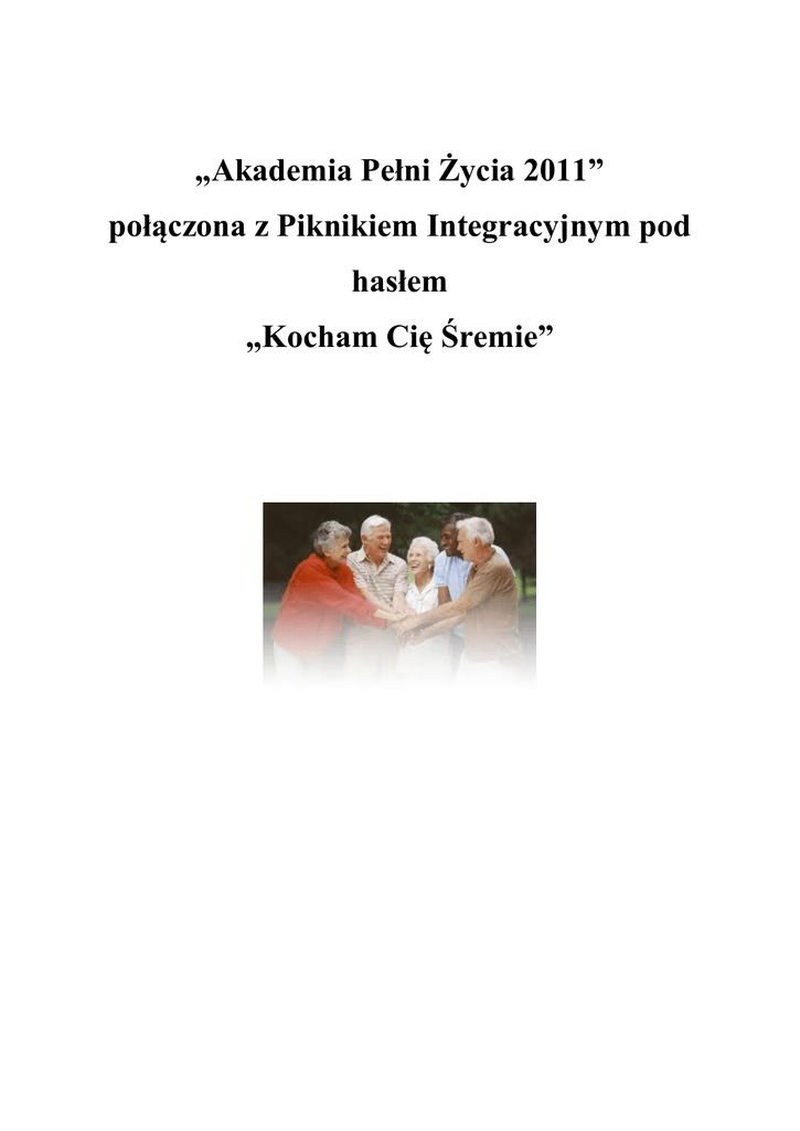 „Akademia Pełni Życia 2011” połączona z Piknikiem Integracyjnym pod hasłem „Kocham Cię Śremie” 1. Krótka charakterystyka projektu Projekt stanowi ofertę rozwoju form wsparcia śremskich seniorów zwłaszcza w zakresie przeciwdziałania wykluczeniu społecznemu i marginalizacji osób starszych. Projekt powstał w odpowiedzi na rzeczywiste zapotrzebowanie w tym zakresie i zakłada realizację spotkań dla śremskich seniorów w Klubie Relax działającym przy Spółdzielni Mieszkaniowej w Śremie oraz Pikniku Integracyjnego pod hasłem „Kocham Cię Śremie”. Podstawowym celem projektu jest aktywizacja osób starszych z terenu gminy Śrem. Założenie projektu są skorelowane z celami i kierunkami działań określonymi w Strategii Integracji i Rozwiązywania Problemów Społecznych w Gminie Śrem na lata 2008 – 2015 oraz Programem Wyrównywania Szans Osób Niepełnosprawnych i Przeciwdziałania Ich Wykluczeniu Społecznemu oraz Pomocy w Realizacji Zadań na rzecz Zatrudniania Osób Niepełnosprawnych w Województwie Wielkopolskim na lata 2007-2013. Nasz projekt wpisuje się także w Plan działań Rady Europy: podnoszenie jakości życia osób niepełnosprawnych w Europie 2006-2015 oraz w Europejską Strategię w sprawie Niepełnosprawności 2010-2020. Działania podejmowane w ramach projektu to brakujący element w systemie wsparcia osób starszych w gminie Śrem. Projekt poszerza i uatrakcyjnia dotychczasową ofertę pomocy skierowaną do seniorów i będzie odpowiedzią na realne potrzeby w tym zakresie. 2. Opis potrzeb wskazujących na konieczność realizacji projektu, opis ich przyczyn oraz skutków Systematyczne postępowanie zjawiska starzenia się społeczeństwa w naszej gminie, wymaga podjęcia, z odpowiednim wyprzedzeniem skutecznych działań zmierzających do stworzenia nowoczesnego sytemu zapobiegania wykluczeniu społecznemu ludzi starszych. Starzenie się populacji wraz z wydłużającą się średnią ludzkiego życia wpływa na obraz całego społeczeństwa: zmienia się skład członków rodzin, relacje między pokoleniami, rodzaj produkowanych dóbr i oferowanych usług. Pojawia się nowe pokolenie, stosunkowo młodych, aktywnych i zdrowych emerytów a w związku z tym konieczne staje się nadanie mu odpowiedniej roli społecznej i wykorzystania jego potencjału. W społeczeństwie globalnym ludzie starsi podporządkowani są sztywno swojej kategorii wiekowej. Ich dążenia, cele i potrzeby pozostają z reguły na drugim planie. Można zaryzykować stwierdzenie, że system wartości, który wykształcił się w społeczeństwach współczesnych, oparty m.in. na indywidualizacji życia, sprzyja wykluczeniu społecznemu osób w wieku starszym, ponadto powszechny kult młodości charakteryzujący się przedsiębiorczością, witalnością, egocentryzmem, sprawił, iż ludzie starsi zaczęli być postrzegani jako mało mobilni, spowalniający zmiany, a tym samym stanowią przeszkodę w osiąganiu postępu. W wielu krajach Europy Południowej i Zachodniej liczebność grupy osób w wieku 80 lat i starszych wzrasta w tempie 3-4%rocznie. Przewiduje się, że przez najbliższe 20 lat Europa stanie się najstarszym regionem świata. W roku 1993 ludzie w wieku 60 lat i starsi reprezentowali 1/5 całościowej populacji 15 krajów członkowskich Unii Europejskiej, do roku 2020 liczyć będą ponad 1/4 populacji. Także w Polsce zauważalny jest proces wzrostu populacji osób starszych w społeczeństwie. Obecnie osoby starsze, w wieku 65+ w naszym kraju stanowią 13% społeczeństwa, co zalicza nas do jednego z najmłodszych europejskich krajów. Podobnie sytuacja przedstawia się w naszej gminie. Dane Urzędu Miejskiego w Śremie wskazują na znaczny wzrost liczby ludności w wieku poprodukcyjnym - w mieście jest to 12 %, a na wsiach około 16 % osób starszych ( źródło: strona internetowa www.srem.pl) Najczęściej narażone są na społeczną marginalizację są osoby starsze, które są jednocześnie: schorowane i niepełnosprawne, słabo wykształcone, samotne i osamotnione. Potwierdzają to również dane Ośrodka Pomocy Społecznej w Śremie z których wynika, że liczba osób korzystających z pomocy zarówno z powodu niepełnosprawności jak i długotrwałej choroby wzrasta z roku na rok. W 2009 roku z powodu niepełnosprawności korzystały ze wsparcia Ośrodka zarówno w formie pieniężnej jak i niepieniężnej 354 osoby, natomiast w 2010 roku było to już 470 osób. Z powodu długotrwałej choroby były to w 2009 roku 356 osoby, a w 2010 382 osoby. ( źródło: sprawozdanie z działalności Ośrodka Pomocy Społecznej w Śremie za 2010 rok). W związku z powyższym należy podjąć działania ukierunkowane na zwalczanie przyczyn wykluczenia społecznego osób starszych. Wiedza na temat silnego związku zachodzącego między wiekiem a powszechnością występowania niektórych ograniczeń powinna skłaniać do przekształceń zmierzających do zwiększenia dostępności, kompleksowości i efektywności oferowanych usług oraz skuteczności działań zapobiegających niedołęstwu starczemu i marginalizacji. Zwiększona skłonność starszych ludzi do zachorowań i urazów w połączeniu ze stałym powiększaniem się tej grupy wiekowej prowadzi do wzrostu zapotrzebowania na usługi związane z promowaniem zdrowego, aktywnego stylu życia oraz usługi związane z zagospodarowaniem czasu wolnego. Celem naszego projektu jest wsparcie osób starszych w zwalczaniu wykluczenia społecznego poprzez aktywne uczestnictwo w życiu społecznym. Realizacja projektu umożliwi podnoszenie jakości życia, kształtowanie zdrowego stylu życia i utrzymywanie kontaktów społecznych, dzięki którym seniorzy mają poczucie przynależności do grupy oraz lepszą kondycję psychospołeczną. Projekt umożliwi osobom starszym pełne uczestnictwo w życiu społecznym i będzie jednym z elementów budowania lokalnego systemu wsparcia seniorów w naszej gminie dos