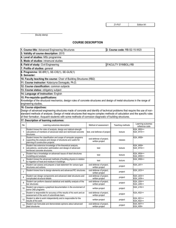 Z1-PU7 Edition N1 (faculty stamp) COURSE DESCRIPTION 1. Course title: Advanced Engineering Structures 2. Course code: RB-S2-15-W23 3. Validity of course description: 2015 4. Level of studies: MSc programme 5. Mode of studies: intramural studies 6. Field of study: Civil Engineering (FACULTY SYMBOL) RB 7. Profile of studies: general 8. Programme: SE-BR(1), SE-CIS(1), SE-GUS(1) 9. Semester: 10. Faculty teaching the course: Chair of Building Structures (RB2) 11. Course instructor: Katarzyna Domagała, Ph.D. 12. Course classification: common subjects 13. Course status: obligatory subject 14. Language of instruction: English 15. Pre-requisite qualifications: Knowledge of the structural mechanics, design rules of concrete structures and design of metal structures in the range of engineering studies. 16. Course objectives: Design of advanced engineering structures made of concrete and identify of technical problems that require the use of nonstandard methods of analysis. Design of metal structures that require complex methods of calculation and the specific rules of their formation. Acquaint students with some methods of corrosion diagnostic of building structures. 17. Description of learning outcomes: No 1 2 3 4 5 6 7 8 9 10 11 12 13 Learning outcomes description Method of assessment Student knows the rules of analysis, design and statical-strength calculations of members of advanced steel and reinforced concrete test, oral defense of project structures. Student knows the classification and scope of computer programs oral defense of project, supporting the analysis and design of structures and useful for written project planning of construction projects. Student has extensive knowledge of the theoretical analysis, calculations, construction optimization and design of advenced test reinforced concrete structures. Student has a knowledge on advanced issues of steel structures test modelling and analysis. Student knows the advanced methods of building physics in relation test to migration of heat and moisture in buildings. Student can assess and prepare a load statement for variuos type oral defense of project, structures and actions. written project Student knows how to design elements and advanced RC structures. oral defense of project, written project Student can design components and advanced steel structures and oral defense of project, complicated structural details written project Student can perform classical statistical and stability analysis of the oral defense of project, bar structures written project Student can prepare a graphical documentation in the enviroment of written project some CAD programs Student is responsible for accuracy of the results of his work and an oral defense of project, assessment of the work of subordinate team. written project Student is able to work independently and is responsible for the written project results of the work Student can formulate and demonstrate opinions about advanced oral defense of project, steel structures written project Teaching methods lecture classes lecture lecture lecture project project project project project project project project Learning outcomes reference code K2A_W02++ K2A_W14++ K2A_W08+ K2A_W09+ K2A_W16++ K2A_W04++ K2A_W09++ K2A_W06++ K2A_U01+ K2A_U03++ K2A_U03++ K2A_U09++ K2A_U04++ K2A_U06++ K2A_U16++ K2A_K02++ K2A_K01++ K2A_K02++ K2A_K07++ K2A_K09+ 18. Teaching modes and hours: lecture: 40, classes: 5, project: 30, 19. Syllabus description: Lecture: Concrete structures: Bending stiffness of reinforced concrete, the redistribution of bending moments, destruction limit state - plastic analysis, static and kinematic approach, the method of plastic balancing moments applied to slabs and beams, ultimate limit theory of slabs, principles of calculation, the method of virtual work and limit equilibrium, vaulted and tension work of cross-reinforced slabs, estimating the ultimate limits of frames using a kinematic method, ultimate limit of slab floor, twisted elements, beams monolithically connected with the slab, beams curved in plan, torsion stiffness of cracked elements. Steel structures: Crane girders: shaping, loads, calculation, fatigue. Semi-rigid joints in steel bar structures, design, modelling, classification, rotational stiffness. Influence of semi-rigidity on the behaviour of lattice structures. Welding stress and strain, shaping principles of elements, types of welding distortion and methods to reduce them. Corrugated plates as a part of bracing system, calculation, shaping and examples of design solutions. Repairing, rebuilding and strengthening of the steel structures. Plate girders with corrugated web: shaping and design. Durability of structures: Fundamentals of building structures durability. Durability of reinforced concrete according to EC2. The degradation of concrete in aggressive environments (corrosion I, II and III group). The causes and course of the reinforcement corrosion in concrete (carbonation, chlorides). Methods of corrosion diagnostic of building structures. Classes: Concrete structures: Discussion of principles of the project concerning the reinforced concrete slabs and beams. Steel structures: Discussion of the preliminary project of the hall with transport. Durability of structures: Discussion of the methodology of the project concerning the reinforced concrete corrosion tests. Project: Concrete structures: a) statical-strength calculations in range of elasticity analysis of reinforced beam and slab, b) analysis of ultimate limit state of continuous RC beam, c) estimating the limit load of selected slabs with the bends lines. Steel structures: Preliminary project of the hall with transport. Static-strength calculations of solid-web crane girder; design drawing of crane girder. Durability of structures: The project concerns the assessment of corrosion risk of reinforced concrete structures. The probability of the reinforcement corrosion and tests of the protective properties of concrete are anal