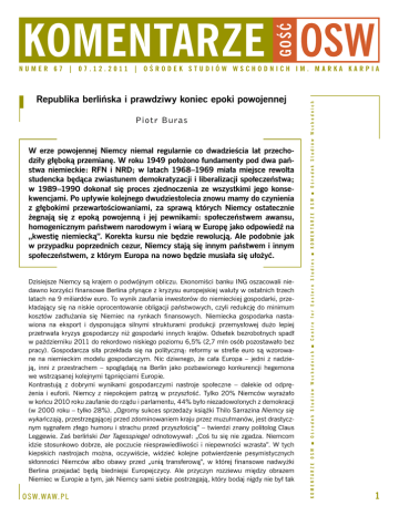 G OŚ Ć Komentarze osw O S W. W A W. P L S t u d i ó w O ś r o d e k OSW KOMENTARZE S t u d i e s E a s t e r n f o r C e n t r e Ws c h o d n i c h S t u d i ó w Dzisiejsze Niemcy są krajem o podwójnym obliczu. Ekonomiści banku ING oszacowali niedawno korzyści finansowe Berlina płynące z kryzysu europejskiej waluty w ostatnich trzech latach na 9 miliardów euro. To wynik zaufania inwestorów do niemieckiej gospodarki, przekładający się na niskie oprocentowanie obligacji państwowych, czyli redukcję do minimum kosztów zadłużania się Niemiec na rynkach finansowych. Niemiecka gospodarka nastawiona na eksport i dysponująca silnymi strukturami produkcji przemysłowej dużo lepiej przetrwała kryzys gospodarczy niż gospodarki innych krajów. Odsetek bezrobotnych spadł w październiku 2011 do rekordowo niskiego poziomu 6,5% (2,7 mln osób pozostawało bez pracy). Gospodarcza siła przekłada się na polityczną: reformy w strefie euro są wzorowane na niemieckim modelu gospodarczym. Nic dziwnego, że cała Europa – jedni z nadzieją, inni z przestrachem – spoglądają na Berlin jako pozbawionego konkurencji hegemona we wstrząsanej kolejnymi tąpnięciami Europie. Kontrastują z dobrymi wynikami gospodarczymi nastroje społeczne – dalekie od odprężenia i euforii. Niemcy z niepokojem patrzą w przyszłość. Tylko 20% Niemców wyrażało w końcu 2010 roku zaufanie do rządu i parlamentu, 44% było niezadowolonych z demokracji (w 2000 roku – tylko 28%). „Ogromy sukces sprzedaży książki Thilo Sarrazina Niemcy się wykańczają, przestrzegającej przed zdominowaniem kraju przez muzułmanów, jest drastycznym sygnałem złego humoru i strachu przed przyszłością” – twierdzi znany politolog Claus Leggewie. Zaś berliński Der Tagesspiegel odnotowywał: „Coś tu się nie zgadza. Niemcom idzie stosunkowo dobrze, ale poczucie niesprawiedliwości i niepewności wzrasta”. W tych kiepskich nastrojach można, oczywiście, widzieć kolejne potwierdzenie pesymistycznych skłonności Niemców albo obawy przed „unią transferową”, w której finansowe nadwyżki Berlina przejadać będą biedniejsi Europejczycy. Ale przyczyn rozziewu między obrazem Niemiec w Europie a tym, jak Niemcy sami siebie postrzegają, który bodaj nigdy nie był tak O ś r o d e k W erze powojennej Niemcy niemal regularnie co dwadzieścia lat przechodziły głęboką przemianę. W roku 1949 położono fundamenty pod dwa państwa niemieckie: RFN i NRD; w latach 1968–1969 miała miejsce rewolta studencka będąca zwiastunem demokratyzacji i liberalizacji społeczeństwa; w 1989–1990 dokonał się proces zjednoczenia ze wszystkimi jego konsekwencjami. Po upływie kolejnego dwudziestolecia znowu mamy do czynienia z głębokimi przewartościowaniami, za sprawą których Niemcy ostatecznie żegnają się z epoką powojenną i jej pewnikami: społeczeństwem awansu, homogenicznym państwem narodowym i wiarą w Europę jako odpowiedź na „kwestię niemiecką”. Korekta kursu nie będzie rewolucją. Ale podobnie jak w przypadku poprzednich cezur, Niemcy stają się innym państwem i innym społeczeństwem, z którym Europa na nowo będzie musiała się ułożyć. OSW Piotr Buras KOMENTARZE Republika berlińska i prawdziwy koniec epoki powojennej Ws c h o d n i c h numer 67 | 07.12.2011 | ośrodek studiów wschodnich im. marka karpia 1 G OŚ Ć Komentarze osw n u m e r 6 7 | 0 7 . 1 2 . 2 0 1 1 | o ś r o d e k s t u d i ó w w s c h o d n i c h i m . m a r ka ka r p i a wyraźny, szukać należy głębiej. Dwadzieścia lat po zjednoczeniu Republika Federalna znajduje się w ważnym momencie zwrotnym, któremu towarzyszą napięcia i obawy. Bez ich zrozumienia nie sposób wyjaśnić ambiwalencji w obrazie dzisiejszych Niemiec w Europie. Kryzys społeczeństwa awansu Strach Niemców przed tym, że uginająca się pod ciężarem długów Europa prędzej czy później przejdzie na ich utrzymanie, to nie tylko wyraz niechęci do dzielenia się bogactwem z krajami znanymi z niegospodarności. Jego głębsze źródło leży w rzeczywistości społeczno-gospodarczej ostatniego dziesięciolecia, która rzuca cień na doskonałe wskaźniki wzrostu i bilansu handlowego. Pod koniec ubiegłego stulecia Niemcy uchodziły za odd man of Europe: kraj przytłoczony ciężarem państwa socjalnego i niewydolności ekonomicznej. Odnowa gospodarki, jaka nastąpiła w następnej dekadzie, miała różne źródła. Jednym było wprowadzenie wspólnej waluty, która – za sprawą stabilizacji kursów, dopasowania (przynajmniej we wczesnym okresie) wysokości stóp procentowych do potrzeb niemieckiej gospodarki oraz boomu konsumpcji (na kredyt) w krajach europejskiego Południa – przyczyniła się do doskonałych wyników niemieckiego eksportu w ostatnich latach. Pozytywny efekt przyniosło także rozszerzenie UE na wschód. To właśnie eksport był kołem zamachowym wzrostu PKB. W stosunku do 2000 roku wartość niemieckiego eksportu niemal się podwoiła. Jeśli wówczas eksport i import były zrównoważone, to dzisiaj nadwyżka eksportowa wynosi ponad 200 mld euro. Drugim czynnikiem była wstrzemięźliwość w żądaniach płacowych, jaką wykazywali się pracownicy i związki zawodowe. Płace w Niemczech nie rosły – mimo wzrostu produktywności gospodarki – przez całą dekadę, dopiero w 2010 roku odnotowano niewielki ich wzrost. Konkurencyjność Niemiec na rynkach zagranicznych w bardzo dużym stopniu opierała się właśnie na relatywnie niskich kosztach pracy. Po trzecie, pozytywnie zadziałały także reformy wdrożone jeszcze przez rząd Gerharda Schrödera w ramach pakietu Agenda 2010 z 2003 roku. Ich skutkiem było nie tylko uelastycznienie rynku pracy, lecz także powstanie dużego, obejmującego dzisiaj 4,6 mln pracowników (ponad 20% zatrudnionych), sektora pracy niskopłatnej. Niemiecki sukces gospodarczy Dodatkowo wzmocnił on konkurencyjność niemieckich produktów eksportowych. w 