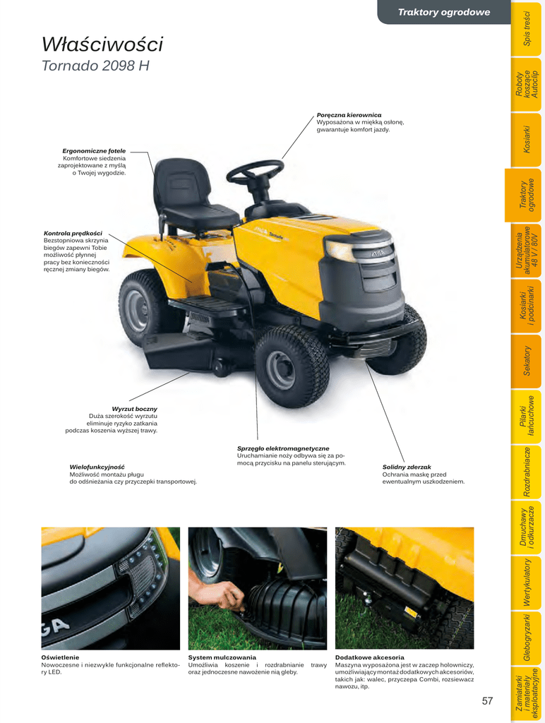 :ĄDĝFLZRĝFL Roboty koszące Autoclip 7RUQDGR+ Spis treści Traktory ogrodowe Kosiarki 3RUÛF]QDNLHURZQLFD Wyposażona w miękką osłonę, gwarantuje komfort jazdy. Urządzenia akumulatorowe 48 V / 80V Traktory ogrodowe (UJRQRPLF]QHIRWHOH Komfortowe siedzenia zaprojektowane z myślą o Twojej wygodzie. Pilarki łańcuchowe Sekatory Kosiarki i podcinarki .RQWURODSUÛGNRĝFL Bezstopniowa skrzynia biegów zapewni Tobie możliwość płynnej pracy bez konieczności ręcznej zmiany biegów. Solidny zderzak Ochrania maskę przed ewentualnym uszkodzeniem. Oświetlenie Nowoczesne i niezwykle funkcjonalne reflektory LED. System mulczowania Umożliwia koszenie i rozdrabnianie oraz jednoczesne nawożenie nią gleby. trawy Dodatkowe akcesoria Maszyna wyposażona jest w zaczep holowniczy, umożliwiający montaż dodatkowych akcesoriów, takich jak: walec, przyczepa Combi, rozsiewacz nawozu, itp. 55 57 Zamiatarki i materiały Glebogryzarki Wertykulatory eksploatacyjne Dmuchawy i odkurzacze :LHORIXQNF\MQRĝÉ Możliwość montażu pługu do odśnieżania czy przyczepki transportowej. 6SU]ÛJĄRHOHNWURPDJQHW\F]QH Uruchamianie noży odbywa się za pomocą przycisku na panelu sterującym. Rozdrabniacze Wyrzut boczny Duża szerokość wyrzutu eliminuje ryzyko zatkania podczas koszenia wyższej trawy.
