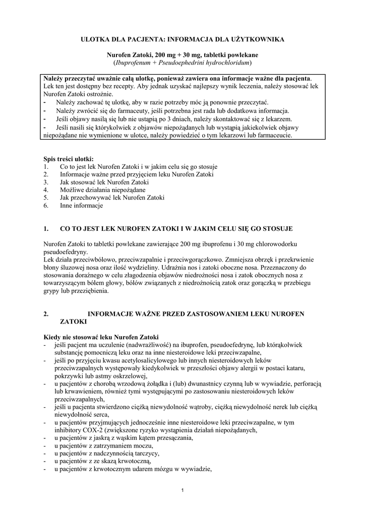 ULOTKA DLA PACJENTA: INFORMACJA DLA UŻYTKOWNIKA Nurofen Zatoki, 200 mg + 30 mg, tabletki powlekane (Ibuprofenum + Pseudoephedrini hydrochloridum) Należy przeczytać uważnie całą ulotkę, ponieważ zawiera ona informacje ważne dla pacjenta. Lek ten jest dostępny bez recepty. Aby jednak uzyskać najlepszy wynik leczenia, należy stosować lek Nurofen Zatoki ostrożnie. Należy zachować tę ulotkę, aby w razie potrzeby móc ją ponownie przeczytać. Należy zwrócić się do farmaceuty, jeśli potrzebna jest rada lub dodatkowa informacja. Jeśli objawy nasilą się lub nie ustąpią po 3 dniach, należy skontaktować się z lekarzem. Jeśli nasili się którykolwiek z objawów niepożądanych lub wystąpią jakiekolwiek objawy niepożądane nie wymienione w ulotce, należy powiedzieć o tym lekarzowi lub farmaceucie. Spis treści ulotki: 1. Co to jest lek Nurofen Zatoki i w jakim celu się go stosuje 2. Informacje ważne przed przyjęciem leku Nurofen Zatoki 3. Jak stosować lek Nurofen Zatoki 4. Możliwe działania niepożądane 5. Jak przechowywać lek Nurofen Zatoki 6. Inne informacje 1. CO TO JEST LEK NUROFEN ZATOKI I W JAKIM CELU SIĘ GO STOSUJE Nurofen Zatoki to tabletki powlekane zawierające 200 mg ibuprofenu i 30 mg chlorowodorku pseudoefedryny. Lek działa przeciwbólowo, przeciwzapalnie i przeciwgorączkowo. Zmniejsza obrzęk i przekrwienie błony śluzowej nosa oraz ilość wydzieliny. Udrażnia nos i zatoki oboczne nosa. Przeznaczony do stosowania doraźnego w celu złagodzenia objawów niedrożności nosa i zatok obocznych nosa z towarzyszącym bólem głowy, bólów związanych z niedrożnością zatok oraz gorączką w przebiegu grypy lub przeziębienia. 2. INFORMACJE WAŻNE PRZED ZASTOSOWANIEM LEKU NUROFEN ZATOKI Kiedy nie stosować leku Nurofen Zatoki - jeśli pacjent ma uczulenie (nadwrażliwość) na ibuprofen, pseudoefedrynę, lub którąkolwiek substancję pomocniczą leku oraz na inne niesteroidowe leki przeciwzapalne, - jeśli po przyjęciu kwasu acetylosalicylowego lub innych niesteroidowych leków przeciwzapalnych występowały kiedykolwiek w przeszłości objawy alergii w postaci kataru, pokrzywki lub astmy oskrzelowej, - u pacjentów z chorobą wrzodową żołądka i (lub) dwunastnicy czynną lub w wywiadzie, perforacją lub krwawieniem, również tymi występującymi po zastosowaniu niesteroidowych leków przeciwzapalnych, - jeśli u pacjenta stwierdzono ciężką niewydolność wątroby, ciężką niewydolność nerek lub ciężką niewydolność serca, - u pacjentów przyjmujących jednocześnie inne niesteroidowe leki przeciwzapalne, w tym inhibitory COX-2 (zwiększone ryzyko wystąpienia działań niepożądanych, - u pacjentów z jaskrą z wąskim kątem przesączania, - u pacjentów z zatrzymaniem moczu, - u pacjentów z nadczynnością tarczycy, - u pacjentów z ze skazą krwotoczną, - u pacjentów z krwotocznym udarem mózgu w wywiadzie, 1 - u pacjentów z czynnikami ryzyka, mogącymi zwiększać prawdopodobieństwo wystąpienia krwotocznego udaru mózgu, na przykład przyjmującymi leki zwężające naczynia krwionośne lub inne leki zmniejszające przekrwienie, stosowane doustnie lub do jamy nosowej. Leku nie wolno stosować kobietom w okresie ciąży lub karmienia piersią. Kiedy zachować szczególną ostrożność stosując lek Nurofen Zatoki - gdy występuje toczeń rumieniowaty układowy oraz mieszana choroba tkanki łącznej, - jeśli stwierdzono objawy reakcji alergicznych po przyjęciu kwasu acetylosalicylowego, - w chorobach przewodu pokarmowego oraz przewlekłych zapalnych chorobach jelit (wrzodziejące zapalenie jelita grubego, choroba Leśniowskiego, choroba Crohna), - jeśli stwierdzono zaburzenia rytmu serca, nadciśnienie tętnicze, zawał mięśnia sercowego lub niewydolność serca, - jeśli stwierdzono objawy zaburzeń neurologicznych, - jeśli stwierdzono niewydolność nerek, - jeśli stwierdzono zaburzenia czynności wątroby, - jeśli stwierdzono astmę oskrzelową lub chorobę alergiczną (lek może wywołać skurcz oskrzeli), - jeśli stwierdzono cukrzycę, - jeśli stwierdzono niedrożność szyi pęcherza moczowego, - jeśli stwierdzono zwężenie odźwiernika, - jeśli stwierdzono łagodny rozrost gruczołu krokowego, - gdy występuje jaskra. Istnieje ryzyko wystąpienia krwotoku z przewodu pokarmowego, owrzodzenia lub perforacji, które może być śmiertelne i które niekoniecznie musi być poprzedzone objawami ostrzegawczymi lub może wystąpić u pacjentów, u których takie objawy ostrzegawcze występowały. W razie wystąpienia krwotoku z przewodu pokarmowego czy owrzodzenia, należy natychmiast odstawić lek. Pacjenci z chorobami przewodu pokarmowego w wywiadzie, szczególnie osoby w wieku podeszłym, powinni poinformować lekarza o wszelkich nietypowych objawach dotyczących układu pokarmowego (szczególnie o krwawieniu), zwłaszcza w początkowym okresie terapii. Jednoczesne, długotrwałe stosowanie różnych leków przeciwbólowych może prowadzić do uszkodzenia nerek z ryzykiem niewydolności nerek (nefropatia postanalgetyczna). Przyjmowanie takich leków jak ibuprofen może być związane z niewielkim zwiększeniem ryzyka ataku serca (zawał serca) lub udaru. Ryzyko to zwiększa długotrwałe przyjmowanie dużych dawek leku. Nie należy stosować większych dawek i dłuższego czasu leczenia niż zalecane. Jeśli objawy się utrzymują, nasilają lub nie ustąpią po 3 dniach lub, jeśli wystąpią nowe objawy, należy skontaktować się z lekarzem. W przypadku kłopotów z sercem, przebytego udaru, lub podejrzewania, że występuje ryzyko tych zaburzeń (np. podwyższone ciśnienie krwi, cukrzyca, zwiększone stężenie cholesterolu, palenie tytoniu) należy omówić sposób leczenia z lekarzem lub farmaceutą. Ciężkie reakcje skórne, niektóre z nich śmiertelne, włączając zapalenie skóry złuszczające, zespół Stevensa-Johnsona i toksyczne martwicze oddzielanie się naskórka były bardzo 