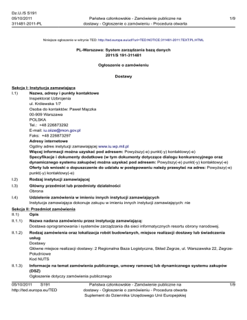 Dz.U./S S191 05/10/2011 311481-2011-PL Państwa członkowskie - Zamówienie publiczne na dostawy - Ogłoszenie o zamówieniu - Procedura otwarta 1/9 Niniejsze ogłoszenie w witrynie TED: http://ted.europa.eu/udl?uri=TED:NOTICE:311481-2011:TEXT:PL:HTML PL-Warszawa: System zarządzania bazą danych 2011/S 191-311481 Ogłoszenie o zamówieniu Dostawy Sekcja I: Instytucja zamawiająca I.1) Nazwa, adresy i punkty kontaktowe Inspektorat Uzbrojenia ul. Królewska 1/7 Osoba do kontaktów: Paweł Mączka 00-909 Warszawa POLSKA Tel.: +48 226873292 E-mail: [email protected] Faks: +48 226873297 Adresy internetowe Ogólny adres instytucji zamawiającej www.iu.wp.mil.pl Więcej informacji można uzyskać pod adresem: Powyższy(-e) punkt(-y) kontaktowy(-e) Specyfikacje i dokumenty dodatkowe (w tym dokumenty dotyczące dialogu konkurencyjnego oraz dynamicznego systemu zakupów) można uzyskać pod adresem: Powyższy(-e) punkt(-y) kontaktowy(-e) Oferty lub wnioski o dopuszczenie do udziału w postępowaniu należy przesyłać na adres: Powyższy(-e) punkt(-y) kontaktowy(-e) I.2) Rodzaj instytucji zamawiającej I.3) Główny przedmiot lub przedmioty działalności Obrona I.4) Udzielenie zamówienia w imieniu innych instytucji zamawiających Instytucja zamawiająca dokonuje zakupu w imieniu innych instytucji zamawiających: nie Sekcja II: Przedmiot zamówienia II.1) Opis II.1.1) Nazwa nadana zamówieniu przez instytucję zamawiającą: Dostawa oprogramowania i systemów zarządzania dla sieci informatycznych resortu obrony narodowej. II.1.2) Rodzaj zamówienia oraz lokalizacja robót budowlanych, miejsce realizacji dostawy lub świadczenia usług Dostawy Główne miejsce realizacji dostawy: 2 Regionalna Baza Logistyczna, Skład Zegrze, ul. Warszawska 22, ZegrzePołudniowe Kod NUTS II.1.3) Informacje na temat zamówienia publicznego, umowy ramowej lub dynamicznego systemu zakupów (DSZ) Ogłoszenie dotyczy zamówienia publicznego 05/10/2011 S191 http://ted.europa.eu/TED Państwa członkowskie - Zamówienie publiczne na dostawy - Ogłoszenie o zamówieniu - Procedura otwarta Suplement do Dziennika Urzędowego Unii Europejskiej 1/9 Dz.U./S S191 05/10/2011 311481-2011-PL Państwa członkowskie - Zamówienie publiczne na dostawy - Ogłoszenie o zamówieniu - Procedura otwarta 2/9 II.1.4) Informacje na temat umowy ramowej II.1.5) Krótki opis zamówienia lub zakupu Przedmiotem zamówienia jest: — dostawa sprzętu i oprogramowania zabezpieczającego środowisko sieciowe, — dostawa orogramowania i sprzętu do rozbudowy eksploatowanego systemu zarządzania w siecią MIL-WAN. II.1.6) Wspólny Słownik Zamówień (CPV) 48612000, 48610000 II.1.7) Informacje na temat Porozumienia w sprawie zamówień rządowych (GPA) Zamówienie jest objęte Porozumieniem w sprawie zamówień rządowych (GPA): tak II.1.8) Części To zamówienie podzielone jest na części: tak Oferty można składać w odniesieniu do jednej lub więcej części II.1.9) Informacje o ofertach wariantowych Dopuszcza się składanie ofert wariantowych: nie II.2) Wielkość lub zakres zamówienia II.2.1) Całkowita wielkość lub zakres Powyżej 125 000 EUR. II.2.2) Informacje o opcjach Opcje: nie II.2.3) Informacje o wznowieniach Jest to zamówienie podlegające wznowieniu: nie II.3) Czas trwania zamówienia lub termin realizacji w dniach: 30 (od udzielenia zamówienia) Informacje o częściach zamówienia Część nr: 1 Nazwa: Zakup sprzętu i oprogramowania zabezpieczającego środowisko sieciowe 1) Krótki opis Zakup sprzętu i oprogramowania zabezpieczającego środowisko sieciowe. 2) Wspólny Słownik Zamówień (CPV) 48612000, 48610000 3) Wielkość lub zakres 4) Informacje o różnych datach dotyczących czasu trwania lub rozpoczęcia/realizacji zamówienia 5) Informacje dodatkowe na temat części zamówienia Część nr: 2 Nazwa: Rozbudowa systemu zarządzania w sieci MIL-WAN 1) Krótki opis Rozbudowa systemu zarządzania w sieci MIL-WAN. 2) Wspólny Słownik Zamówień (CPV) 48612000, 48610000 3) Wielkość lub zakres 4) Informacje o różnych datach dotyczących czasu trwania lub rozpoczęcia/realizacji zamówienia 05/10/2011 S191 http://ted.europa.eu/TED Państwa członkowskie - Zamówienie publiczne na dostawy - Ogłoszenie o zamówieniu - Procedura otwarta Suplement do Dziennika Urzędowego Unii Europejskiej 2/9 Dz.U./S S191 05/10/2011 311481-2011-PL 5) Państwa członkowskie - Zamówienie publiczne na dostawy - Ogłoszenie o zamówieniu - Procedura otwarta 3/9 Informacje dodatkowe na temat części zamówienia Sekcja III: Informacje o charakterze prawnym, ekonomicznym, finansowym i technicznym III.1) Warunki dotyczące zamówienia III.1.1) Wymagane wadia i gwarancje 1. Wadium: — wadium nr 7028 w wysokości 12 000,00 PLN (słownie: dwanaście tysięcy złotych) - zadanie nr 1, — wadium nr 7030 w wysokości 54 000,00 PLN (słownie: pięćdziesiąt cztery tysiące złotych) - zadanie nr 2; należy wnieść przed upływem terminu składania ofert, określonym w Części XIII specyfikacji (SIWZ). Uwaga: W przypadku wnoszenia wadium na więcej niż jedno zadanie należy zsumować wartość wadium oraz podać numer wadium dla każdego oferowanego zadania, których dane wadium dotyczy (wymieniając je po przecinku). 2. Wadium można wnieść w formie określonej w art. 45 ust. 6 ustawy. 3. Wadium wnoszone w pieniądzu należy wpłacić na konto 47 1010 1010 0015 1513 9120 0000, a wadium w formie bezgotówkowej (zgodnie ze wzorem stanowiącym załącznik nr 8 do SIWZ) składać na adres Inspektoratu Uzbrojenia, 00-909 Warszawa, ul. Królewska 1/7 pokój nr 119 z dopiskiem: „Wadium nr 70... - w przetargu nieograniczonym na dostawę oprogramowania i systemów zarządzania dla sieci informatycznych resortu obrony narodowej” - nr postępowania IU/454/VII-53/ZO/PN/AE/DOS/K/2011”. 4. Za termin wniesienia wadium w formie pieniężnej zostanie przyjęty termin uznania na rachunku Zamawiającego. 5. Wykonawca zobowiązany jest zabezpieczyć ofe
