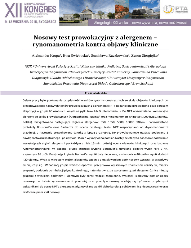 Nosowy test prowokacyjny z alergenem – rynomanometria kontra objawy kliniczne Aleksander Krupa1, Ewa Świebocka2, Stanisława Raczkowska3, Zenon Siergiejko4 1GSK, 2Uniwersytecki Dziecięcy Szpital Kliniczny, Klinika Pediatrii, Gastroenterologii i Alergologii Dziecięcej w Białymstoku, 3Uniwersytecki Dziecięcy Szpital Kliniczny, Samodzielna Pracownia Diagnostyki Układu Oddechowego i Bronchoskopii, 4Uniwersytet Medyczny w Białymstoku, Samodzielna Pracownia Diagnostyki Układu Oddechowego i Bronchoskopii Treść abstraktu Celem pracy było porównanie przydatności wyników rynomanometrycznych ze skalą objawów klinicznych do przeprowadzania nosowych testów prowokacyjnych z alergenem (NPT). Badanie przeprowadzono poza okresem ekspozycji w grupie 60 osób uczulonych na pyłki traw lub D. pteronyssinus. Do NPT wykorzystano komercyjne alergeny do celów prowokacyjnych (Alergopharma, Niemcy) oraz rhinomanometr Rhinotest 1000 (MES, Kraków, Polska). Przygotowano następujące stężenia alergenów: 550, 1650, 5000, 10000 SBU/ml. Wykorzystano protokoły Bousquet’a oraz Bachert’a do oceny przebiegu testu. NPT rozpoczynano od rhynomanometrii przedniej, a następnie prowokowano dziurkę z lepszą drożnością. Do prowokowanego nozdrza podawano 1 dawkę roztworu kontrolnego i po upływie 15 min wykonywano pomiar. Następne etapy to donosowe podawanie wzrastających stężeń alergenu i po każdym z nich 15 min. później ocena objawów klinicznych oraz badanie rynomanometryczne. W badanej grupie stosując kryteria Bousquet’a uzyskano dodatni wynik NPT u 44, a ujemny u 16 osób. Przyjmując kryteria Bachert’a wyniki były nieco inne, a mianowicie 40 osób – wynik dodatni i 20 ujemny. Wraz ze wzrostem stężeń alergenów zgodnie z oczekiwaniem opór nosowy wzrastał, a przepływy zmniejszały się. W badanej grupie wartości oporów i przepływów wyjściowych znamiennie różniły się między grupami , podobnie po inhalacji płynu kontrolnego, natomiast wraz ze wzrostem stężeń alergenu różnice między grupami z wynikiem dodatnim i ujemnym były coraz rzadziej znamienne. Wniosek: Izolowany pomiar oporu nosowego w trakcie rynomanometrii przedniej oraz przepływ nosowy wydają się być mało przydatnymi wskaźnikami do oceny NPT z alergenem gdyż uzyskane wyniki słabo korelują z objawami i są niepowtarzalne oraz zakłócane przez cykl nosowy.