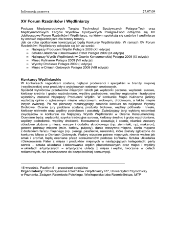 Informacja prasowa 27.07.09 XV Forum Rzeźników i Wędliniarzy Podczas Międzynarodowych Targów Technologii SpoŜywczych Polagra-Tech oraz Międzynarodowych Targów Wyrobów SpoŜywczych Polagra-Food odbędzie się XV Jubileuszowe Forum Rzeźników i Wędliniarzy, na którym spotykają się rzeźnicy i wędliniarze by omówić najwaŜniejsze dla branŜy tematy. Jak co roku spotkaniom towarzyszyć będą Konkursy Wędliniarskie. W ramach XV Forum Rzeźników i Wędliniarzy odbędzie się ich aŜ sześć: • Najlepszy Producent Wędlin Polagra 2009 (XII edycja) • Sztuka Układania i Dekorowania Pater Polagra 2009 (IX edycja) • Najlepszy Wyrób Wędliniarski w Ocenie Konsumenckiej Polagra 2009 (IX edycja) • Mięso Kulinarne Polagra 2009 (VII edycja) • Wyroby Drobiowe Polagra 2009 (I edycja) • Mięso w Dniach Gotowych Polagra 2009 (VIII edycja) Konkursy Wędliniarskie W konkursach nagrodzeni zostaną najlepsi producenci i specjaliści w branŜy mięsnej i wędliniarskiej oraz produkty o wyjątkowych walorach smakowych. Spośród wytwórców przetworów mięsnych takich jak wędzonki parzone, wędzonki surowe, kiełbasy średnio i grubo rozdrobnione, wędliny podrobowe, wędliny regionalne i tradycyjne wyłoniony zostanie Najlepszy Producent Wędlin. W konkursie Mięso Kulinarne jurorzy wydadzą opinie o zgłoszonym mięsie wieprzowym, wołowym, drobiowym, a takŜe mięsie innych zwierząt. Po raz pierwszy rozstrzygnięty zostanie konkurs na najlepsze Wyroby Drobiowe. Ocenie jury poddane zostaną produkty blokowe, wędliny półtrwałe i trwałe, kiełbasy nietrwałe oraz wędliny podrobowe i pasztety. Zwiedzający targi wybiorą natomiast zwycięzców w konkursie na Najlepszy Wyrób Wędliniarski w Ocenie Konsumenckiej. Oceniane będą: wędzonki, szynka tradycyjna surowa, kiełbasy średnio i grubo rozdrobnione, wędliny podrobowe, wędliny drobiowe. Konsumenci skosztują i ocenią równieŜ zestawy obiadowe złoŜone z mięsa, warzyw i dodatku skrobiowego (np. ziemniaki, ryŜ, makaron), gotowe potrawy mięsne (m.in. kotlety, pulpety), dania warzywno-mięsne, dania mączne z dodatkiem farszu mięsnego (np. pierogi, paszteciki, naleśniki), które zostały zgłoszone do konkursu Mięso w Daniach Gotowych. Walory wizualne potraw mięsnych, równie waŜne jak smak i aromat, będą oceniane przez konsumentów podczas konkursu Sztuka Układania i Dekorowania Pater z mięsa i produktów mięsnych w następujących kategoriach: party serwis – sztuka układania i dekorowania wędlin plasterkowanych oraz mięso i wędliny w układach artystycznych – artystyczne układy z mięsa i wędlin, tworzone w celach reklamowych, nie przeznaczone do bezpośredniej konsumpcji. 15 września, Pawilon 5 – przestrzeń specjalna Organizatorzy: Stowarzyszenie Rzeźników i Wędliniarzy RP, Uniwersytet Przyrodniczy w Poznaniu, Związek Rzemiosła Polskiego, Wielkopolska Izba Rzemieślnicza, MTP