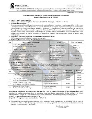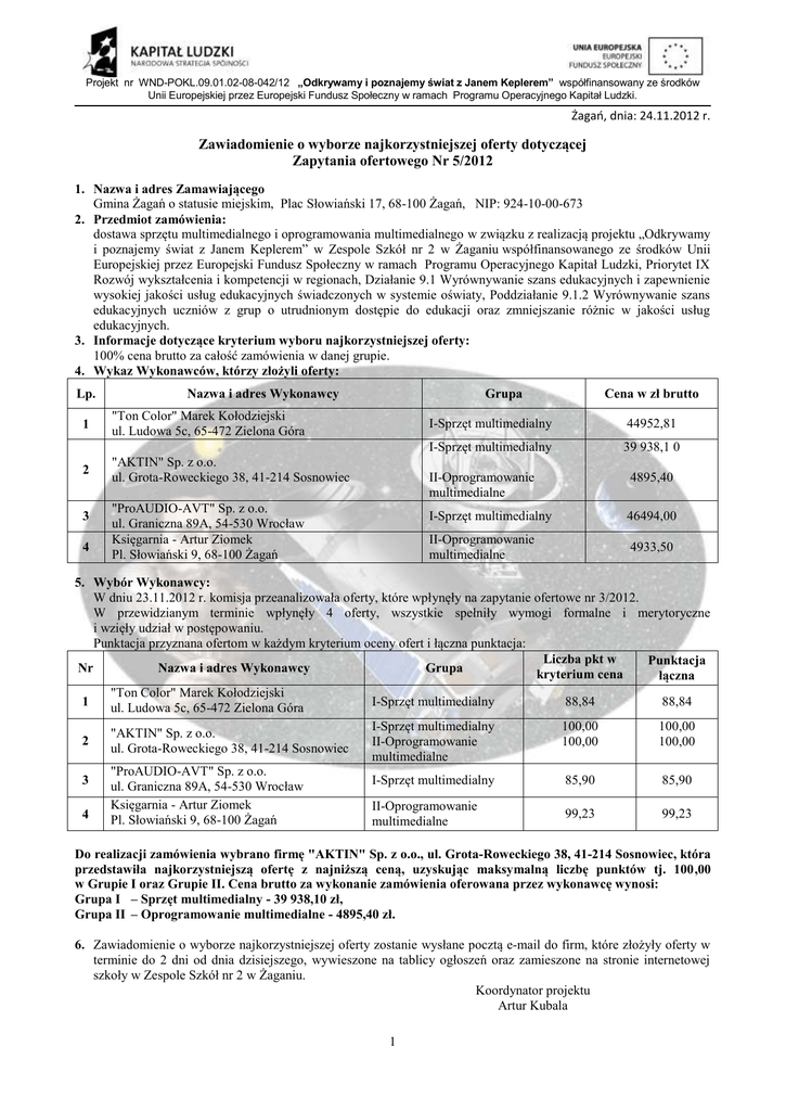Projekt nr WND-POKL.09.01.02-08-042/12 „Odkrywamy i poznajemy świat z Janem Keplerem” współfinansowany ze środków Unii Europejskiej przez Europejski Fundusz Społeczny w ramach Programu Operacyjnego Kapitał Ludzki. Żagań, dnia: 24.11.2012 r. Zawiadomienie o wyborze najkorzystniejszej oferty dotyczącej Zapytania ofertowego Nr 5/2012 1. Nazwa i adres Zamawiającego Gmina Żagań o statusie miejskim, Plac Słowiański 17, 68-100 Żagań, NIP: 924-10-00-673 2. Przedmiot zamówienia: dostawa sprzętu multimedialnego i oprogramowania multimedialnego w związku z realizacją projektu „Odkrywamy i poznajemy świat z Janem Keplerem” w Zespole Szkół nr 2 w Żaganiu współfinansowanego ze środków Unii Europejskiej przez Europejski Fundusz Społeczny w ramach Programu Operacyjnego Kapitał Ludzki, Priorytet IX Rozwój wykształcenia i kompetencji w regionach, Działanie 9.1 Wyrównywanie szans edukacyjnych i zapewnienie wysokiej jakości usług edukacyjnych świadczonych w systemie oświaty, Poddziałanie 9.1.2 Wyrównywanie szans edukacyjnych uczniów z grup o utrudnionym dostępie do edukacji oraz zmniejszanie różnic w jakości usług edukacyjnych. 3. Informacje dotyczące kryterium wyboru najkorzystniejszej oferty: 100% cena brutto za całość zamówienia w danej grupie. 4. Wykaz Wykonawców, którzy złożyli oferty: Lp. Nazwa i adres Wykonawcy 1 "Ton Color" Marek Kołodziejski ul. Ludowa 5c, 65-472 Zielona Góra 2 "AKTIN" Sp. z o.o. ul. Grota-Roweckiego 38, 41-214 Sosnowiec 3 4 Grupa "ProAUDIO-AVT" Sp. z o.o. ul. Graniczna 89A, 54-530 Wrocław Księgarnia - Artur Ziomek Pl. Słowiański 9, 68-100 Żagań Cena w zł brutto I-Sprzęt multimedialny 44952,81 I-Sprzęt multimedialny 39 938,1 0 II-Oprogramowanie multimedialne 4895,40 I-Sprzęt multimedialny 46494,00 II-Oprogramowanie multimedialne 4933,50 5. Wybór Wykonawcy: W dniu 23.11.2012 r. komisja przeanalizowała oferty, które wpłynęły na zapytanie ofertowe nr 3/2012. W przewidzianym terminie wpłynęły 4 oferty, wszystkie spełniły wymogi formalne i merytoryczne i wzięły udział w postępowaniu. Punktacja przyznana ofertom w każdym kryterium oceny ofert i łączna punktacja: Liczba pkt w Punktacja Nr Nazwa i adres Wykonawcy Grupa kryterium cena łączna "Ton Color" Marek Kołodziejski I-Sprzęt multimedialny 88,84 88,84 1 ul. Ludowa 5c, 65-472 Zielona Góra I-Sprzęt multimedialny 100,00 100,00 "AKTIN" Sp. z o.o. 2 II-Oprogramowanie 100,00 100,00 ul. Grota-Roweckiego 38, 41-214 Sosnowiec multimedialne "ProAUDIO-AVT" Sp. z o.o. I-Sprzęt multimedialny 85,90 85,90 3 ul. Graniczna 89A, 54-530 Wrocław Księgarnia - Artur Ziomek II-Oprogramowanie 99,23 99,23 4 Pl. Słowiański 9, 68-100 Żagań multimedialne Do realizacji zamówienia wybrano firmę "AKTIN" Sp. z o.o., ul. Grota-Roweckiego 38, 41-214 Sosnowiec, która przedstawiła najkorzystniejszą ofertę z najniższą ceną, uzyskując maksymalną liczbę punktów tj. 100,00 w Grupie I oraz Grupie II. Cena brutto za wykonanie zamówienia oferowana przez wykonawcę wynosi: Grupa I – Sprzęt multimedialny - 39 938,10 zł, Grupa II – Oprogramowanie multimedialne - 4895,40 zł. 6. Zawiadomienie o wyborze najkorzystniejszej oferty zostanie wysłane pocztą e-mail do firm, które złożyły oferty w terminie do 2 dni od dnia dzisiejszego, wywieszone na tablicy ogłoszeń oraz zamieszone na stronie internetowej szkoły w Zespole Szkół nr 2 w Żaganiu. Koordynator projektu Artur Kubala 1