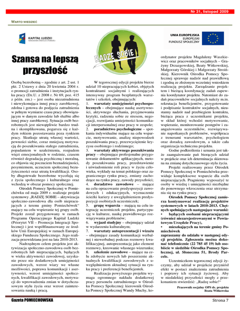 Nr 31, listopad 2009 WARTO WIEDZIEĆ Szansa na lepszą przyszłość Osobą bezrobotną – zgodnie z art. 2 ust. 1 pkt. 2 Ustawy z dnia 20 kwietnia 2004 r. o promocji zatrudnienia i instytucjach rynku pracy (Dz.U. z 2008 r. Nr 69, poz. 415 z późn. zm.) – jest osoba niezatrudniona i niewykonująca innej pracy zarobkowej, zdolna i gotowa do podjęcia zatrudnienia w pełnym wymiarze czasu pracy obowiązującym w danym zawodzie lub służbie albo innej pracy zarobkowej. Sytuacja osób bezrobotnych jest niewątpliwie bardzo trudna i skomplikowana, pogarsza się z każdym rokiem pozostawania poza rynkiem pracy. Skutkuje utratą własnej wartości, pewności siebie, coraz mniejszą motywacją do poszukiwania stałego zatrudnienia, popadaniem w uzależnienia, rozpadem więzi emocjonalnych w rodzinie, czasem również degradacją psychiczną i moralną, co objawia się poczuciem beznadziejności, pesymizmem, uczuciem społecznej bezużyteczności oraz utratą kwalifikacji. Osoby długotrwałe bezrobotne wycofują się z życia społecznego i kulturalnego oraz wchodzą w obszar pomocy społecznej. Ośrodek Pomocy Społecznej w Pomiechówku od maja 2009 r. realizuje projekt systemowy „RADZĘ SOBIE – aktywizacja społeczno-zawodowa dla osób niepracujących z terenu gminy Pomiechówek“ mający na celu wspieranie tej grupy osób. Projekt został przygotowany w ramach Programu Operacyjnego Kapitał Ludzki (Priorytet VII – Promocja Integracji Społecznej) i jest współfinansowany ze środków Unii Europejskiej w ramach Europejskiego Funduszu Społecznego. Jego realizacja przewidziana jest na lata 2010-2013. Nadrzędnym celem projektu jest aktywizacja społeczno-zawodowa osób bezrobotnych lub niepracujących, będących w wieku aktywności zawodowej, uzyskanie przez nie dodatkowych umiejętności zawodowych, wzrost wiary we własne możliwości, poprawa komunikacji i asertywności, wzrost umiejętności społecznych, kwalifikacji zawodowych, motywacji do wprowadzenia zmian w dotychczasowym stylu życia oraz wzrost zainteresowania nauką i pracą. Gazeta POMIECHOWSKA W tegorocznej edycji projektu bierze udział 10 niepracujących kobiet, objętych kontraktami socjalnymi i realizujących intensywny program bezpłatnych warsztatów i szkoleń, obejmujących: 1. warsztaty umiejętności psychospołecznych – obejmujące naukę asertywności, aktywnego słuchania, przyjmowania krytyki, radzenia sobie ze stresem, negocjacji, rozwijania umiejetności komunikacji interpersonalnej oraz pracy w zespole; 2. poradnictwo psychologiczne – spotkania indywidualne mające na celu wsparcie, motywowanie, analizę niepowodzeń poszukiwania pracy, przezwyciężenie kryzysu osobistego i rodzinnego; 3. warsztaty aktywnego poszukiwania pracy – obejmujące profesjonalne przygotowanie dokumentów aplikacyjnych, metody poszukiwania pracy, przedstawienie i uświadomienie roli pracy w życiu człowieka, wykłady na temat polskiego oraz zagranicznego rynku pracy, zmiany zachodzące na rynku pracy, zawody przyszłości; 4. doradztwo zawodowe – mające na celu opracowanie predyspozycji zawodowych i edukacyjnych, wyznaczenie ścieżki kariery z uwzględnieniem predyspozycji osobistych uczestniczek; 5. grupę wsparcia – mającą na celu integrację uczestniczek projektu, partycypację w kulturze, naukę prawidłowego rozwiązywania problemów; 6. wyjazd studyjny – obejmujący udział w wydarzeniu kulturalnym; 7. warsztaty autoprezentacji i wizażu – obejmujące zasady komunikacji werbalnej i niewerbalnej podczas rozmowy kwalifikacyjnej, autoprezentację jako element rozmowy, kreowanie własnego wizerunku; 8. szkolenie zawodowe – mające na celu zdobycie nowych lub poszerzenie aktualnych kwalifikacji zawodowych z uwzględnieniem aktualnej sytuacji na rynku pracy i preferencji beneficjentek. Realizacja powyższego projektu wymaga ogromnego nakładu dodatkowej pracy personelu zatrudnionego w Ośrodku Pomocy Społecznej: kierownik Ośrodka Pomocy Społecznej Wandy Muchy, ko- ordynator projektu Magdaleny Waszkiewicz oraz pracowników socjalnych – Grażyny Drzazgowskiej, Beaty Witkowskiej, Małgorzaty Górskiej i Małgorzaty Stroińskiej. Kierownik Ośrodka Pomocy Społecznej sprawuje nadzór nad prawidłową i zgodną ze złożonym wcześniej wnioskiem realizacją projektu. Zarządzanie projektem i bieżącą koordynację zadań zapewnia koordynator projektu. Natomiast do zadań pracowników socjalnych należy m.in. rekrutacja beneficjentów, przygotowanie i podpisanie kontraktów socjalnych, nieustanny nadzór nad przebiegiem kontraktu, bieżąca praca z uczestnikami projektu, w skład której wchodzi motywowanie, wspieranie, monitorowanie postępów i zaangażowania uczestników, rozwiązywanie napotkanych problemów, współpraca z trenerami warsztatów, psychologiem oraz doradcą zawodowym, a także cała organizacja techniczna projektu. Godne podkreślenia i uznania jest także zaangażowanie pań biorących udział w projekcie oraz ich determinacja skierowana na zmianę dotychczasowego stylu życia. Projekt realizowany przez Ośrodek Pomocy Społecznej w Pomiechówku przewiduje kompleksowe wsparcie dla osób niepracujących. Pragniemy wyposażyć te osoby w wiedzę i umiejętności niezbędne do ponownego wkroczenia oraz utrzymania się na rynku pracy. Ośrodek Pomocy Społecznej zamierza kontynuować realizację projektów systemowych w latach 2010-2013. Chętnych spełniających następujące warunki: • będących osobami niepracującymi (również niezarejestrowanymi w Powiatowym Urzędzie Pracy), • mieszkających na terenie gminy Pomiechówek zapraszamy do udziału w następnej edycji projektu. Zgłoszenia można dokonać telefonicznie (22 785 45 19) lub osobiście w siedzibie Ośrodka Pomocy Społecznej, ul. Słoneczna 51, Brody Parcele. Uczestniczkom tegorocznej edycji życzymy, aby udział w projekcie przyniósł efekt w postaci znalezienia zatrudnienia i poprawy ich sytuacji życiowej. Aby w 