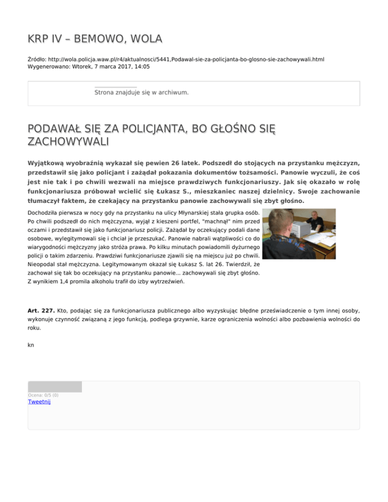 KRP IV – BEMOWO, WOLA Źródło: http://wola.policja.waw.pl/r4/aktualnosci/5441,Podawal-sie-za-policjanta-bo-glosno-sie-zachowywali.html Wygenerowano: Wtorek, 7 marca 2017, 14:05 Strona znajduje się w archiwum. PODAWAŁ SIĘ ZA POLICJANTA, BO GŁOŚNO SIĘ ZACHOWYWALI Wyjątkową wyobraźnią wykazał się pewien 26 latek. Podszedł do stojących na przystanku mężczyzn, przedstawił się jako policjant i zażądał pokazania dokumentów tożsamości. Panowie wyczuli, że coś jest nie tak i po chwili wezwali na miejsce prawdziwych funkcjonariuszy. Jak się okazało w rolę funkcjonariusza próbował wcielić się Łukasz S., mieszkaniec naszej dzielnicy. Swoje zachowanie tłumaczył faktem, że czekający na przystanku panowie zachowywali się zbyt głośno. Dochodziła pierwsza w nocy gdy na przystanku na ulicy Młynarskiej stała grupka osób. Po chwili podszedł do nich mężczyzna, wyjął z kieszeni portfel, "machnął" nim przed oczami i przedstawił się jako funkcjonariusz policji. Zażądał by oczekujący podali dane osobowe, wylegitymowali się i chciał je przeszukać. Panowie nabrali wątpliwości co do wiarygodności mężczyzny jako stróża prawa. Po kilku minutach powiadomili dyżurnego policji o takim zdarzeniu. Prawdziwi funkcjonariusze zjawili się na miejscu już po chwili. Nieopodal stał mężczyzna. Legitymowanym okazał się Łukasz S. lat 26. Twierdził, że zachował się tak bo oczekujący na przystanku panowie... zachowywali się zbyt głośno. Z wynikiem 1,4 promila alkoholu trafił do izby wytrzeźwień. Art. 227. Kto, podając się za funkcjonariusza publicznego albo wyzyskując błędne przeświadczenie o tym innej osoby, wykonuje czynność związaną z jego funkcją, podlega grzywnie, karze ograniczenia wolności albo pozbawienia wolności do roku. kn Ocena: 0/5 (0) Tweetnij