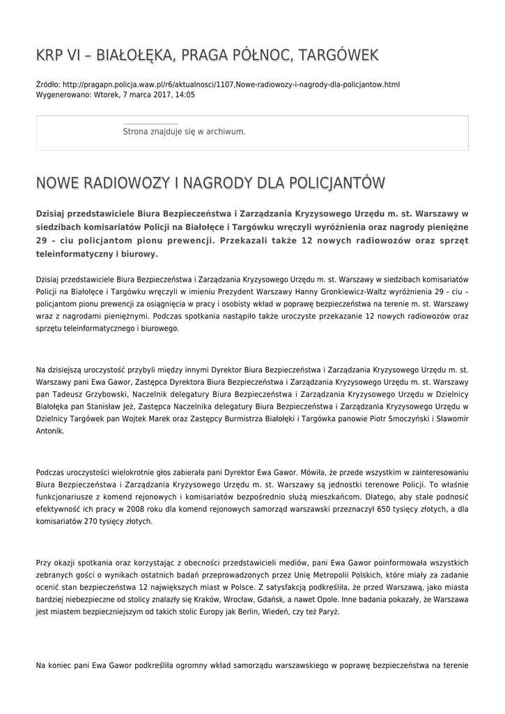 KRP VI – BIAŁOŁĘKA, PRAGA PÓŁNOC, TARGÓWEK Źródło: http://pragapn.policja.waw.pl/r6/aktualnosci/1107,Nowe-radiowozy-i-nagrody-dla-policjantow.html Wygenerowano: Wtorek, 7 marca 2017, 14:05 Strona znajduje się w archiwum. NOWE RADIOWOZY I NAGRODY DLA POLICJANTÓW Dzisiaj przedstawiciele Biura Bezpieczeństwa i Zarządzania Kryzysowego Urzędu m. st. Warszawy w siedzibach komisariatów Policji na Białołęce i Targówku wręczyli wyróżnienia oraz nagrody pieniężne 29 – ciu policjantom pionu prewencji. Przekazali także 12 nowych radiowozów oraz sprzęt teleinformatyczny i biurowy. Dzisiaj przedstawiciele Biura Bezpieczeństwa i Zarządzania Kryzysowego Urzędu m. st. Warszawy w siedzibach komisariatów Policji na Białołęce i Targówku wręczyli w imieniu Prezydent Warszawy Hanny Gronkiewicz-Waltz wyróżnienia 29 - ciu – policjantom pionu prewencji za osiągnięcia w pracy i osobisty wkład w poprawę bezpieczeństwa na terenie m. st. Warszawy wraz z nagrodami pieniężnymi. Podczas spotkania nastąpiło także uroczyste przekazanie 12 nowych radiowozów oraz sprzętu teleinformatycznego i biurowego. Na dzisiejszą uroczystość przybyli między innymi Dyrektor Biura Bezpieczeństwa i Zarządzania Kryzysowego Urzędu m. st. Warszawy pani Ewa Gawor, Zastępca Dyrektora Biura Bezpieczeństwa i Zarządzania Kryzysowego Urzędu m. st. Warszawy pan Tadeusz Grzybowski, Naczelnik delegatury Biura Bezpieczeństwa i Zarządzania Kryzysowego Urzędu w Dzielnicy Białołęka pan Stanisław Jeż, Zastępca Naczelnika delegatury Biura Bezpieczeństwa i Zarządzania Kryzysowego Urzędu w Dzielnicy Targówek pan Wojtek Marek oraz Zastępcy Burmistrza Białołęki i Targówka panowie Piotr Smoczyński i Sławomir Antonik. Podczas uroczystości wielokrotnie głos zabierała pani Dyrektor Ewa Gawor. Mówiła, że przede wszystkim w zainteresowaniu Biura Bezpieczeństwa i Zarządzania Kryzysowego Urzędu m. st. Warszawy są jednostki terenowe Policji. To właśnie funkcjonariusze z komend rejonowych i komisariatów bezpośrednio służą mieszkańcom. Dlatego, aby stale podnosić efektywność ich pracy w 2008 roku dla komend rejonowych samorząd warszawski przeznaczył 650 tysięcy złotych, a dla komisariatów 270 tysięcy złotych. Przy okazji spotkania oraz korzystając z obecności przedstawicieli mediów, pani Ewa Gawor poinformowała wszystkich zebranych gości o wynikach ostatnich badań przeprowadzonych przez Unię Metropolii Polskich, które miały za zadanie ocenić stan bezpieczeństwa 12 największych miast w Polsce. Z satysfakcją podkreśliła, że przed Warszawą, jako miasta bardziej niebezpieczne od stolicy znalazły się Kraków, Wrocław, Gdańsk, a nawet Opole. Inne badania pokazały, że Warszawa jest miastem bezpieczniejszym od takich stolic Europy jak Berlin, Wiedeń, czy też Paryż. Na koniec pani Ewa Gawor podkreśliła ogromny wkład samorządu warszawskiego w poprawę bezpieczeństwa na terenie Warszawy. Tylko od 1995 roku przekazano na ten cel 250 milionów złotych. mb Ocena: 0/5 (0) Tweetnij
