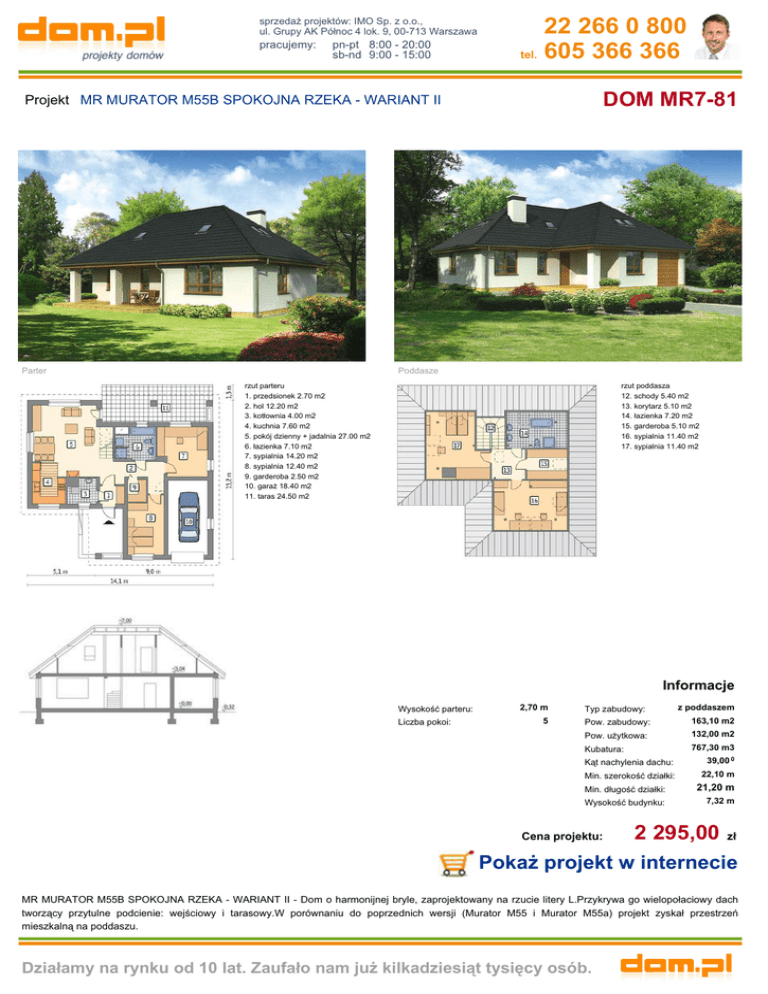 sprzedaż projektów: IMO Sp. z o.o., ul. Grupy AK Północ 4 lok. 9, 00-713 Warszawa pracujemy: pn-pt 8:00 - 20:00 sb-nd 9:00 - 15:00 22 266 0 800 tel. 605 366 366 DOM MR7-81 Projekt MR MURATOR M55B SPOKOJNA RZEKA - WARIANT II Parter Poddasze rzut parteru 1. przedsionek 2.70 m2 2. hol 12.20 m2 3. kotłownia 4.00 m2 4. kuchnia 7.60 m2 5. pokój dzienny + jadalnia 27.00 m2 6. łazienka 7.10 m2 7. sypialnia 14.20 m2 8. sypialnia 12.40 m2 9. garderoba 2.50 m2 10. garaż 18.40 m2 11. taras 24.50 m2 rzut poddasza 12. schody 5.40 m2 13. korytarz 5.10 m2 14. łazienka 7.20 m2 15. garderoba 5.10 m2 16. sypialnia 11.40 m2 17. sypialnia 11.40 m2 Informacje Wysokość parteru: Liczba pokoi: 2,70 m 5 Typ zabudowy: z poddaszem Pow. zabudowy: 163,10 m2 Pow. użytkowa: 132,00 m2 Kubatura: 767,30 m3 Kąt nachylenia dachu: 39,00 0 Min. szerokość działki: 22,10 m Min. długość działki: 21,20 m Wysokość budynku: 7,32 m Cena projektu: 2 295,00 zł Pokaż projekt w internecie MR MURATOR M55B SPOKOJNA RZEKA - WARIANT II - Dom o harmonijnej bryle, zaprojektowany na rzucie litery L.Przykrywa go wielopołaciowy dach tworzący przytulne podcienie: wejściowy i tarasowy.W porównaniu do poprzednich wersji (Murator M55 i Murator M55a) projekt zyskał przestrzeń mieszkalną na poddaszu. Działamy na rynku od 10 lat. Zaufało nam już kilkadziesiąt tysięcy osób.