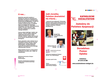 O nas… Katolickie placówki socjalne w Stuttgarcie naleŜą do największych jednostek oferujących ambulatoryjne świadczenia pielęgnacyjne. W obecnej formie istnieją od 1975 roku. Pod znakiem pomocnej dłoni na kółkach kryje się rozległa sieć placówek oferujących fachową, wykwalifikowaną opiekę. Przy tym człowiek i jego potrzeby znajdują się w centrum naszego działania. Czynna miłość bliźniego i opieka nad starymi i chorymi ludźmi naleŜą do najbardziej pierwotnych zadań kościoła. Kościół i opieka nad chorymi są od zawsze nierozerwalnie ze sobą powiązane. Nasza placówka moŜe rozliczać się ze wszystkimi kasami chorych i kasami opiekuńczymi. Jakość opieki stale kontrolujemy. Ponadto jesteśmy regularnie sprawdzani przez Komisję Lekarską Kasy Chorych. Jeśli chcieliby Państwo dowiedzieć się więcej… …proszę do nas zadzwonić. Otrzymają Państwo ofertę opieki dostosowaną do Państwa indywidualnych potrzeb oraz wstępny kosztorys. Państwa doradcami są: Margit Fink Pani dyrektor ds. opieki Andreas Schardt Zarząd Mogą Państwo liczyć na naszą pomoc niezaleŜnie od wieku, płci, religii czy narodowości. Katholisches Stadtdekanat Stuttgart Werastr. 118, 70190 Stuttgart Katholische Sozialstation Stuttgart Werastr. 118 70190 Stuttgart W związku opieki Caritas Placówka ambulatoryjnych świadczeń pielęgnacyjnych Kościoła Katolickiego w Stuttgarcie Flyer Sozialstation poln... Seite 1 Jesteśmy do Państwa dyspozycji. Partner szpitala Marienhospital i kliniki Klinikum Stuttgart Doradztwo Pomoc Opieka Infolinia: 07 11/70 50 888 www.sozialstationen-stuttgart.de Donnerstag, 7. April 2011 08:21 Schwarz Magenta Zyan Gelb Doradztwo Pomoc Opieka Szukają Państwo informacji odnośnie opieki domowej? Potrzebują Państwo pomocy w robieniu zakupów, przygotowaniu posiłków, zrobieniu prania lub przy innych czynnościach domowych? Chcą Państwo, Ŝeby Państwem lub Państwa krewnymi opiekowano się w zaufanym domowym otoczeniu? Chcą Państwo wiedzieć jakie świadczenia finansowane przez kasę chorych przysługują Państwu? Potrzebują Państwo wskazówek i porad dotyczących opieki nad Państwa krewnymi? Nie mogą się Państwo odnaleźć wśród róŜnorodności propozycji placówek oferujących opiekę nad chorymi? Otrzymują Państwo wsparcie finansowe dla osób podlegających opiece i szukają Państwo specjalisty, który udzieli Państwu porady? Jesteśmy do Państwa dyspozycji. Flyer Sozialstation poln... Seite 2 Chcą Państwo pójść do lekarza lub urzędu i poszukują osoby towarzyszącej? Potrzebują Państwo szybko krzesła toaletowego, łóŜka dla chorego lub innego sprzętu? Potrzebują Państwo pomocy przy wstawaniu, przy pielęgnacji ciała lub ścieleniu łóŜka? Otrzymali Państwo od lekarza zalecenie zmiany opatrunku, zrobienia zastrzyku lub wykonania innego świadczenia pielęgnacyjnego? Niekiedy nie czują się Państwo zbyt dobrze i byliby Państwo spokojniejsi, gdyby ktoś od czasu do czasu po prostu zajrzał do Państwa lub zadzwonił? LeŜą Państwo w szpitalu, a mogliby Państwo szybciej wyjść do domu, gdyby mieli tam Państwo zapewnioną opiekę? Jesteśmy do Państwa dyspozycji. Jesteśmy do Państwa dyspozycji. Donnerstag, 7. April 2011 08:21 Schwarz Magenta Zyan Gelb