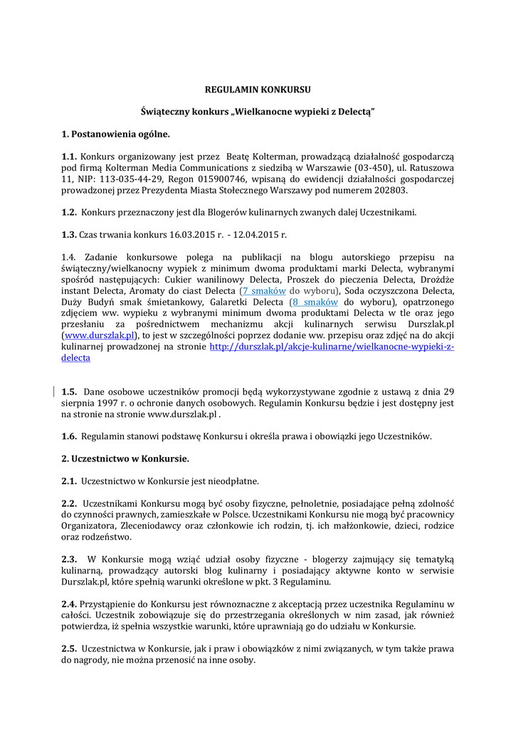 REGULAMIN KONKURSU Świąteczny konkurs „Wielkanocne wypieki z Delectą” 1. Postanowienia ogólne. 1.1. Konkurs organizowany jest przez Beatę Kolterman, prowadzącą działalność gospodarczą pod firmą Kolterman Media Communications z siedzibą w Warszawie (03-450), ul. Ratuszowa 11, NIP: 113-035-44-29, Regon 015900746, wpisaną do ewidencji działalności gospodarczej prowadzonej przez Prezydenta Miasta Stołecznego Warszawy pod numerem 202803. 1.2. Konkurs przeznaczony jest dla Blogerów kulinarnych zwanych dalej Uczestnikami. 1.3. Czas trwania konkurs 16.03.2015 r. - 12.04.2015 r. 1.4. Zadanie konkursowe polega na publikacji na blogu autorskiego przepisu na świąteczny/wielkanocny wypiek z minimum dwoma produktami marki Delecta, wybranymi spośród następujących: Cukier wanilinowy Delecta, Proszek do pieczenia Delecta, Drożdże instant Delecta, Aromaty do ciast Delecta (7 smaków do wyboru), Soda oczyszczona Delecta, Duży Budyń smak śmietankowy, Galaretki Delecta (8 smaków do wyboru), opatrzonego zdjęciem ww. wypieku z wybranymi minimum dwoma produktami Delecta w tle oraz jego przesłaniu za pośrednictwem mechanizmu akcji kulinarnych serwisu Durszlak.pl (www.durszlak.pl), to jest w szczególności poprzez dodanie ww. przepisu oraz zdjęć na do akcji kulinarnej prowadzonej na stronie http://durszlak.pl/akcje-kulinarne/wielkanocne-wypieki-zdelecta 1.5. Dane osobowe uczestników promocji będą wykorzystywane zgodnie z ustawą z dnia 29 sierpnia 1997 r. o ochronie danych osobowych. Regulamin Konkursu będzie i jest dostępny jest na stronie na stronie www.durszlak.pl . 1.6. Regulamin stanowi podstawę Konkursu i określa prawa i obowiązki jego Uczestników. 2. Uczestnictwo w Konkursie. 2.1. Uczestnictwo w Konkursie jest nieodpłatne. 2.2. Uczestnikami Konkursu mogą być osoby fizyczne, pełnoletnie, posiadające pełną zdolność do czynności prawnych, zamieszkałe w Polsce. Uczestnikami Konkursu nie mogą być pracownicy Organizatora, Zleceniodawcy oraz członkowie ich rodzin, tj. ich małżonkowie, dzieci, rodzice oraz rodzeństwo. 2.3. W Konkursie mogą wziąć udział osoby fizyczne - blogerzy zajmujący się tematyką kulinarną, prowadzący autorski blog kulinarny i posiadający aktywne konto w serwisie Durszlak.pl, które spełnią warunki określone w pkt. 3 Regulaminu. 2.4. Przystąpienie do Konkursu jest równoznaczne z akceptacją przez uczestnika Regulaminu w całości. Uczestnik zobowiązuje się do przestrzegania określonych w nim zasad, jak również potwierdza, iż spełnia wszystkie warunki, które uprawniają go do udziału w Konkursie. 2.5. Uczestnictwa w Konkursie, jak i praw i obowiązków z nimi związanych, w tym także prawa do nagrody, nie można przenosić na inne osoby. 3. Przebieg i warunki udziału w Konkursie. 3.1. Konkurs polega na przygotowaniu i przesłaniu autorskiego przepisu na świąteczny wypiek z wykorzystaniem minimum dwóch produktów marki Delecta (określonych w pkt. 1.4 Regulaminu) wraz z ilustrującym je zdjęciem z minimum dwoma produktami marki Delecta w tle, według zasad zamieszczonych na stronie www.durszlak.pl 3.2. Aby zgłosić przepis należy: 3.2.1. przygotować przepis na wielkanocny wypiek z wykorzystaniem minimum dwóch produktów marki Delecta ze wskazaniem w składnikach, jakie produkty Delecty zostały użyte do przygotowania wypieku. 3.2.2. zrobić zdjęcie wypieku z opakowaniami minimum dwóch produktów marki Delecta, które zostały użyte do przygotowania wypieku oraz przepisu, w tym samym kadrze. 3.2.3. opublikować przepis wraz ze zdjęciem w formie wpisu na prowadzonym przez Uczestnika blogu 3.2.4. zgłoszenie wpisu z wypiekiem konkursowym oraz wraz ze stosownym zdjęciem do Konkursu za pośrednictwem strony: http://durszlak.pl/akcjekulinarne/wielkanocne-wypieki-z-delecta - jeden Uczestnik może zgłosić maksymalnie 3 przepisy. 3.2.5 W przepisie oraz na zdjęciach zgłoszonych do konkursu nie mogą być lokowane produkty żadnych innych marek, ze szczególnym wskazaniem takich marek jak: dr. Oetker, Gellwe, Winiary. 3.3. Poprzez zgłoszenie przepisu do Konkursu w sposób wyżej określony, Uczestnik Konkursu oświadcza, że treść i forma każdej z zamieszczonych wypowiedzi konkursowych nie narusza przepisów prawa, ani prawem chronionych dóbr osób trzecich, a uczestnik Konkursu jest w pełni uprawniony do zgłoszenia każdej z wypowiedzi konkursowych. 3.4. Z tytułu złożonego powyżej oświadczenia Uczestnik przyjmuje na siebie pełną odpowiedzialność prawną. W przypadku jakichkolwiek roszczeń ze strony osób trzecich Uczestnik, po zawiadomieniu go przez Organizatora, nie uchyli się od niezwłocznego przystąpienia do wyjaśnienia sprawy oraz wystąpi przeciwko takim roszczeniom na własny koszt i ryzyko, a nadto zaspokoi wszelkie uzasadnione roszczenia, a w razie ich zasądzenia od Organizatora, regresowo zwróci całość pokrytych roszczeń oraz wszelkie związane z tym wydatki i opłaty, włączając w to koszty procesu i obsługi prawnej, a także naprawi wszelkie inne szkody wynikające z wyżej opisanych roszczeń osób trzecich. 3.5. Uczestnicy konkursu wyrażają zgodę na korzystanie z autorskich praw majątkowych do zgłoszonego przepisu przez Organizatora konkursu i Zleceniodawcę a także wszelkich Utworów będących składnikami Zgłoszenia (w szczególności takich jak zdjęcia), w sytuacji gdy ich przepisy zostaną nagrodzone lub wyróżnione, bez ograniczeń terytorialnych i czasowych na następujących polach eksploatacji: 3.5.1. wprowadzanie do pamięci komputera, publiczne wykonanie albo publiczne odtwarzanie, publikacja w Internecie na następujących stronach: www.facebook.pl fanpage o nazwie DelektuJEMY.pl (https://www.facebook.com/delektuJEMY), oraz na stronach: www.delecta.pl , www.delektuJEMY.pl, a także na stronie www.durszlak.pl. 3.6. Powyższa zgoda określona w pkt. 3.5. jest równoznaczna z przekazaniem praw autorskich w zakresie jak wyżej przez Uczes