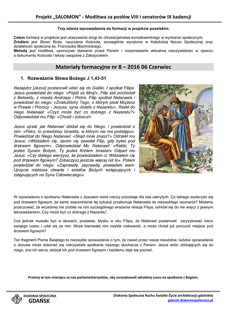 Projekt „SALOMON” - Modlitwa za posłów VIII i senatorów IX kadencji Trzy zdania wprowadzenia do formacji w projekcie poselskim. Celem formacji w projekcie jest ukazywanie drogi do chrześcijaństwa konsekwentnego w wymiarze społecznym. Źródłem jest Słowo Boże, nauczanie Kościoła, szczególnie wyrażone w Katolickiej Nauce Społecznej oraz działalność społeczna ks. Franciszka Blachnickiego. Metodą jest modlitwa, uporczywe stawanie przed Panem i rozeznawanie aktualnej rzeczywistości w oparciu o dokumenty Kościoła i teksty związane z Założycielem. Materiały formacyjne nr 8 – 2016 06 Czerwiec 1. Rozważanie Słowa Bożego J 1,43-51 Nazajutrz [Jezus] postanowił udać się do Galilei. I spotkał Filipa. Jezus powiedział do niego: «Pójdź za Mną!». Filip zaś pochodził z Betsaidy, z miasta Andrzeja i Piotra. Filip spotkał Natanaela i powiedział do niego: «Znaleźliśmy Tego, o którym pisał Mojżesz w Prawie i Prorocy - Jezusa, syna Józefa z Nazaretu». Rzekł do niego Natanael: «Czyż może być co dobrego z Nazaretu?» Odpowiedział mu Filip: «Chodź i zobacz!» Jezus ujrzał, jak Natanael zbliżał się do Niego, i powiedział o nim: «Patrz, to prawdziwy Izraelita, w którym nie ma podstępu». Powiedział do Niego Natanael: «Skąd mnie znasz?» Odrzekł mu Jezus: «Widziałem cię, zanim cię zawołał Filip, gdy byłeś pod drzewem figowym». Odpowiedział Mu Natanael: «Rabbi, Ty jesteś Synem Bożym, Ty jesteś Królem Izraela!» Odparł mu Jezus: «Czy dlatego wierzysz, że powiedziałem ci: Widziałem cię pod drzewem figowym? Zobaczysz jeszcze więcej niż to». Potem powiedział do niego: «Zaprawdę, zaprawdę, powiadam wam: Ujrzycie niebiosa otwarte i aniołów Bożych wstępujących i zstępujących na Syna Człowieczego». W opowiadaniu o spotkaniu Natanaela z Jezusem wiele rzeczy pozostaje dla nas zakrytych. Co takiego wydarzyło się pod drzewem figowym, że samo wspomnienie tej sytuacji przekonuje Natanaela do niezwykłego wyznania? Możemy przeczuwać, że wcześniej nie zrobiła na nim szczególnego wrażenia relacja Filipa, odniósł się do nie wręcz z jawnym lekceważeniem „Czy może być co dobrego z Nazaretu”. Coś jednak musiało być w słowach, postawie, błysku w oku Filipa, że Natanael postanowił zaryzykować nieco swojego czasu i udał się za nim. Może kierowała nim zwykła ciekawość, a może chciał już porzucić miejsce pod drzewem figowym? Ten fragment Pisma Świętego to niezwykłe opowiadanie o tym, że nawet przez nasze nieudolne, ludzkie opowiadanie o Jezusie może dokonać się rzeczywiste spotkanie naszego słuchacza z Panem. Jezus widzi zbliżających się do niego, zna ich serca, widział ich pod drzewem figowym i każdemu daje się poznać. Prośmy w tym miesiącu za nas parlamentarzystów, aby zaryzykowali odrobinę czasu na spotkanie z Bogiem. Diakonia Społeczna Ruchu Światło-Życie archidiecezji gdańskiej gdansk.diakoniaspoleczna.pl Projekt „SALOMON” - Modlitwa za posłów VIII i senatorów IX kadencji 2. Źródła oazowe Konferencja, pt. "Miłosierni jak Ojciec - Łukaszowy klucz do błogosławieństwa o miłosierdziu" wygłoszona na 41. Kongregacji Odpowiedzialnych Ruchu Światło-Życie. ks. dr hab. Krzysztof Mielcarek Wersja MP3: http://tiny.pl/grsbn Wersje do odsłuchania on-line: http://tiny.pl/grsb8 3. Nauczanie Kościoła List Apostolski «motu proprio» o ogłoszeniu św. Tomasza Morusa Patronem rządzących i polityków 1. Z życia i męczeństwa św. Tomasza Morusa wypływa przesłanie, które dociera poprzez stulecia do ludzi wszystkich czasów i mówi im, że sumienie ma niezbywalną godność, jest bowiem — jak przypomina Sobór Watykański II — «najtajniejszym ośrodkiem i sanktuarium człowieka, gdzie przebywa on sam z Bogiem, którego głos w jego wnętrzu rozbrzmiewa» (Gaudium et spes, 16). Gdy człowiek jest posłuszny wezwaniom prawdy, sumienie kieruje nieomylnie jego czyny ku dobru. Właśnie ze względu na swoje świadectwo o prymacie prawdy nad władzą, składane aż do przelania krwi, św. Tomasz Morus jest czczony jako zawsze aktualny wzór wierności wyznawanym zasadom moralnym. Również poza Kościołem, zwłaszcza wśród tych, którzy powołani są, aby kierować losami narodów, jego postać postrzegana jest jako źródło inspiracji dla polityki, która za swój najwyższy cel uznaje służbę człowiekowi. W ostatnim czasie docierały do mnie prośby, kierowane przez głowy państw i rządów, licznych polityków, niektóre Konferencje Episkopatów i poszczególnych biskupów, o ogłoszenie św. Tomasza Morusa Patronem rządzących i polityków. Wśród sygnatariuszy są osobistości wywodzące się z różnych środowisk politycznych, kulturowych i religijnych, co świadczy o żywym i powszechnym zainteresowaniu myślą i dokonaniami tego wybitnego polityka. 2. Tomasz Morus zrobił w swoim kraju niezwykłą karierę polityczną. Urodzony w Londynie w 1478 r., wywodził się z powszechnie szanowanej rodziny i już w młodym wieku został oddany na służbę arcybiskupa Canterbury Jana Mortona, kanclerza królestwa. Studiował później prawo w Oxfordzie i Londynie, rozszerzając swoje zainteresowania na rozległe obszary kultury, teologii i literatury klasycznej. Opanował doskonale język grecki oraz nawiązał kontakty i przyjaźnie z wybitnymi twórcami renesansowej kultury, m.in. z Erazmem Dezyderym z Rotterdamu. Wrażliwość religijna skłoniła go do poszukiwania cnoty poprzez praktykę wytrwałej ascezy: utrzymywał przyjazne stosunki z franciszkanami obserwantami z klasztoru w Greenwich i przez pewien czas mieszkał u kartuzów w Londynie. Były to wówczas dwa główne ośrodki gorliwego życia religijnego w kraju. Czując się powołany do małżeństwa, życia rodzinnego i działalności w świecie, poślubił w 1505 r. Joannę Colt, z którą miał czworo dzieci. Gdy Joanna zmarła w 1511 r., ożenił się powtórnie, biorąc za żo