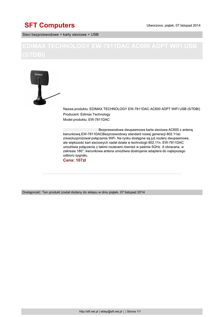 SFT Computers Utworzono: piątek, 07 listopad 2014 Sieci bezprzewodowe > karty sieciowe > USB EDIMAX TECHNOLOGY EW-7811DAC AC600 ADPT WIFI USB (5/7DBI) Nazwa produktu: EDIMAX TECHNOLOGY EW-7811DAC AC600 ADPT WIFI USB (5/7DBI) Producent: Edimax Technology Model produktu: EW-7811DAC Bezprzewodowa dwupasmowa karta sieciowa AC600 z anteną kierunkową EW-7811DACBezprzewodowy standard nowej generacji 802.11ac zrewolucjonizował połączenia WiFi. Na rynku dostępne są już routery dwupasmowe, ale większość kart sieciowych nadal działa w technologii 802.11n. EW-7811DAC umożliwia połączenie z takimi routerami również w paśmie 5GHz. A obracana, w zakresie 180°, kierunkowa antena umożliwia dostrojenie adaptera do najlepszego odbioru sygnału. Cena: 107zł Dostępność: Ten produkt został dodany do sklepu w dniu piątek, 07 listopad 2014 http://sft.net.pl | [email protected] | | Strona 1/1