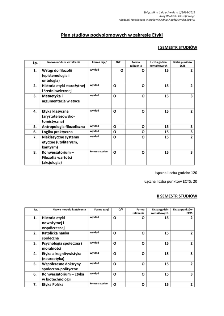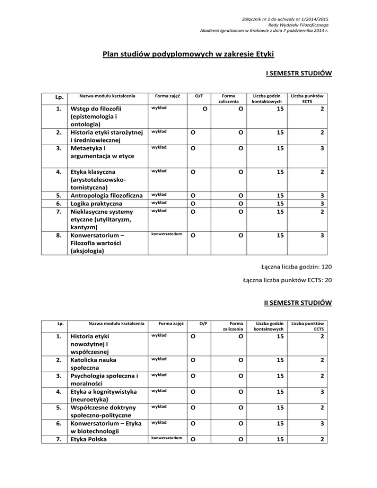 Załącznik nr 1 do uchwały nr 1/2014/2015 Rady Wydziału Filozoficznego Akademii Ignatianum w Krakowie z dnia 7 października 2014 r. Plan studiów podyplomowych w zakresie Etyki I SEMESTR STUDIÓW Lp. Nazwa modułu kształcenia 1. Wstęp do filozofii (epistemologia i ontologia) Historia etyki starożytnej i średniowiecznej Metaetyka i argumentacja w etyce wykład Etyka klasyczna (arystotelesowskotomistyczna) Antropologia filozoficzna Logika praktyczna Nieklasyczne systemy etyczne (utylitaryzm, kantyzm) Konwersatorium – Filozofia wartości (aksjologia) 2. 3. 4. 5. 6. 7. 8. Forma zajęć O/F O Forma zaliczenia Liczba godzin kontaktowych Liczba punktów ECTS O 15 2 wykład O O 15 2 wykład O O 15 3 wykład O O 15 2 wykład O O O O O O 15 15 15 3 3 2 O O 15 3 wykład wykład konwersatorium Łączna liczba godzin: 120 Łączna liczba punktów ECTS: 20 II SEMESTR STUDIÓW Lp. 1. 2. 3. 4. 5. 6. 7. Nazwa modułu kształcenia Historia etyki nowożytnej i współczesnej Katolicka nauka społeczna Psychologia społeczna i moralności Etyka a kognitywistyka (neuroetyka) Współczesne doktryny społeczno-polityczne Konwersatorium – Etyka w biotechnologii Etyka Polska Forma zajęć O/F Forma zaliczenia Liczba godzin kontaktowych Liczba punktów ECTS wykład O O 15 2 wykład O O 15 2 wykład O O 15 2 wykład O O 15 3 wykład O O 15 2 wykład O O 15 3 konwersatorium O O 15 2 8. 9. Dydaktyka etyki Praktyka dydaktyczna konwersatorium ćwiczenia O O O Z 30 3 30 3 Łączna liczba godzin: 165 Łączna liczba punktów ECTS: 22 III SEMESTR STUDIÓW Lp. 1. 2. 3. 4. 5. 6. 7. 8. 9. Nazwa modułu kształcenia Bioetyka (etyka lekarska) Etyka środowiskowa (ekofilozofia) Etyka społeczna i polityczna Etyka mediów i komunikacji społecznej Etyka biznesu i zarządzania Etyka a kultura i religie świata Dydaktyka etyki Konwersatorium – Etyka zawodu nauczyciela Praktyka dydaktyczna Forma zajęć wykład O/F Forma zaliczenia Liczba godzin kontaktowych Liczba punktów ECTS wykład O O O O 15 15 3 3 wykład O O 15 2 wykład O O 15 2 wykład O O 15 2 wykład O O 15 3 konwersatorium O O O O 30 15 3 3 O Z 30 3 konwersatorium ćwiczenia Łączna liczba godzin: 165 Łączna liczba punktów ECTS: 24