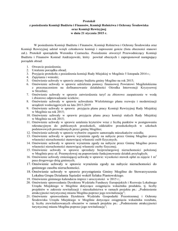 Protokół z posiedzenia Komisji Budżetu i Finansów, Komisji Rolnictwa i Ochrony Środowiska oraz Komisji Rewizyjnej w dniu 21 stycznia 2015 r. W posiedzeniu Komisji Budżetu i Finansów, Komisji Rolnictwa i Ochrony Środowiska oraz Komisji Rewizyjnej udział wzięli członkowie komisji i zaproszeni goście (lista obecności stanowi zał.). Protokół sporządziła Weronika Czarnecka. Posiedzenie otworzył Przewodniczący Komisji Budżetu i Finansów Konrad Andrzejewski, który powitał obecnych i zaproponował następujący porządek obrad: 1. 2. 3. 4. 5. 6. 7. 8. 9. 10. 11. 12. 13. 14. 15. 16. Otwarcie posiedzenia; Ustalenie porządku obrad; Przyjęcie protokołu z posiedzenia komisji Rady Miejskiej w Mogilnie 5 listopada 2014 r.; Zapytania i wnioski; Omówienie uchwały w sprawie zmiany budżetu gminy Mogilno na rok 2015; Omówienie uchwały w sprawie udzielenia pomocy finansowej Powiatowi Mogileńskiemu z przeznaczeniem na dofinansowanie działalności Ośrodka Interwencji Kryzysowej w Strzelnie; Omówienie uchwały w sprawie zatwierdzenia taryf za zbiorowe zaopatrzenie w wodę i zbiorowe odprowadzanie ścieków; Omówienie uchwały w sprawie uchwalenia Wieloletniego planu rozwoju i modernizacji urządzeń wodociągowych na lata 2015-2019 Omówienie uchwały w sprawie przyjęcia planu pracy Komisji Rewizyjnej Rady Miejskiej w Mogilnie na rok 2015; Omówienie uchwały w sprawie przyjęcia planu pracy komisji stałych Rady Miejskiej w Mogilnie na rok 2015; Omówienie uchwały w sprawie ustalenia kryteriów wraz z liczbą punktów w postępowaniu rekrutacyjnym do publicznych przedszkoli, oddziałów przedszkolnych w szkołach podstawowych prowadzonych przez gminę Mogilno; Omówienie uchwały w sprawie wyborów organów samorządu mieszkańców osiedla; Omówienie uchwały w sprawie wyrażenia zgody na nabycie przez Gminę Mogilno prawa własności nieruchomości stanowiącej własność osób fizycznych; Omówienie uchwały w sprawie wyrażenia zgody na nabycie przez Gminę Mogilno prawa własności nieruchomości stanowiącej własność osoby fizycznej; Omówienie uchwały w sprawie sprzedaży bezprzetargowej nieruchomości położonej w Mogilnie przy ul. Przemysłowej na poprawienie funkcjonowanie działek przyległych; Omówienie uchwały zmieniającej uchwałę w sprawie: wysokości stawek opłat za zajęcie 1 m2 pasa drogowego dróg gminnych; 17. Omówienie uchwały w sprawie wyrażenia zgody na nabycie nieruchomości do gminnego zasobu nieruchomości. 18. Omówienie uchwały w sprawie przystąpienia Gminy Mogilno do Stowarzyszenia Lokalna Grupa Działania Sąsiedzi wokół Szlaku Piastowskiego. 19. Omówienie gminnego kalendarza imprez i uroczystości w 2015 r.; 20. Omówienie sprawozdania Dyrektora Wydziału Funduszy Europejskich i Rozwoju Lokalnego Urzędu Miejskiego w Mogilnie dotyczące osiągnięcia wskaźnika produktu, tj. liczby projektów w zakresie rewitalizacji i mieszkalnictwa w ramach projektu pn.: „Podniesienie atrakcyjności turystycznej miasta Mogilna poprzez jego rewitalizację”; 21. Omówienie sprawozdania Dyrektora Wydziału Gospodarki Przestrzennej i Ochrony Środowiska Urzędu Miejskiego w Mogilnie dotyczące osiągnięcia wskaźnika rezultatu, tj. liczby zrewitalizowanych obszarów w ramach projektu pn.: „Podniesienie atrakcyjności turystycznej miasta Mogilna poprzez jego rewitalizację”; 22. Omówienie sprawozdania Dyrektora Wydziału Gospodarki Przestrzennej i Ochrony Środowiska Urzędu Miejskiego w Mogilnie dotyczące osiągnięcia wskaźnika rezultatu, tj. powierzchni obszarów poddanych rewitalizacji w ramach projektu pn. „Podniesienie atrakcyjności turystycznej miasta Mogilna poprzez jego rewitalizację”; 23. Zakończenie. Przewodniczący Konrad Andrzejewski zgłosił wniosek o rozszerzenie porządku obrad o punkt „Powołanie komisji doraźnej przez Radę Miejską w Mogilnie”. Radny wytłumaczył, że zadaniem komisji byłaby inwentaryzacja dróg gminnych i oświetlenia ulicznego. Dodał, że pomimo, że w ubiegłej kadencji Burmistrz Mogilna Leszek Duszyński nie szczędził środków na remonty dróg gminnych metodą powierzchniowego utrwalenia, tzw. duszyniówek, na dzień dzisiejszy nie wiadomo ile dróg pozostało do remontu. Zaproponował, by komisja składała się z 3 radnych, pracownika urzędu miejskiego, sołtysa z danego sołectwa oraz radnego z danego okręgu. Radni wyrazili akceptację zmiany porządku obrad komisji. W tym stanie prawnym Przewodniczący komisji przedstawił proponowany porządek obrad: 1. Otwarcie posiedzenia; 2. Ustalenie porządku obrad; 3. Przyjęcie protokołu z posiedzenia komisji Rady Miejskiej w Mogilnie 5 listopada 2014 r.; 4. Zapytania i wnioski; 5. Omówienie uchwały w sprawie zmiany budżetu gminy Mogilno na rok 2015; 6. Omówienie uchwały w sprawie udzielenia pomocy finansowej Powiatowi Mogileńskiemu z przeznaczeniem na dofinansowanie działalności Ośrodka Interwencji Kryzysowej w Strzelnie; 7. Omówienie uchwały w sprawie zatwierdzenia taryf za zbiorowe zaopatrzenie w wodę i zbiorowe odprowadzanie ścieków; 8. Omówienie uchwały w sprawie uchwalenia Wieloletniego planu rozwoju i modernizacji urządzeń wodociągowych na lata 2015-2019 9. Omówienie uchwały w sprawie przyjęcia planu pracy Komisji Rewizyjnej Rady Miejskiej w Mogilnie na rok 2015; 10. Omówienie uchwały w sprawie przyjęcia planu pracy komisji stałych Rady Miejskiej w Mogilnie na rok 2015; 11. Omówienie uchwały w sprawie ustalenia kryteriów wraz z liczbą punktów w postępowaniu rekrutacyjnym do publicznych przedszkoli, oddziałów przedszkolnych w szkołach podstawowych prowadzonych przez gminę Mogilno; 12. Omówienie uchwały w sprawie wyborów organów samorządu mieszkańców osiedla; 13. Omówienie uchwały w sprawie wyrażenia zgody na nabycie przez Gminę Mogilno prawa własności nieruchomości stanowiącej własność osób fizycznych; 14. Omówienie uchwały w sprawie wyrażenia zgody na nabycie p