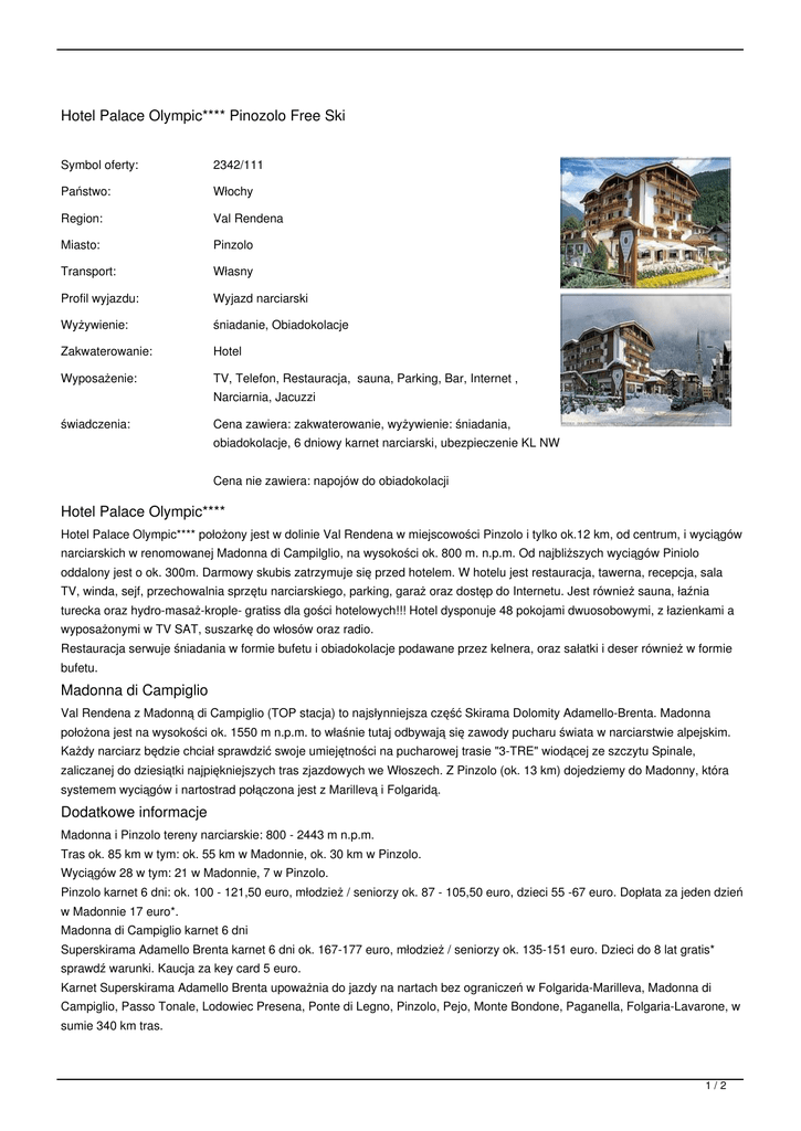 Hotel Palace Olympic**** Pinozolo Free Ski Symbol oferty: 2342/111 Państwo: Włochy Region: Val Rendena Miasto: Pinzolo Transport: Własny Profil wyjazdu: Wyjazd narciarski Wyżywienie: śniadanie, Obiadokolacje Zakwaterowanie: Hotel Wyposażenie: TV, Telefon, Restauracja, sauna, Parking, Bar, Internet , świadczenia: Cena zawiera: zakwaterowanie, wyżywienie: śniadania, Narciarnia, Jacuzzi obiadokolacje, 6 dniowy karnet narciarski, ubezpieczenie KL NW Cena nie zawiera: napojów do obiadokolacji Hotel Palace Olympic**** Hotel Palace Olympic**** położony jest w dolinie Val Rendena w miejscowości Pinzolo i tylko ok.12 km, od centrum, i wyciągów narciarskich w renomowanej Madonna di Campilglio, na wysokości ok. 800 m. n.p.m. Od najbliższych wyciągów Piniolo oddalony jest o ok. 300m. Darmowy skubis zatrzymuje się przed hotelem. W hotelu jest restauracja, tawerna, recepcja, sala TV, winda, sejf, przechowalnia sprzętu narciarskiego, parking, garaż oraz dostęp do Internetu. Jest również sauna, łaźnia turecka oraz hydro-masaż-krople- gratiss dla gości hotelowych!!! Hotel dysponuje 48 pokojami dwuosobowymi, z łazienkami a wyposażonymi w TV SAT, suszarkę do włosów oraz radio. Restauracja serwuje śniadania w formie bufetu i obiadokolacje podawane przez kelnera, oraz sałatki i deser również w formie bufetu. Madonna di Campiglio Val Rendena z Madonną di Campiglio (TOP stacja) to najsłynniejsza część Skirama Dolomity Adamello-Brenta. Madonna położona jest na wysokości ok. 1550 m n.p.m. to właśnie tutaj odbywają się zawody pucharu świata w narciarstwie alpejskim. Każdy narciarz będzie chciał sprawdzić swoje umiejętności na pucharowej trasie "3-TRE" wiodącej ze szczytu Spinale, zaliczanej do dziesiątki najpiękniejszych tras zjazdowych we Włoszech. Z Pinzolo (ok. 13 km) dojedziemy do Madonny, która systemem wyciągów i nartostrad połączona jest z Marillevą i Folgaridą. Dodatkowe informacje Madonna i Pinzolo tereny narciarskie: 800 - 2443 m n.p.m. Tras ok. 85 km w tym: ok. 55 km w Madonnie, ok. 30 km w Pinzolo. Wyciągów 28 w tym: 21 w Madonnie, 7 w Pinzolo. Pinzolo karnet 6 dni: ok. 100 - 121,50 euro, młodzież / seniorzy ok. 87 - 105,50 euro, dzieci 55 -67 euro. Dopłata za jeden dzień w Madonnie 17 euro*. Madonna di Campiglio karnet 6 dni Superskirama Adamello Brenta karnet 6 dni ok. 167-177 euro, młodzież / seniorzy ok. 135-151 euro. Dzieci do 8 lat gratis* sprawdź warunki. Kaucja za key card 5 euro. Karnet Superskirama Adamello Brenta upoważnia do jazdy na nartach bez ograniczeń w Folgarida-Marilleva, Madonna di Campiglio, Passo Tonale, Lodowiec Presena, Ponte di Legno, Pinzolo, Pejo, Monte Bondone, Paganella, Folgaria-Lavarone, w sumie 340 km tras. 1/2 Przykładowy dojazd Z Cieszyna: drogą na Olomouc, E 462 na Brno, 52/E 461 na Wiedeń przez Mikulov, A1 na Linz, Salzburg, A12 na Innsbruck, A13/A22 przez przełęcz Brenner, na Bolzano i dalej zjazd z autostrady w miejscowości S. Michele Mezzocorona następnie Cles, Male i zjazd w Dimaro N239 na Madonnę i Pinzolo. Razem ok. 1040 km. Z Kudowy: 11/E67 na Pragę, 5/E50 na Plznen, 93 na Monachium, autostradą na Innsbruck, A13/A22 przez przełęcz Brenner i dalej jw. Jako drugi wariant można wybrać drogę z Pragi na Linz i dalej jak "Z Cieszyna". Razem ok. 940 km. Lotniska: Bergamo ok. 180 km, Wenecja ok. 250 km, Mediolan ok. 230 km, Bolzano ok. 105 km. Uwaga Miejsca w tym obiekcie mamy na zapytanie. W celu sprawdzenia dostępności miejsc proszę o wypełnienie rezerwacji wstępnej. Na podstawie tej rezerwacji będzie wysłane zapytanie do kontrahenta o dostępności miejsc, w przypadku braku wolnych pokoi zostanie Państwu zaproponowany inny obiekt o zbliżonym standardzie i cenie. Rezerwacja wstępna jest bezkosztowa i nie zobowiązuje Państwa do zakupu. TERMINY: od: 2017-11-26 do: 2017-12-03 (8 dni), miejsca: zamów cena od: 1572 PLN CENNIK: Długość pobytu: 8 dni Grupa cenowa: A Pobyt w obiekcie (do wyboru) (*) Pokój dwuosobowy - duże łóżko standardowo dla osób: 2 Ubezpieczenie (do wyboru) (*) ubezpieczenie NW KL Rodzaj osoby (do wyboru) (*) osoba dorosła Ubezpieczenie (opcjonalne) ubezpieczenie - od kosztów rezygnacji ubezpieczenie NWKL + SKI (-) 7 1565 2.4 % 15 Waluta: PLN Aktualne ceny z systemu S.A.R.T. (-) - cena usługi, podatku kalkulowana przy osobie lub gratis (*) - kwota wliczona w cenę standardową 2/2