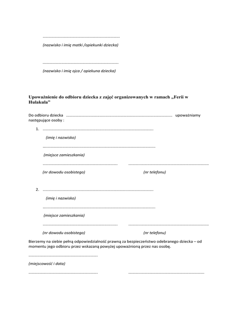 ..................................................................... (nazwisko i imię matki /opiekunki dziecka) .................................................................... (nazwisko i imię ojca / opiekuna dziecka) Upoważnienie do odbioru dziecka z zajęć organizowanych w ramach „Ferii w Hulakula” Do odbioru dziecka ............................................................................................... upoważniamy następujące osoby : 1. ................................................................................................... (imię i nazwisko) ….................................................................................................. (miejsce zamieszkania) ................................................................... (nr dowodu osobistego) ........................................................................ (nr telefonu) 2. ................................................................................................... (imię i nazwisko) ….................................................................................................. (miejsce zamieszkania) ................................................................... (nr dowodu osobistego) ........................................................................ (nr telefonu) Bierzemy na siebie pełną odpowiedzialność prawną za bezpieczeństwo odebranego dziecka – od momentu jego odbioru przez wskazaną powyżej upoważnioną przez nas osobę. .............................................................. (miejscowość i data) .............................................................. .................................................................... (podpis matki /opiekunki dziecka) (podpis ojca / opiekuna dziecka)