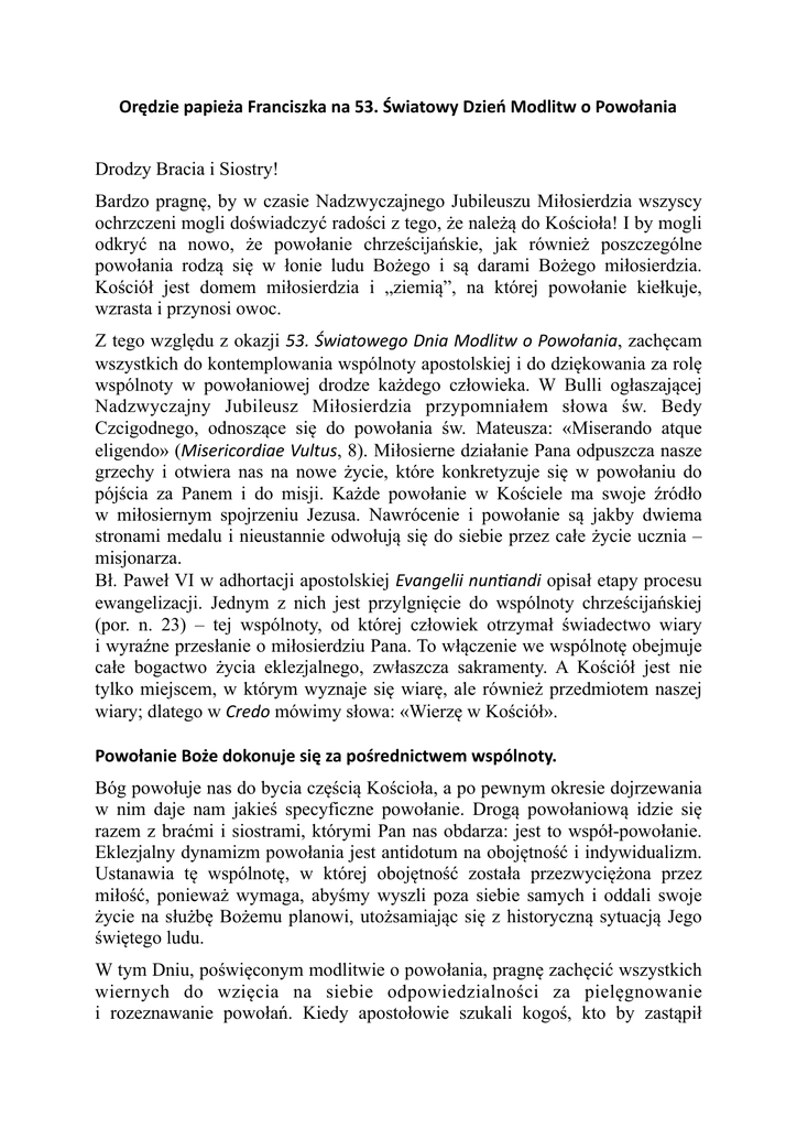 OrędziepapieżaFranciszkana53.ŚwiatowyDzieńModlitwoPowołania Drodzy Bracia i Siostry! Bardzo pragnę, by w czasie Nadzwyczajnego Jubileuszu Miłosierdzia wszyscy ochrzczeni mogli doświadczyć radości z tego, że należą do Kościoła! I by mogli odkryć na nowo, że powołanie chrześcijańskie, jak również poszczególne powołania rodzą się w łonie ludu Bożego i są darami Bożego miłosierdzia. Kościół jest domem miłosierdzia i „ziemią”, na której powołanie kiełkuje, wzrasta i przynosi owoc. Z tego względu z okazji 53.ŚwiatowegoDniaModlitwoPowołania, zachęcam wszystkich do kontemplowania wspólnoty apostolskiej i do dziękowania za rolę wspólnoty w powołaniowej drodze każdego człowieka. W Bulli ogłaszającej Nadzwyczajny Jubileusz Miłosierdzia przypomniałem słowa św. Bedy Czcigodnego, odnoszące się do powołania św. Mateusza: «Miserando atque eligendo» (MisericordiaeVultus, 8). Miłosierne działanie Pana odpuszcza nasze grzechy i otwiera nas na nowe życie, które konkretyzuje się w powołaniu do pójścia za Panem i do misji. Każde powołanie w Kościele ma swoje źródło w miłosiernym spojrzeniu Jezusa. Nawrócenie i powołanie są jakby dwiema stronami medalu i nieustannie odwołują się do siebie przez całe życie ucznia – misjonarza. Bł. Paweł VI w adhortacji apostolskiej Evangeliinun;andi opisał etapy procesu ewangelizacji. Jednym z nich jest przylgnięcie do wspólnoty chrześcijańskiej (por. n. 23) – tej wspólnoty, od której człowiek otrzymał świadectwo wiary i wyraźne przesłanie o miłosierdziu Pana. To włączenie we wspólnotę obejmuje całe bogactwo życia eklezjalnego, zwłaszcza sakramenty. A Kościół jest nie tylko miejscem, w którym wyznaje się wiarę, ale również przedmiotem naszej wiary; dlatego w Credo mówimy słowa: «Wierzę w Kościół». PowołanieBożedokonujesięzapośrednictwemwspólnoty. Bóg powołuje nas do bycia częścią Kościoła, a po pewnym okresie dojrzewania w nim daje nam jakieś specyficzne powołanie. Drogą powołaniową idzie się razem z braćmi i siostrami, którymi Pan nas obdarza: jest to współ-powołanie. Eklezjalny dynamizm powołania jest antidotum na obojętność i indywidualizm. Ustanawia tę wspólnotę, w której obojętność została przezwyciężona przez miłość, ponieważ wymaga, abyśmy wyszli poza siebie samych i oddali swoje życie na służbę Bożemu planowi, utożsamiając się z historyczną sytuacją Jego świętego ludu. W tym Dniu, poświęconym modlitwie o powołania, pragnę zachęcić wszystkich wiernych do wzięcia na siebie odpowiedzialności za pielęgnowanie i rozeznawanie powołań. Kiedy apostołowie szukali kogoś, kto by zastąpił Judasza Iskariotę, św. Piotr zgromadził stu dwudziestu braci (por. Dz 1, 15); a gdy trzeba było wybrać siedmiu diakonów, zwołano grupę uczniów (por. Dz 6, 2). Św. Paweł wskazuje Tytusowi precyzyjne kryteria wyboru prezbiterów (por. Tt 1, 5-9). Również dzisiaj wspólnota chrześcijańska jest zawsze obecna, gdy rodzą się powołania, w czasie ich kształtowania się i ich trwania (por. adhort. apost. Evangeliigaudium, 107). PowołanierodzisięwKościele. Od chwili pojawienia się powołania potrzebny jest odpowiedni „zmysł” Kościoła. Nikt nie jest powołany wyłącznie dla jakiegoś określonego regionu ani dla jakiejś grupy czy ruchu kościelnego, ale dla Kościoła i dla świata. «Jasnym znakiem autentyczności jakiegoś charyzmatu jest jego eklezjalność, jego zdolność do harmonijnego włączenia się w życie świętego Ludu Bożego dla dobra wszystkich» (tamże, 130). Odpowiadając na Boże powołanie, młody człowiek widzi, jak poszerza się jego postrzeganie Kościoła, może lepiej rozważyć rozliczne charyzmaty i tym samym dokonać bardziej obiektywnego rozeznania. W ten sposób wspólnota staje się domem i rodziną, gdzie rodzi się powołanie. Kandydat z wdzięcznością przyjmuje tę mediację wspólnoty, traktując ją jako element nieodzowny dla jego przyszłości; uczy się poznawać i kochać braci i siostry, którzy idą innymi niż jego drogami, a powstałe więzi umacniają we wszystkich ducha wspólnoty. PowołaniewzrastawKościele. W czasie procesu formacji kandydaci mający różne powołania winni coraz lepiej poznawać wspólnotę eklezjalną, przezwyciężając ograniczoną wizję, jaką wszyscy mamy na początku. W tym celu przydatne jest jakieś doświadczenie pracy apostolskiej razem z innymi członkami wspólnoty, na przykład: głoszenie przesłania chrześcijańskiego u boku dobrego katechisty; ewangelizowanie peryferii razem z jakąś wspólnotą religijną; odkrywanie skarbu kontemplacji w doświadczeniu życia klauzurowego; lepsze poznanie misji ad gentes w kontakcie z misjonarzami; głębsze poznanie duszpasterstwa w parafii i diecezji wraz z księżmi diecezjalnymi. Dla tych, którzy już odbywają formację, wspólnota eklezjalna zawsze pozostaje podstawowym środowiskiem formacyjnym, wobec którego odczuwają wdzięczność. PowołaniejestwspieraneprzezKościół. Po dokonaniu zasadniczego wyboru droga powołaniowa w Kościele nie kończy się, lecz realizuje się w dyspozycyjności do służby, w wytrwałości i w formacji permanentnej. Ten kto poświęcił własne życie Panu, jest gotowy służyć Kościołowi tam, gdzie on tego potrzebuje. Misja Pawła i Barnaby jest przykładem tej eklezjalnej dyspozycyjności. Posłani na misje przez Ducha Świętego i przez wspólnotę Antiochii (por. Dz 13, 1-4), powrócili do tej samej wspólnoty i opowiedzieli o tym, co Pan przez nich zdziałał (por. Dz 14, 27). Misjonarzom towarzyszy i wspiera ich wspólnota chrześcijańska, która jest życiowym punktem odniesienia, niczym widzialna ojczyzna, która zapewnia bezpieczeństwo tym, którzy pielgrzymują ku życiu wiecznemu. Pośród zaangażowanych w duszpasterstwo szczególną rolę odgrywają księża. Poprzez ich posługę uobecnia się 