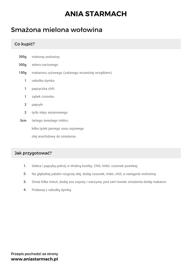 ANIA STARMACH Smażona mielona wołowina Co kupić? 300g mielonej wołowiny 300g selera naciowego 100g makaronu ryżowego (zalanego wcześniej wrzątkiem) 1 cebulka dymka 1 papryczka chili 1 ząbek czosnku 2 papryki 2 łyżki oleju sezamowego 3cm tartego świeżego imbiru kilka łyżek jasnego sosu sojowego olej arachidowy do smażenia Jak przygotować? 1. Selera i paprykę pokrój w drobną kostkę. Chili, imbir, czosnek posiekaj. 2. Na głębokiej patelni rozgrzej olej, dodaj czosnek, imbir, chili, a następnie wołowinę. 3. Smaż kilka minut, dodaj sos sojowy i warzywa, pod sam koniec smażenia dodaj makaron. 4. Podawaj z cebulką dymką. Przepis pochodzi ze strony www.aniastarmach.pl