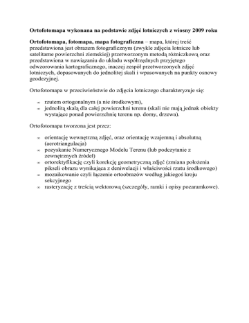 Ortofotomapa wykonana na podstawie zdjęć lotniczych z wiosny 2009 roku Ortofotomapa, fotomapa, mapa fotograficzna – mapa, której treść przedstawiona jest obrazem fotograficznym (zwykle zdjęcia lotnicze lub satelitarne powierzchni ziemskiej) przetworzonym metodą różniczkową oraz przedstawiona w nawiązaniu do układu współrzędnych przyjętego odwzorowania kartograficznego, inaczej zespół przetworzonych zdjęć lotniczych, dopasowanych do jednolitej skali i wpasowanych na punkty osnowy geodezyjnej. Ortofotomapa w przeciwieństwie do zdjęcia lotniczego charakteryzuje się: • • rzutem ortogonalnym (a nie środkowym), jednolitą skalą dla całej powierzchni terenu (skali nie mają jednak obiekty wystające ponad powierzchnię terenu np. domy, drzewa). Ortofotomapa tworzona jest przez: • • • • • orientację wewnętrzną zdjęć, oraz orientację wzajemną i absolutną (aerotriangulacja) pozyskanie Numerycznego Modelu Terenu (lub podczytanie z zewnętrznych źródeł) ortorektyfikację czyli korekcję geometryczną zdjęć (zmiana położenia pikseli obrazu wynikająca z deniwelacji i właściwości rzutu środkowego) mozaikowanie czyli łączenie ortoobrazów według jakiegoś kroju sekcyjnego rasteryzację z treścią wektorową (szczegóły, ramki i opisy pozaramkowe).