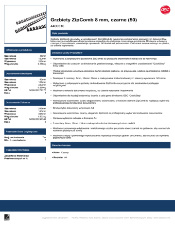 Grzbiety ZipComb 8 mm, czarne (50) 4400316 Opis produktu Grzbiety ZipComb do uzytku w urzadzeniach CombBind do tworzenia profesjonalnie oprawionych dokumentów, które mozna modyfikowac dzieki prostemu narzedziu do otwierania i zamykania grzebienia. Dostepne w kolorze czarnym i 3 rozmiarach, umozliwiaja oprawe do 145 kartek A4 jednorazowo. Dokument mozna rozlozyc na plasko, co ulatwia kopiowanie. Informacje o produkcie Unikalne Cechy Produktów Szerokosc Szerokosc Wysokosc Waga brutto 45mm 120mm 325mm 0.186kg • Odpowiednie do urzadzen do bindowania grzebieniowego, wlacznie z wszystkimi urzadzeniami "QuickStep" firmy GBC • Plaska konstrukcja umozliwia obracanie kartek dookola grzbietu, co przyspiesza i ulatwia sporzadzanie notatek i kserokopii Opakowanie Detaliczne Szerokosc Szerokosc Wysokosc Waga brutto UPC# Ilosc • Wykonane z polipropylenu grzebienie ZipCombs sa przyjazne srodowisku i nadaja sie do recyklingu 43mm 121mm 320mm 0.259kg 5028252277273 1 • Dostepne 3 rozmiary: 8mm, 12mm i 16mm z maksymalna liczba bindowanych arkuszy wynoszaca 145 stron • Wykonane z polipropylenu grzbiety do bindowania ZipCombs sa przyjazne dla srodowiska i podlegaja recyklingowi • Mozliwosc otwarcia dokumentu na plasko, co ulatwia notowanie i kopiowanie • Odpowiednie dla kazdej bindownicy lacznie z cala gama bindownic GBC ‘QuickStep’ • Nowoczesne wzornictwo: dzieki eleganckiemu wykonczeniu w kolorze czarnym ZipComb to najlepszy wybór dla profesjonalnego bindowania dokumentów Opakowanie Zbiorcze Szerokosc Szerokosc Wysokosc Waga brutto UPC# Ilosc 243mm 140mm 365mm 1.602kg 5028252291392 5 • Nowoczesne wzornictwo: czarny, elegancki ZipComb to profesjonalny wybór do bindowania dokumentów • Oprawia wylacznie arkusze o formacie A4 • 3 rozmiary: 8mm, 12mm i 16mm maksymalna liczba bindowanych stron do145 • Mozliwosc ponownego edytowania i wielokrotnego uzytku: po prostu otwórz zamek na grzbiecie, aby usunac lub wymienic pojedyncze strony Pozostale Dane Logistyczne Kraj pochodzenia Min. il. zamówienia • Binduje tylko dokumenty w formacie A4 TW 5 • Mozliwosc edycji i powtórnego wykorzystania: wystarczy otworzyc grzbiet dokumentu, aby usunac lub wymienic pojedyncze kartki Dane techniczne Pozostale Informacje • Kolor Czarny Zawartosc Materialow Przetworzonych w % 0 • Rozmiar A4 Wyprodukowano 05/05/2014 Poufne. Wlasnosc Acco Brands. Zdjecia sluza wylacznie celom demonstracyjnym. Bledy i braki zastrzezone.