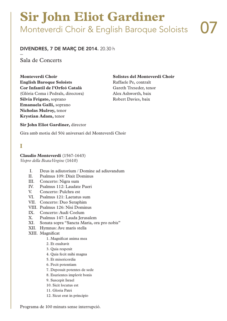 Sir John Eliot Gardiner Monteverdi Choir & English Baroque Soloists Divendres, 7 dE MARÇ de 2014. 20.30 h – Sala de Concerts Monteverdi Choir English Baroque Soloists Cor Infantil de l’Orfeó Català (Glòria Coma i Pedrals, directora) Silvia Frigato, soprano Emanuela Galli, soprano Nicholas Mulroy, tenor Krystian Adam, tenor Solistes del Monteverdi Choir Raffaele Pe, contralt Gareth Treseder, tenor Alex Ashworth, baix Robert Davies, baix Sir John Eliot Gardiner, director Gira amb motiu del 50è aniversari del Monteverdi Choir I Claudio Monteverdi (1567-1643) Vespro della Beata Vergine (1610) I. Deus in adiutorium / Domine ad adiuvandum II. Psalmus 109: Dixit Dominus III. Concerto: Nigra sum IV. Psalmus 112: Laudate Pueri V. Concerto: Pulchra est VI. Psalmus 121: Laetatus sum VII. Concerto: Duo Seraphim VIII. Psalmus 126: Nisi Dominus IX. Concerto: Audi Coelum X. Psalmus 147: Lauda Jerusalem XI. Sonata sopra “Sancta Maria, ora pro nobis” XII. Hymnus: Ave maris stella XIII. Magnificat 1. Magnificat anima mea 2. Et exultavit 3. Quia respexit 4. Quia fecit mihi magna 5. Et misericordia 6. Fecit potentiam 7. Deposuit potentes de sede 8. Esurientes implevit bonis 9. Suscepit Israel 10. Sicit locutus est 11. Gloria Patri 12. Sicut erat in principio Programa de 100 minuts sense interrupció. 07 Tots sou part del Palau Gràcies! Mecenes Protectors Mecenes d’Honor Media Partners Col·laboradors Aena — Aenor — Almirall, S.A. — Armand Basi, S.L. — Autoritat Portuària de Barcelona — Bagués-Masriera Joiers — Coca-Cola — Col·legi de Farmacèutics de Barcelona — Col·legi d’Enginyers de Camins, Canals i Ports — Deloitte — Esteve — Fundació Antigues Caixes Catalanes — Fluidra, S.A. — Fundació Castell de Peralada — Fundació Puigvert — Hoteles Catalonia — HP — Loteria de Catalunya — Memora — Nestlé España, S.A. — Quadis — Reial Automòbil Club de Catalunya — Roca Junyent, S.L.P. — Selmar, S.A. Amics Benefactors Ascensores Jordà, S.A. — Clos Interiors, S.L. — Dalkia Catalunya, S.A. — Eurofirms ETT S.L.U. — Fundació Antoni Serra Santamans — Horaci Miras Giner — Teatre Romea Les Vespres de fa cinquanta anys i avui L’any 1610 es va publicar a Venècia un imponent volum de música sacra italiana en honor de la Verge Maria, amb música de Claudio Monteverdi, que aleshores treballava (no del tot feliçment) al servei dels ducs de Gonzaga a Màntua i que era conegut com a compositor d’innovadors madrigals i òperes. El volum comença amb un bell arranjament de sis parts a cappella, lleument antiquat, de la Missa cantada a la Capella Sixtina, que podria contribuir a explicar-ne la dedicació al papa Pau V. Continua amb la brillant seqüència de cinc salms vespertins després de la invocació inicial, intercalats amb motets captivadors per a veus solistes, una sonata, un himne i un arranjament de set parts del Magnificat –que és exactament el que interpretarem avui. A principi del segle xvii, gràcies a les campanyes evangèliques dels nous ordes religiosos catòlics, el servei de les vespres havia esdevingut una cerimònia de gran importància musical a Itàlia, àdhuc superant la missa quant a esplendor musical i nombre de publicacions. Els últims seixanta anys, musicòlegs i intèrprets no s’han posat d’acord sobre el contingut de la música que Monteverdi va incloure amb el títol de Vespro della Beata Vergine da concerto, composta sopra canti fermi. Què s’hauria d’incloure en la interpretació i en quin ordre? ¿És només una compilació a l’atzar o podem dir que es tracta d’una “obra” unificada? En aquest cas, ¿és realment una única peça musical consistent, o va sorgir més per accident que no pas de manera intencionada? Els acadèmics hi estan dividits: alguns diuen que no, d’altres diuen que sí, però tots es basen en la pràctica litúrgica per reafirmar o argumentar la seva posició. Proliferen diferents hipòtesis sobre com s’hauria d’interpretar aquesta música, algunes de les quals tan ben argumentades que allò que comença com una teoria esdevé ràpidament una veritat gairebé absoluta i aviat assoleix l’estatus de nova ortodòxia. Pot resultar desconcertant, però afortunadament tots els camins duen a Roma. L’any 1964, quan jo estudiava al King’s College, la música de Monteverdi era àmpliament desconeguda al Regne Unit. Ray Leppard començava a introduir en el públic del Festival de Glyndebourne l’esplendor de les seves òperes, però les interpretacions de les Vespres eren extraordinàriament inhabituals. Quan encara era un adolescent n’havia escoltat una emissió de la BBC des de la catedral de York amb cors de missa i l’Orquestra Simfònica de Londres dirigida per Walter Goehr. Recordo que la grandesa de la música em va captivar completament –era molt diferent de tot que el havia sentit abans; eloqüent i apassionada, però amb l’estil grandiloqüent propi del segle xix. Vaig començar a cultivar una idea, en un principi vagament formulada: si en tingués ocasió, com es podria bregar amb aquesta música prodigiosament complexa i exigent, com es podria començar a fer justícia a aquesta gloriosa música italiana del Seicento, amb quines forces, quines veus, quins instruments, com i on es podria interpretar i amb quin desplegament; i finalment, com es podria pagar? (Hi ha coses que no canvien...) Aleshores jo era secretari de la societat musical de la facultat. ¿Podria convèncer les autoritats perquè em permetessin provar d’interpretar i dirigir l’obra –i fer-ho a la seva famosa capella? El repte era immens, però vaig tenir la gran sort de començar amb un tutor meravellosament comprensiu, l’antropòleg Edmund Leach (que més endavant va esdevenir rector del King’s College), que em va atorgar una excedència d’un any del “Tripos” d’Història per preparar aquesta tasca. Tot i que jo havia dirigit cors des dels quinze anys, no havia intent